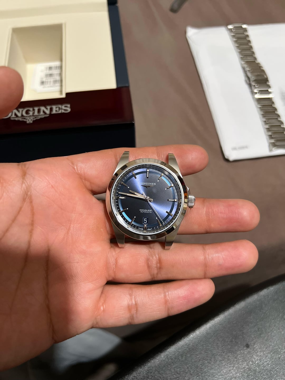 Longines conquest 38mm blue, it only has hair light scratches on the side of the watch, and some around the bezel not very visible. Selling this watch for 1300 shipped,
