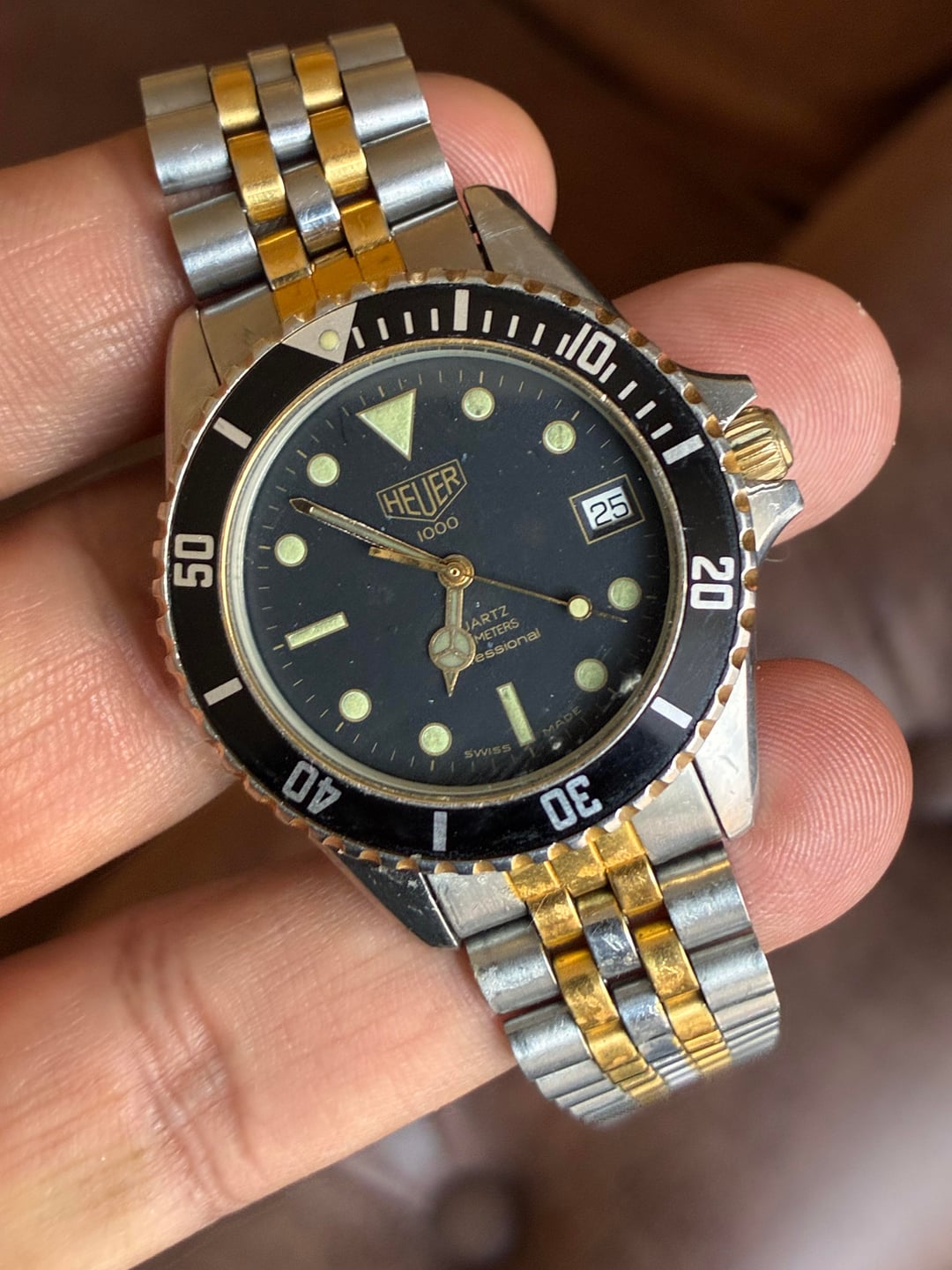 Offering my Huer 1000 18k gold plated and stainless steel Quartz 37.5mm case Bracelet full ( showing the tag Heuer stamp) I’ve owned this for many years it’s unpolished looking for 850 shipped ! Wolf or kinda Wall Street :) Zelle Venmo wire