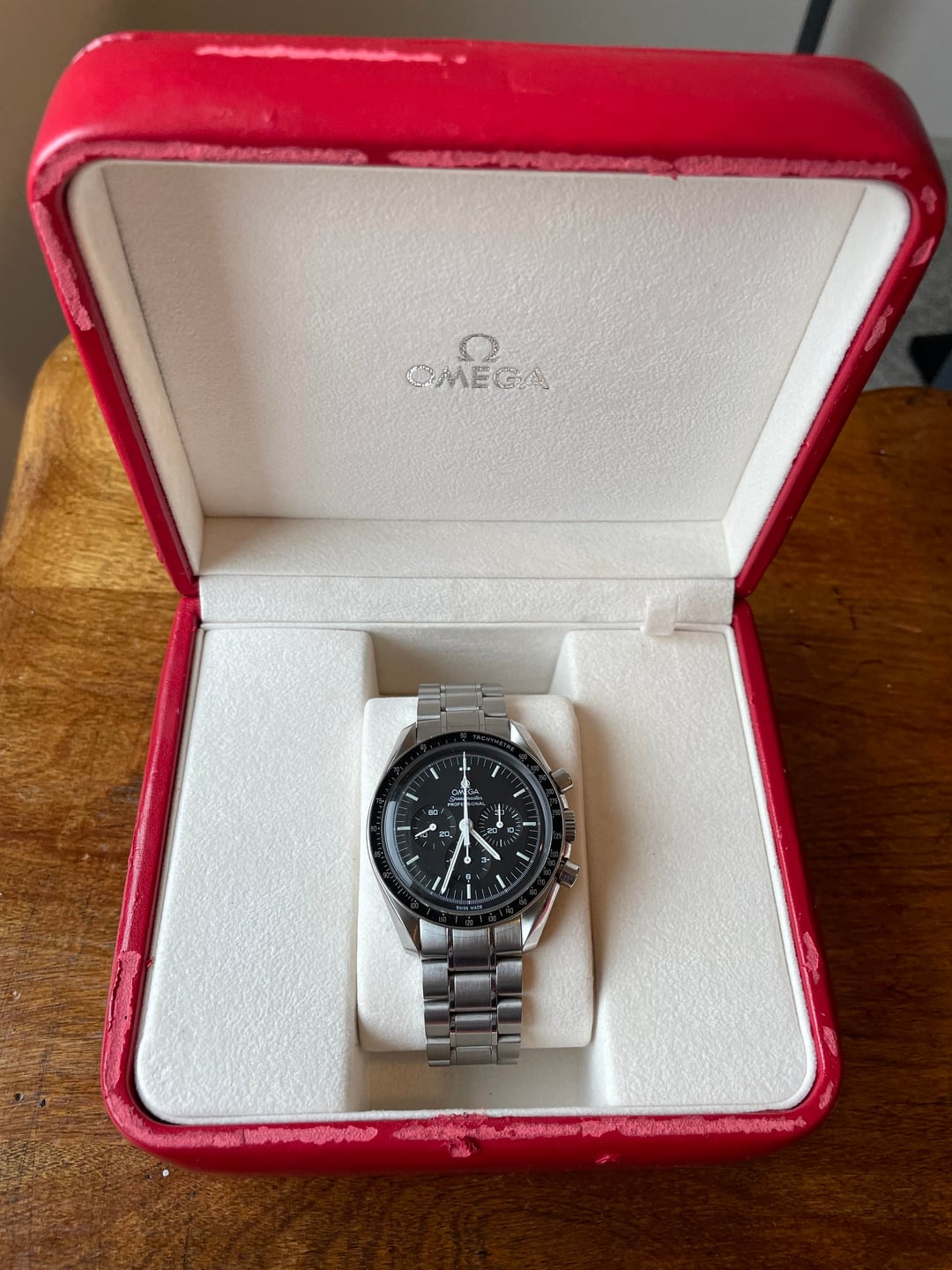 For sale is my personal 3570 that I bought used from DavidSW in 2013. Album: [http://imgur.com/a/SyFuE](http://imgur.com/a/SyFuE) Price: $4250 shipped (2-day insured in continental US) via Paypal, Zelle, or Venmo **Description** Omega Ref: 3570.50 Material: Stainless Steel Crystal(s): Hesalite Movement: 1861 Diameter: 42mm **Accessories**: Inner/Outer Box, Card holder, warranty card, pictogram card, manual, serial tag, hang tags, half link **Condition**: Movement: Runs strong and all functions work as should Bezel: Overall very good condition. Bracelet**:** Minor marks on bracelet from wearing it at my desk. Minor scratches on back of case from removing bracelet. Very good condition. **Sizing**: half link is installed. 3 links were removed for sizing and provided with sale. **Service**: Serviced by Nesbit Watch Service in 2023. Nesbit did not polish the case so any original marks are still there. Bracelet was very lightly polished. Can provide documentation upon request.