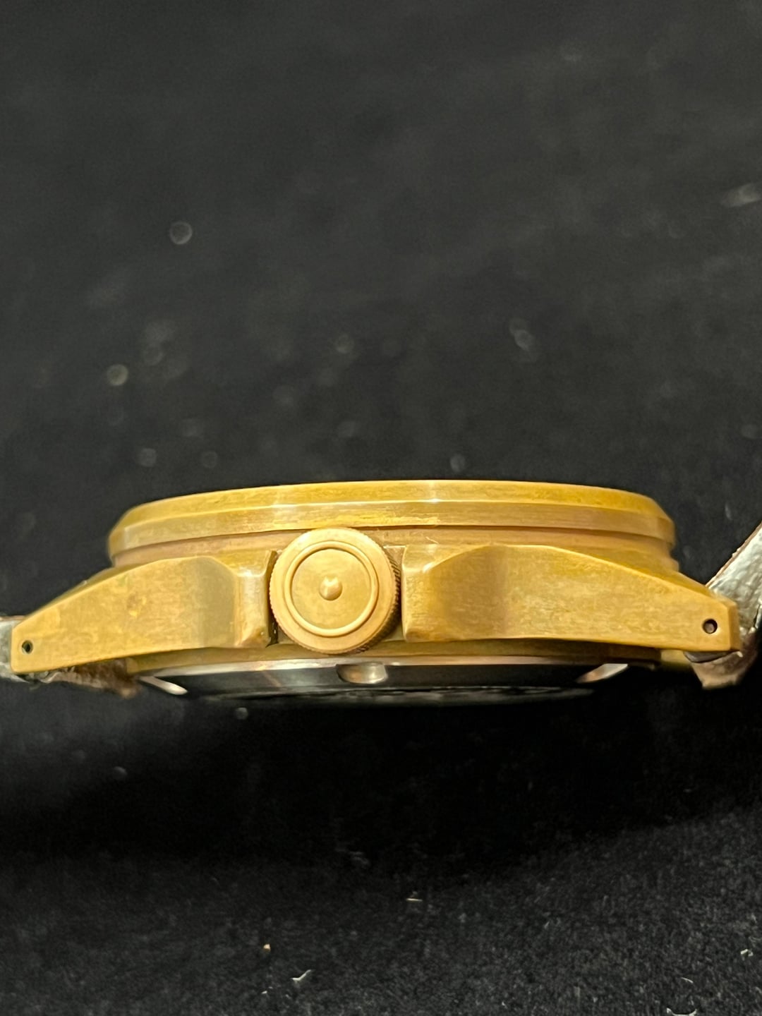 Hi WatchEx! Listing my limited edition Unimatic bronze diver. Comes with full kit, pelican style ammo case, OEM leather strap and rubber strap (both with bronze Unimatic pin-buckles). Watch has developed a rich patina which can be left to develop or acid washed to bring back luster. In overall great shape with minimal wear. UNIMATIC U4S-BRZ-ML Limited to 400 pieces (individually numbered) Caliber: Sellita SW200-1 Case: 40mm full bronze Straps: TPU rubber in olive green with a bronze buckle, and a distressed leather strap, also with a bronze buckle. Watch and kit offered shipped CONUS for $995 Due to my PayPal getting hacked, payment will only be accepted through Zelle or wire transfer. This is an unfortunate reality and I’m sorry for any inconvenience. Happy to show any listed watch on a video call or send more high-res closeup pics on request. I’m an avid collector who loves talking watches so don’t hesitate to reach out!