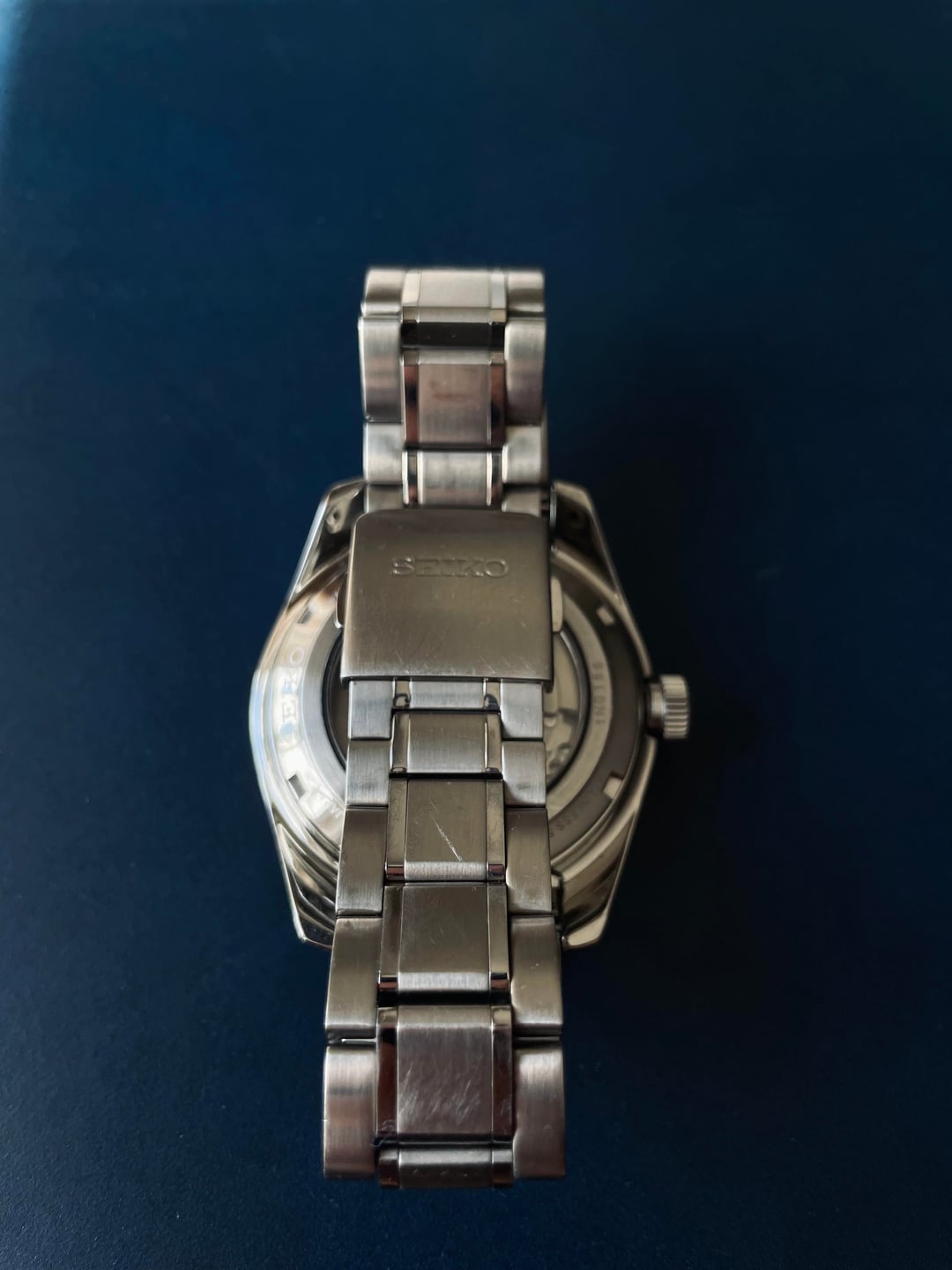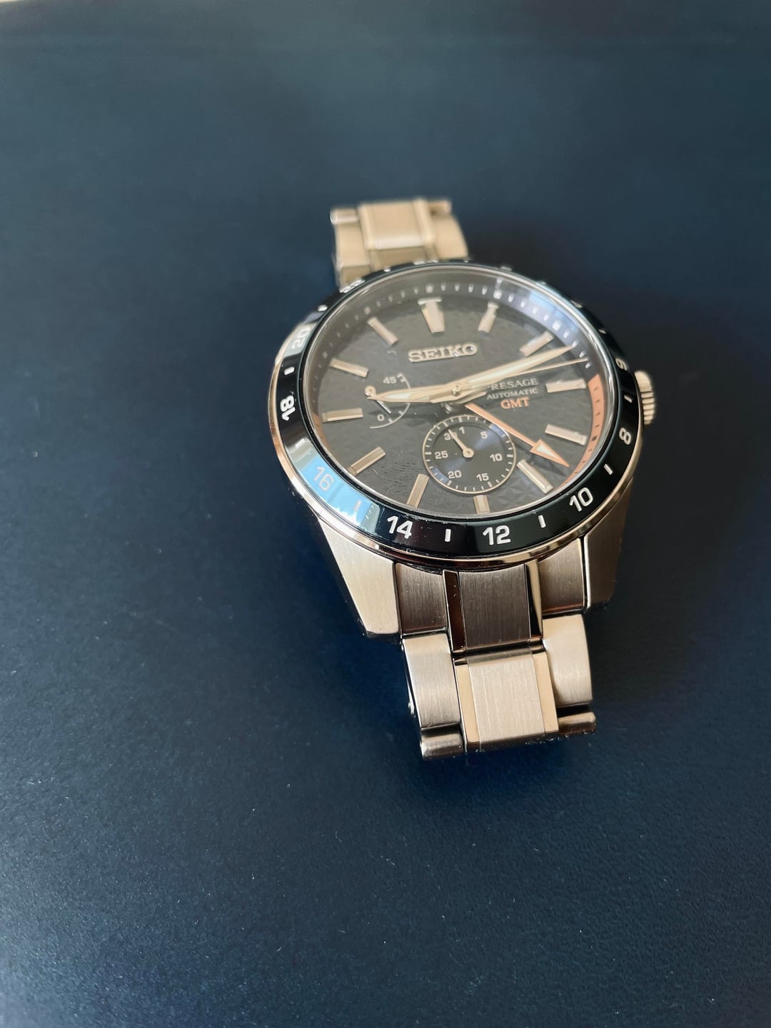 Selling my Seiko Presage Sharp Edge GMT with original box and papers, plus extra links. Price $650 including free shipping within the US. Specifications: Movement type: Manual winding Automatic winding Accuracy: +25 to -15 seconds per day Power Reserve: Approximately 45 hours Case material: Stainless steel Crystal: Sapphire crystal Crystal coating: Anti-reflective coating on the inner surface LumiBrite: Lumibrite on hands and indexes Clasp: Tri-fold clasp with push button release Water resistance: 10 bar Thickness: 13.7mm Case Diameter: 42.2mm Lug to lug: 49.2mm Condition: Movement functions as specified since the day I received it. Some minor scratching on the bezel and down side of the bracelet.