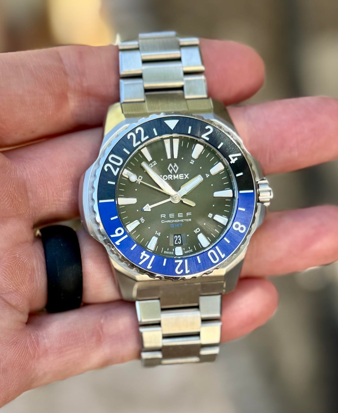 Up for sale is my Formex Reef GMT “Batman” (black & blue bezel) in excellent condition. It’s a full kit with the original stainless steel bracelet plus the OEM Formex rubber strap with deployant clasp. This combo gives you the best of both worlds — sport and comfort. The watch shows only light normal wear, while the bezel, crystal, and dial are flawless. Everything functions perfectly. Specs: • Model: Formex Reef GMT “Batman” • Case: 42mm stainless steel • Movement: COSC-certified Sellita SW330-2 automatic GMT • Bezel: 48-click bidirectional ceramic (black/blue “Batman”) • Crystal: Sapphire with AR coating • Water Resistance: 300m • Lume: BGW9 Super-LumiNova • Bracelet: Formex stainless steel quick-adjust w/ micro-extension • Extras: OEM Formex black rubber strap with deployant clasp • Box & papers: Full kit included Condition: Excellent overall Price: $1,675 USD shipped CONUS Payment: Zelle, Venmo or PayPal F&F