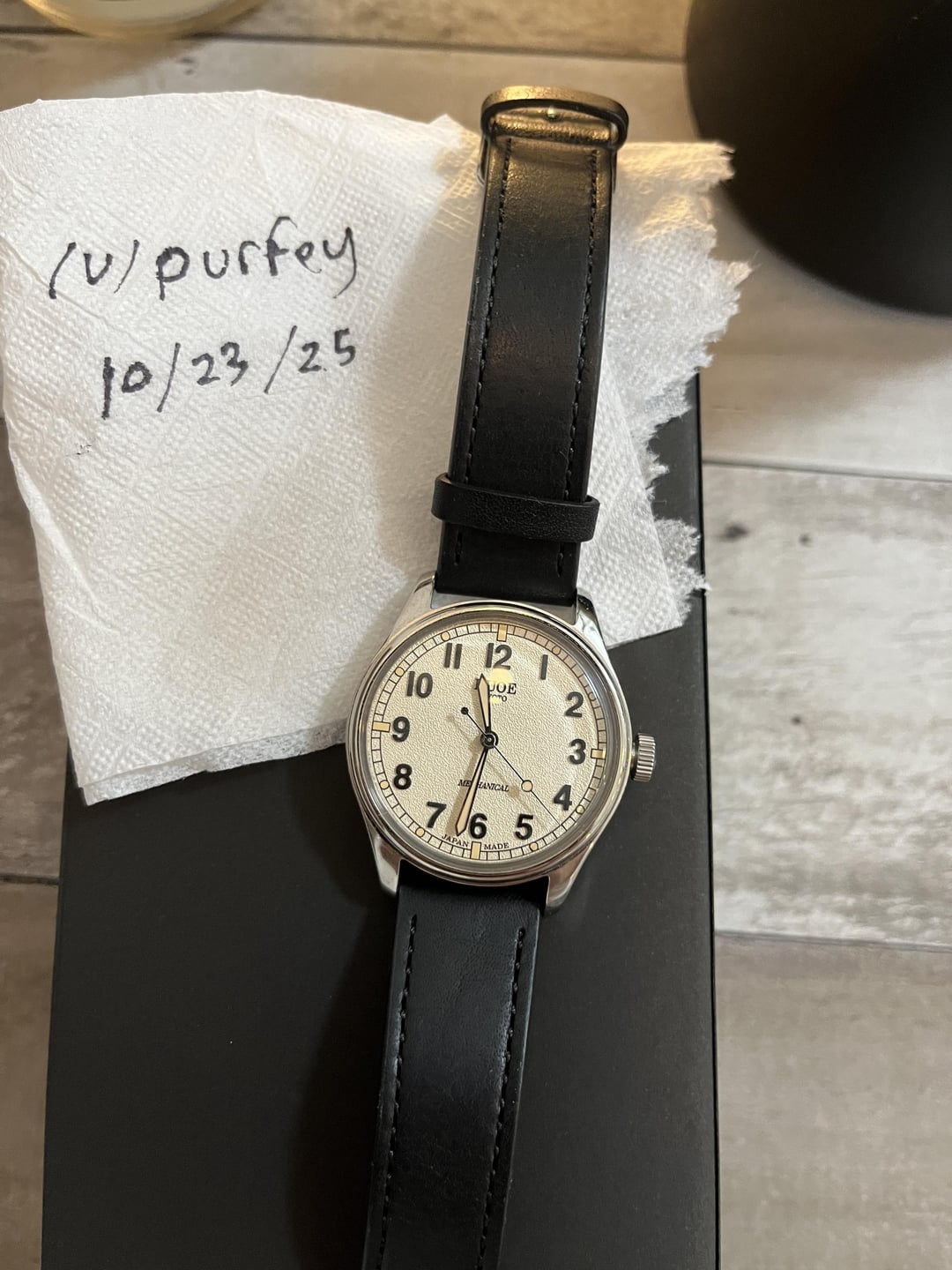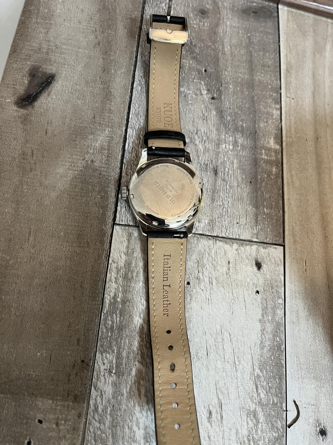 Selling my KUOE Kyoto Old Smith 90-002 (SKU: **os90002-nd-iv-it-bk-sa**) - the Japan-made 35mm version with the ivory dial and black Italian leather strap. It has sapphire glass and that classic hand-wound feel KUOE does so well. I’ve worn it for about a week and realized I want to try something different. The watch looks absolutely stunning in person - elegant, lightweight, and super comfortable on the wrist. **Note:** I trimmed the strap by about half an inch so it fits smaller wrists better. You can see it clearly in the photos. Comes with the original box. Asking for $500 (Shipping included). Here’s the official product page for reference: [KUOE Old Smith 90-002 – Ivory Automatic No Date](https://www.kuoe-en.com/product-page/kuoe-old-smith-90-002-japan-made-ivory-automatic-no-date)
