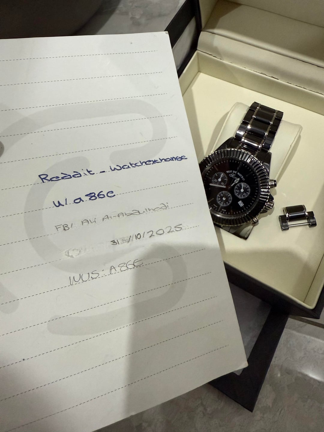 Hey all, On hand is the west end Sowar Chrono quartz full ceramic 42 mm Watch is in excellent condition, comes with box and tag Asking price: $545 + $35 shipping via UPS or Fedex Not interested in trades Please read the disclaimer before shooting a PM Thanks ⸻ Watch Sale Disclaimer: • I am a private collector, not a store or reseller, and I am not affiliated with any watch brand mentioned in this listing. • The watch will be shipped from Kuwait via FedEx, and a tracking number will be provided to the buyer once dispatched. • Buyer is responsible for any customs duties, VAT, or import taxes that may be charged upon delivery, depending on your country’s regulations. • I welcome all reasonable requests for additional information, including more photos and/or videos to verify the watch and its condition. • Payment terms: • Established Watchexchange members with verifiable feedback may pay via PayPal Goods & Services only, I do not accept Friends & Family nor Zelle • New or low-feedback users must pay via wire transfer. All watches are sold as-is, with details described to the best of my knowledge. Serious inquiries only, please. Thanks for looking