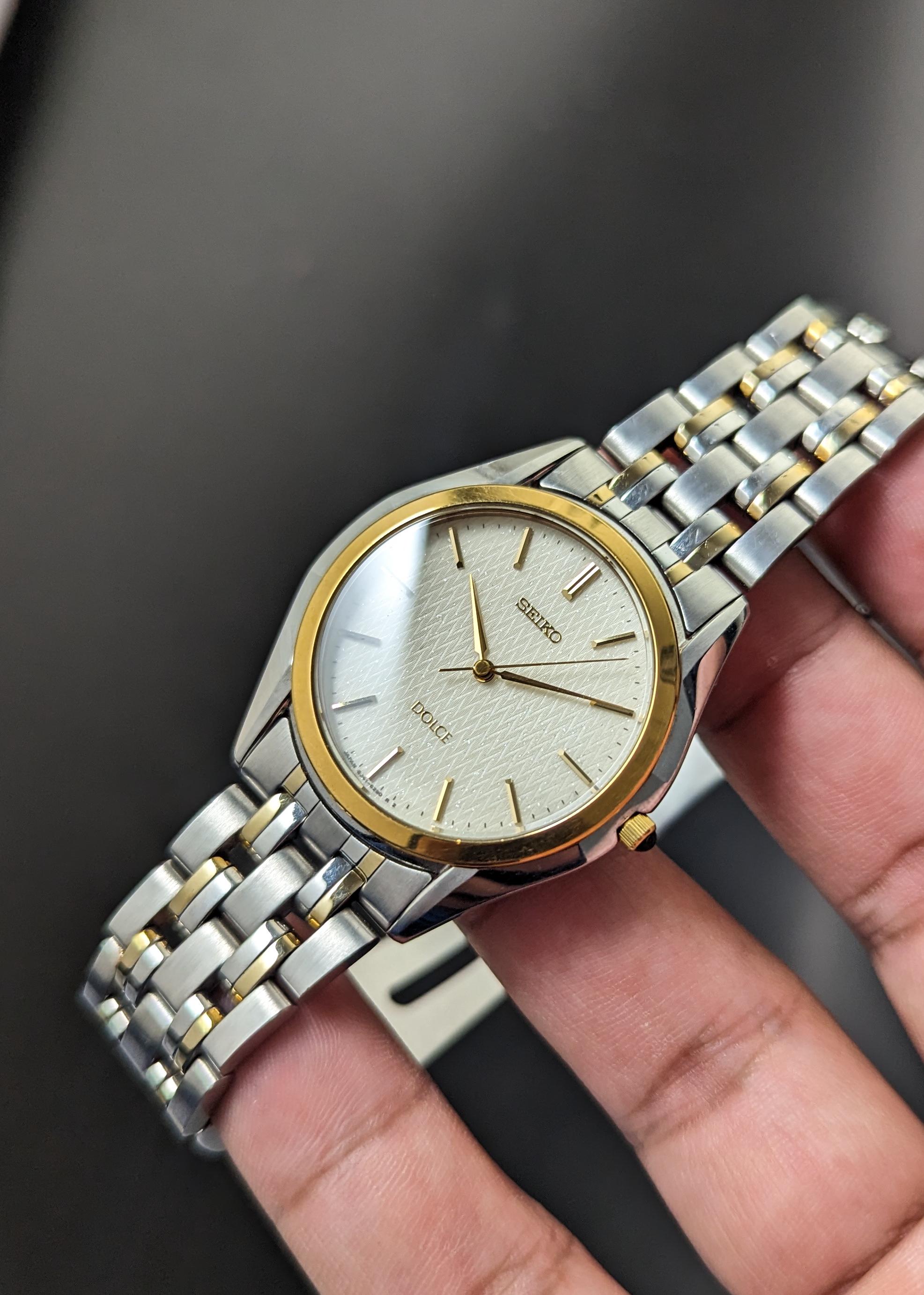 [Timestamp](https://postimg.cc/cgnjm9QZ) **Key Features:** * Model: Seiko Dolce 8J41-6160 * Movement: Seiko Quartz Cal. 8J41 (High-accuracy quartz) * Dial: Cross-textured **glittery silver tone** finish * Case: Stainless steel with gold-tone accents (two-tone finish) * Bracelet: Original Seiko two-tone bracelet with signed clasp * Crystal: Sapphire glass * Case Diameter: Approx. 36mm * Functions: Time-only (hours, minutes, seconds) * Origin: Japan