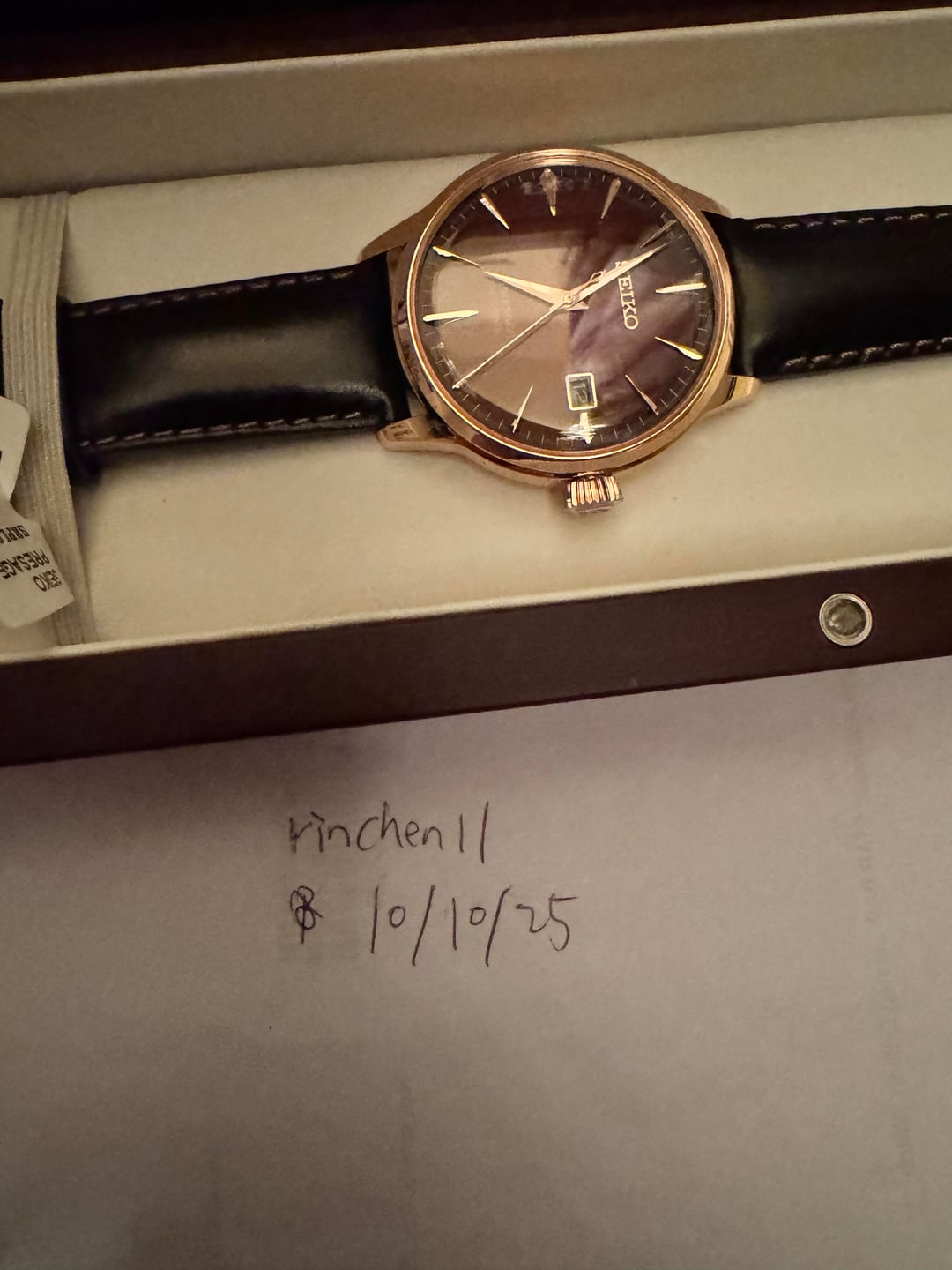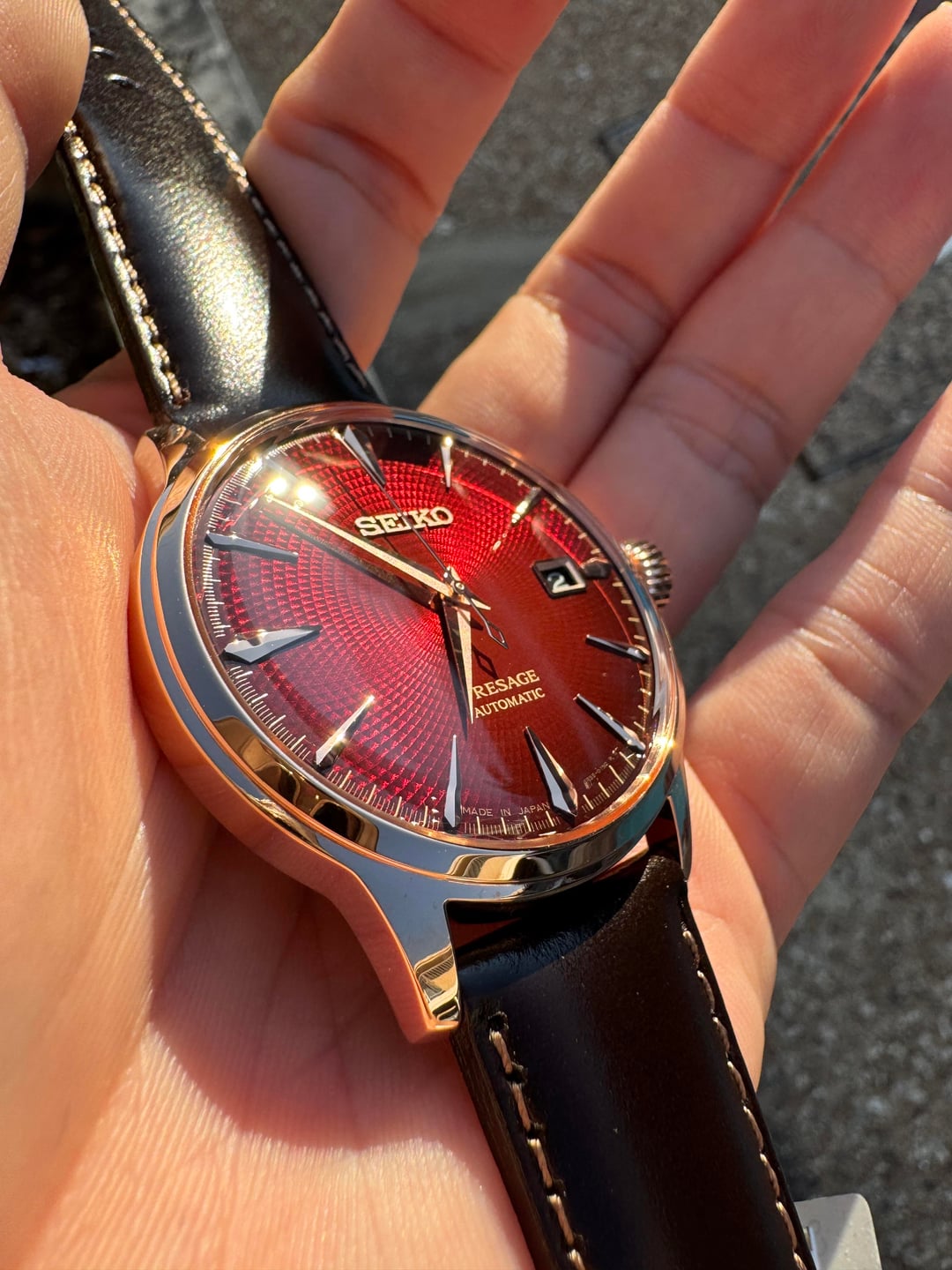 Hi all, Up for sale is my Seiko Presage Cocktail Time “The Conte” featuring the gorgeous deep red sunburst dial inspired by a Negroni cocktail. The dial texture and gradient are stunning in person — it shifts from burgundy to copper under different lighting, giving it a rich, vintage warmth. Specs: Model: SRPL96 Movement: Seiko 4R35 automatic Case: 40.5mm rose gold-tone stainless steel Dial: Red textured sunburst Crystal: Box-shaped Hardlex Lug Width: 20mm Water Resistance: 50m Strap: Original brown leather with Seiko buckle Caseback: Exhibition Condition: BNIB, with global warranty instead of local only warranty Includes: Full set – box, papers, and original strap Price: $1200 + shipping CONUS Payment: Zelle or PayPal This is one of the most striking Presage “Cocktail Time” variants Seiko ever made — the dial color is inspired by a Negroni and pairs beautifully with the rose gold-tone case. A perfect dress watch with serious wrist presence and classic Japanese craftsmanship. Please comment before PM. Thanks for looking!
