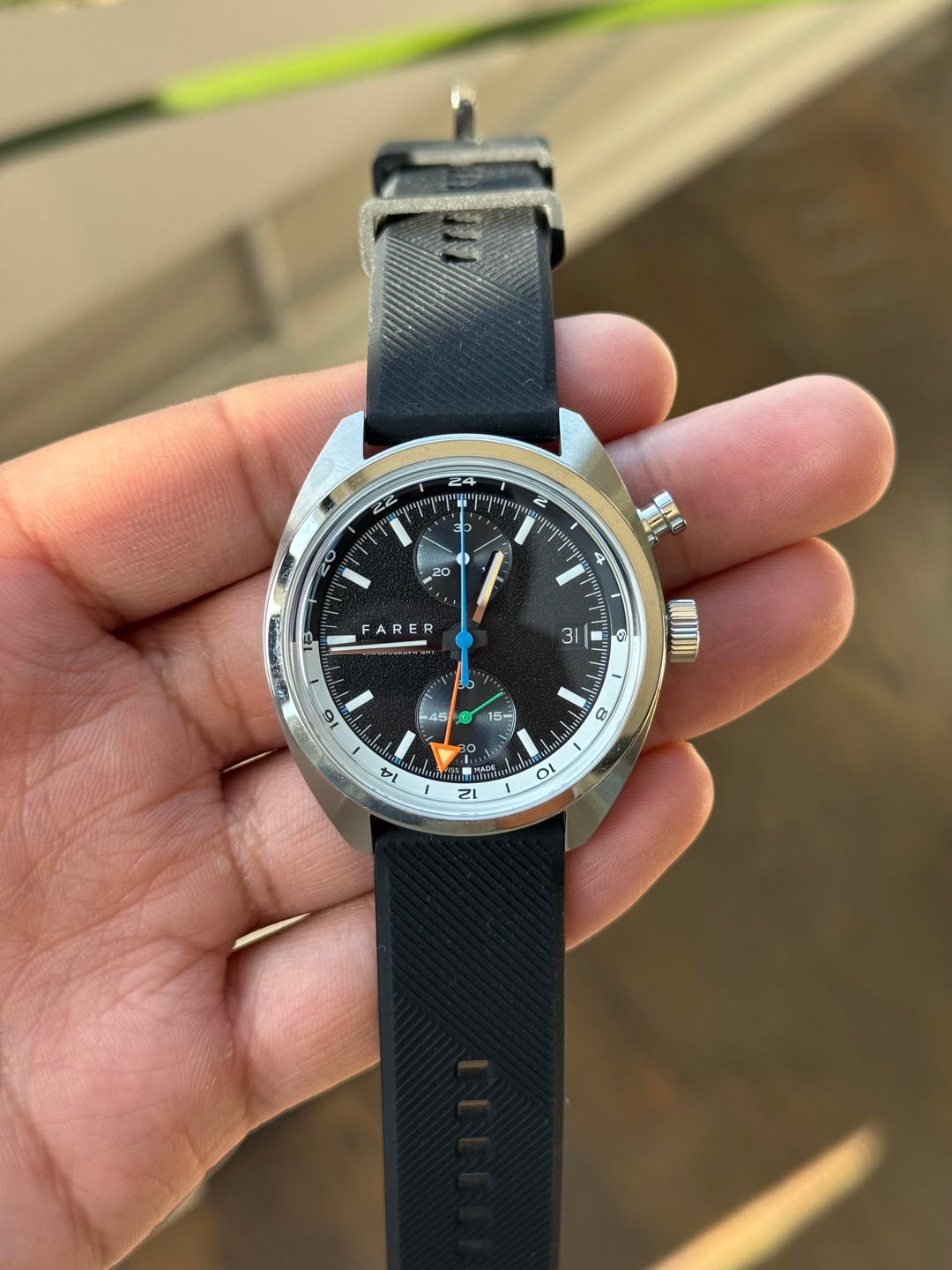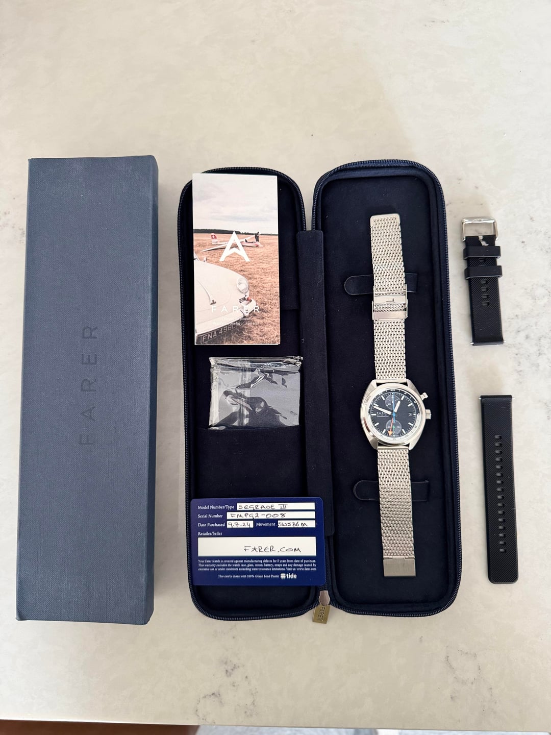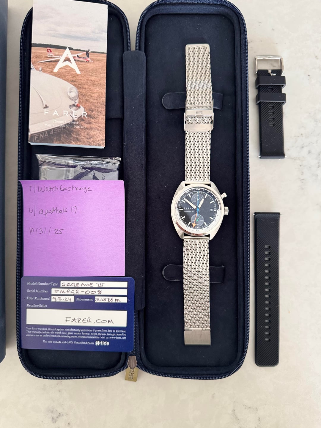 Hey all, Up for sale is my Farer Segrave III, a beautifully finished manual-wind chronograph with a GMT function, a perfect mix of classic design and modern practicality. This piece runs the Swiss Elaboré Sellita SW536 M MP movement, offering a 62-hour power reserve, and features Farer’s signature design language with bold yet refined details. It’s easily one of the more unique and wearable chronographs in this price range. The watch is in excellent condition, with minimal wrist time. An engraving on the caseback was professionally buffed out from the previous owner (visible under close inspection). There’s a tiny ding on the bezel, circled in photos. The closure pin on the Milanese bracelet has a slight bend that doesn’t affect function or comfort. Timestamp is in the last photo and here: https://imgur.com/a/USSWKn9 ✅ Farer 5-year warranty valid until 9/7/2029 💰 $1,600 USD shipped CONUS Payment via PayPal F&F, Venmo, Zelle What’s Included • Outer “Farer” box • Fabric travel case • Owner’s manual • Microfiber cloth • Warranty card • Milanese bracelet Specs • Case: Stainless steel • Diameter: 41mm • Lug-to-Lug: 44mm • Thickness: 14.5mm • Lug Width: 20mm • Crystal: Sapphire • Movement: Swiss Elaboré Sellita SW536 M MP (Manual wind, Chronograph + GMT, 62h PR) • Water Resistance: 10 ATM This is an incredible all-arounder, slim enough for everyday wear, but with enough personality to stand out. Only letting it go to consolidate the collection.
