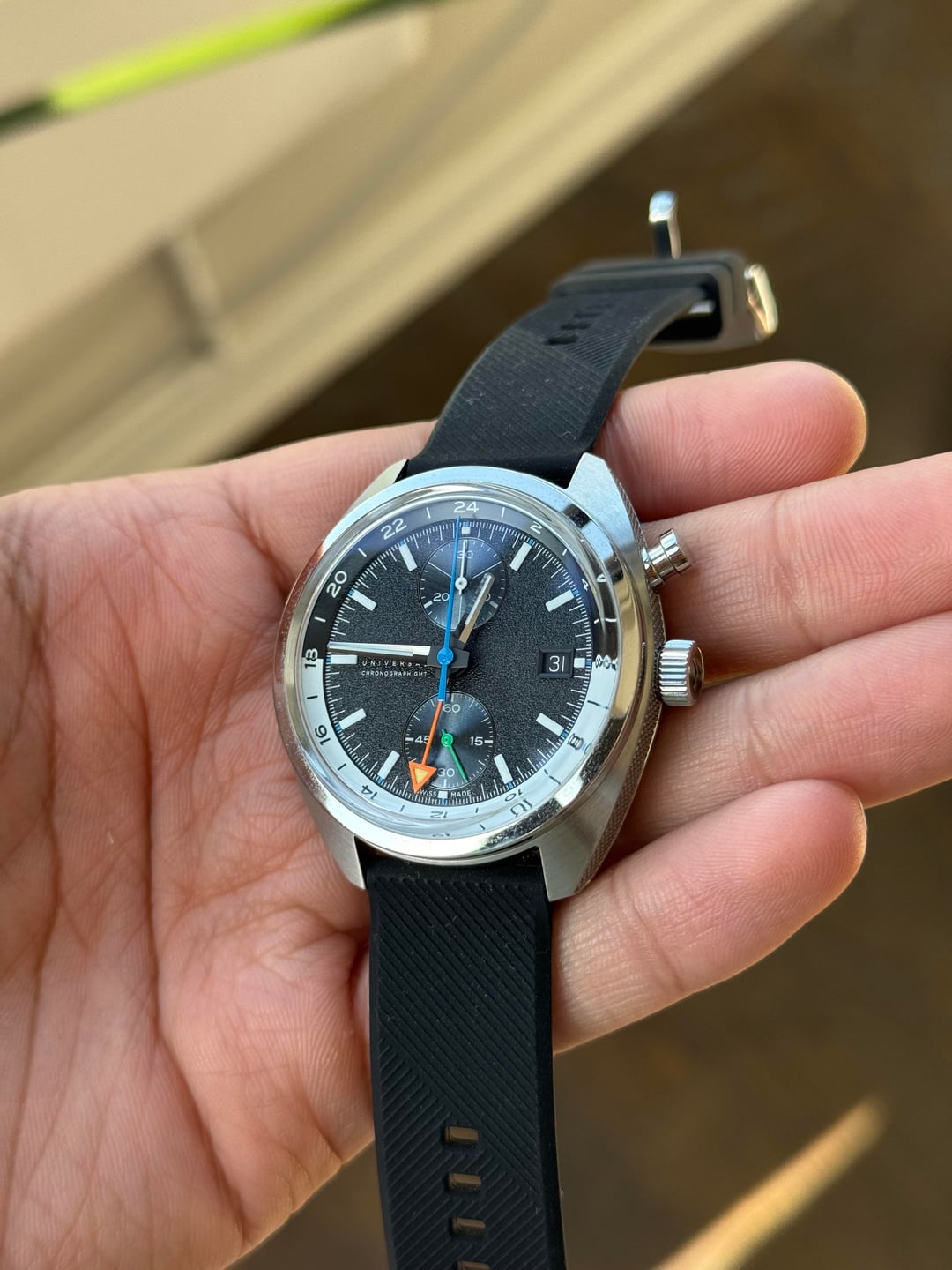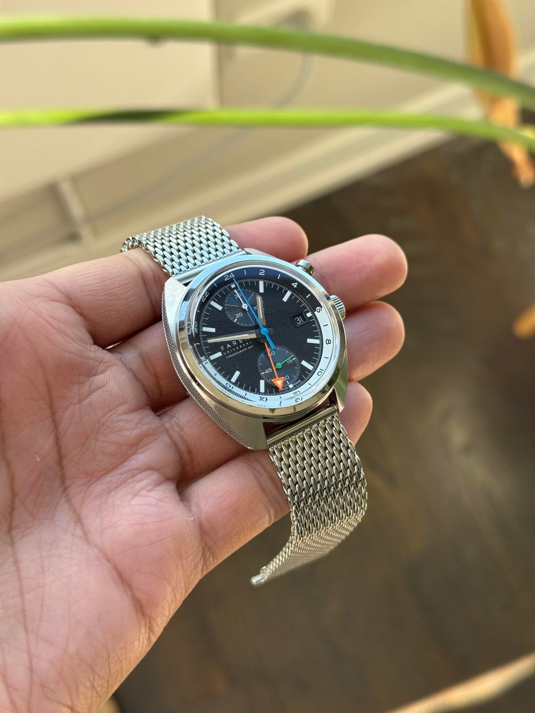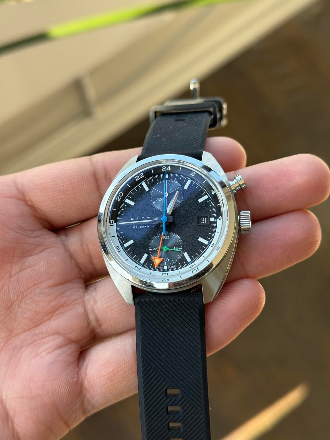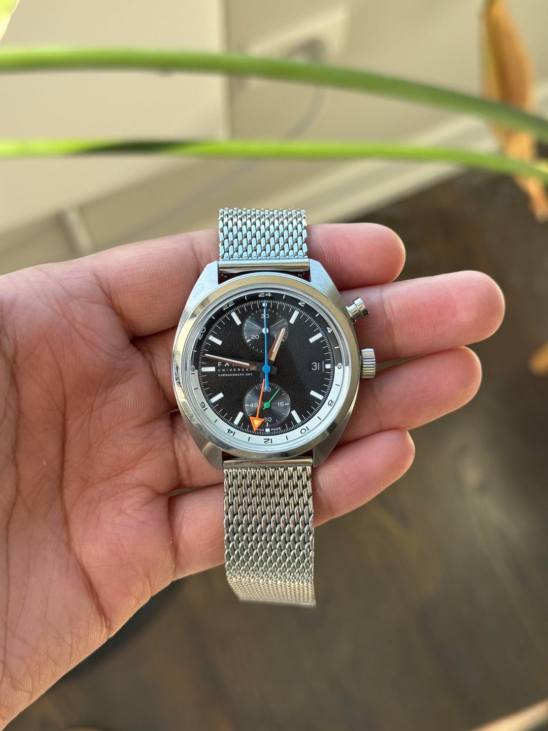 Hey all, Up for sale is my Farer Segrave III, a beautifully finished manual-wind chronograph with a GMT function, a perfect mix of classic design and modern practicality. This piece runs the Swiss Elaboré Sellita SW536 M MP movement, offering a 62-hour power reserve, and features Farer’s signature design language with bold yet refined details. It’s easily one of the more unique and wearable chronographs in this price range. The watch is in excellent condition, with minimal wrist time. An engraving on the caseback was professionally buffed out from the previous owner (visible under close inspection). There’s a tiny ding on the bezel, circled in photos. The closure pin on the Milanese bracelet has a slight bend that doesn’t affect function or comfort. Timestamp is in the last photo and here: https://imgur.com/a/USSWKn9 ✅ Farer 5-year warranty valid until 9/7/2029 💰 $1,600 USD shipped CONUS Payment via PayPal F&F, Venmo, Zelle What’s Included • Outer “Farer” box • Fabric travel case • Owner’s manual • Microfiber cloth • Warranty card • Milanese bracelet Specs • Case: Stainless steel • Diameter: 41mm • Lug-to-Lug: 44mm • Thickness: 14.5mm • Lug Width: 20mm • Crystal: Sapphire • Movement: Swiss Elaboré Sellita SW536 M MP (Manual wind, Chronograph + GMT, 62h PR) • Water Resistance: 10 ATM This is an incredible all-arounder, slim enough for everyday wear, but with enough personality to stand out. Only letting it go to consolidate the collection.