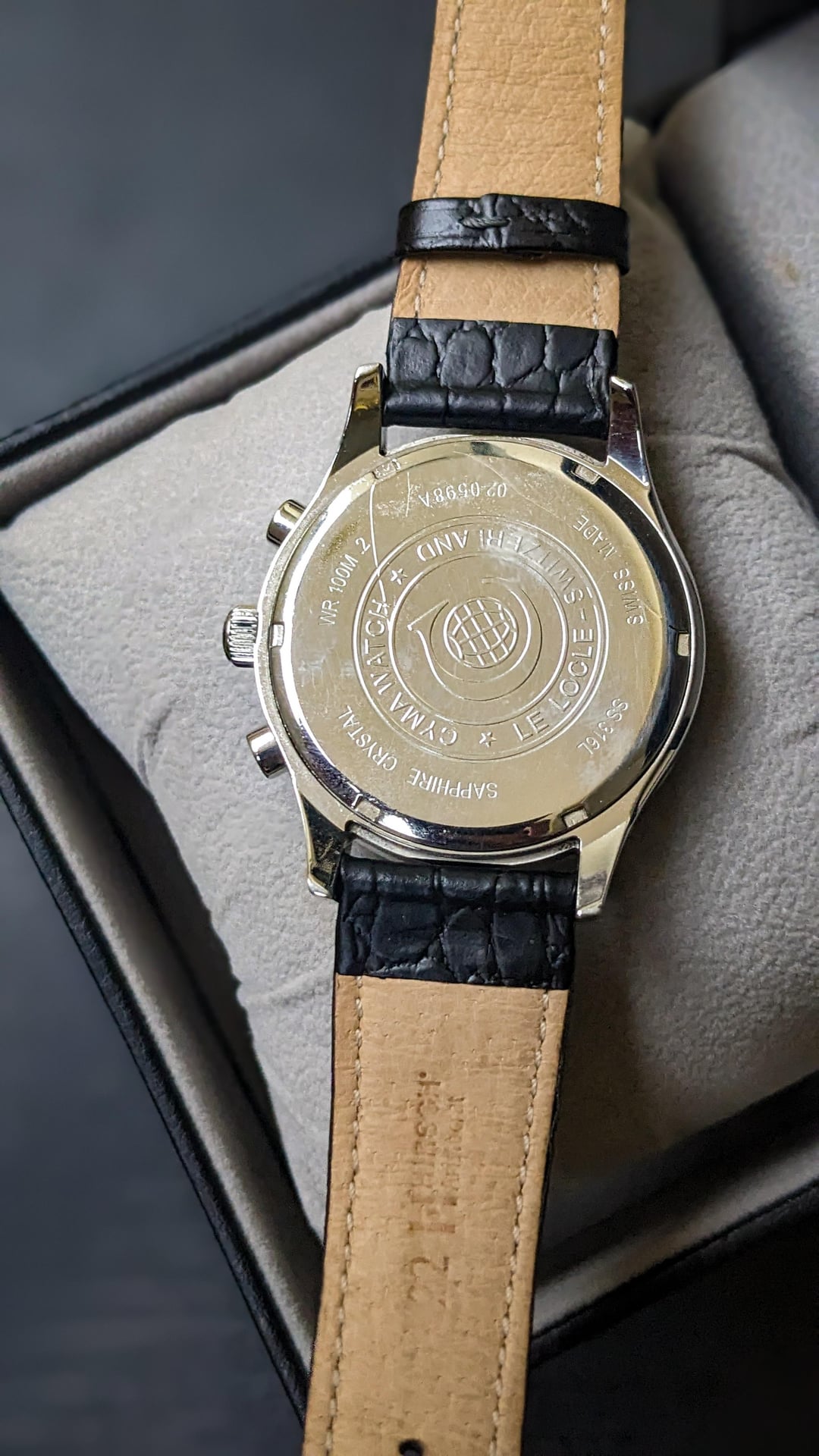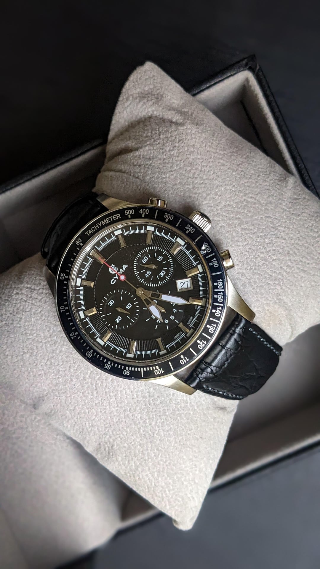 Hello WatchFam, Here's a very special Cyma Champion Chronograph 02-0598A, a sophisticated Swiss-made timepiece that combines robust construction with classic chronograph functionality. This watch features a precise Swiss-made quartz chronograph movement, ensuring accurate timekeeping and reliable performance. The watch comes on a stylish black leather Aftermarket strap, complementing its elegant design. The watch reference number is 02-0598A with a quartz chronograph movement. This timepiece boasts a stunning black dial with contrasting sub-dials for chronograph functions, applied indices, and a date complication at the 6 o'clock position. The outer bezel features a practical tachymeter scale, adding to its sporty appeal. The caseback clearly indicates its Swiss origin from Le Locle, its 316L stainless steel construction, and a durable sapphire crystal. It's a robust watch with a water resistance of 100 meters (WR 100M), making it suitable for everyday wear and various activities. Condition: As shown in the pictures. ✅ Comment before sending dm Timestamp: https://imgur.com/a/HjRi0ik Price $480