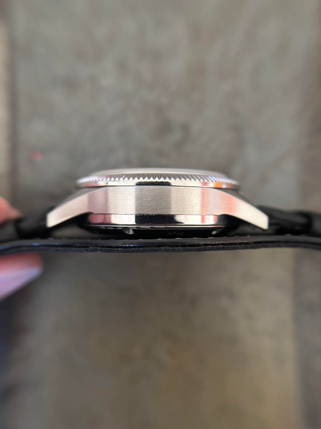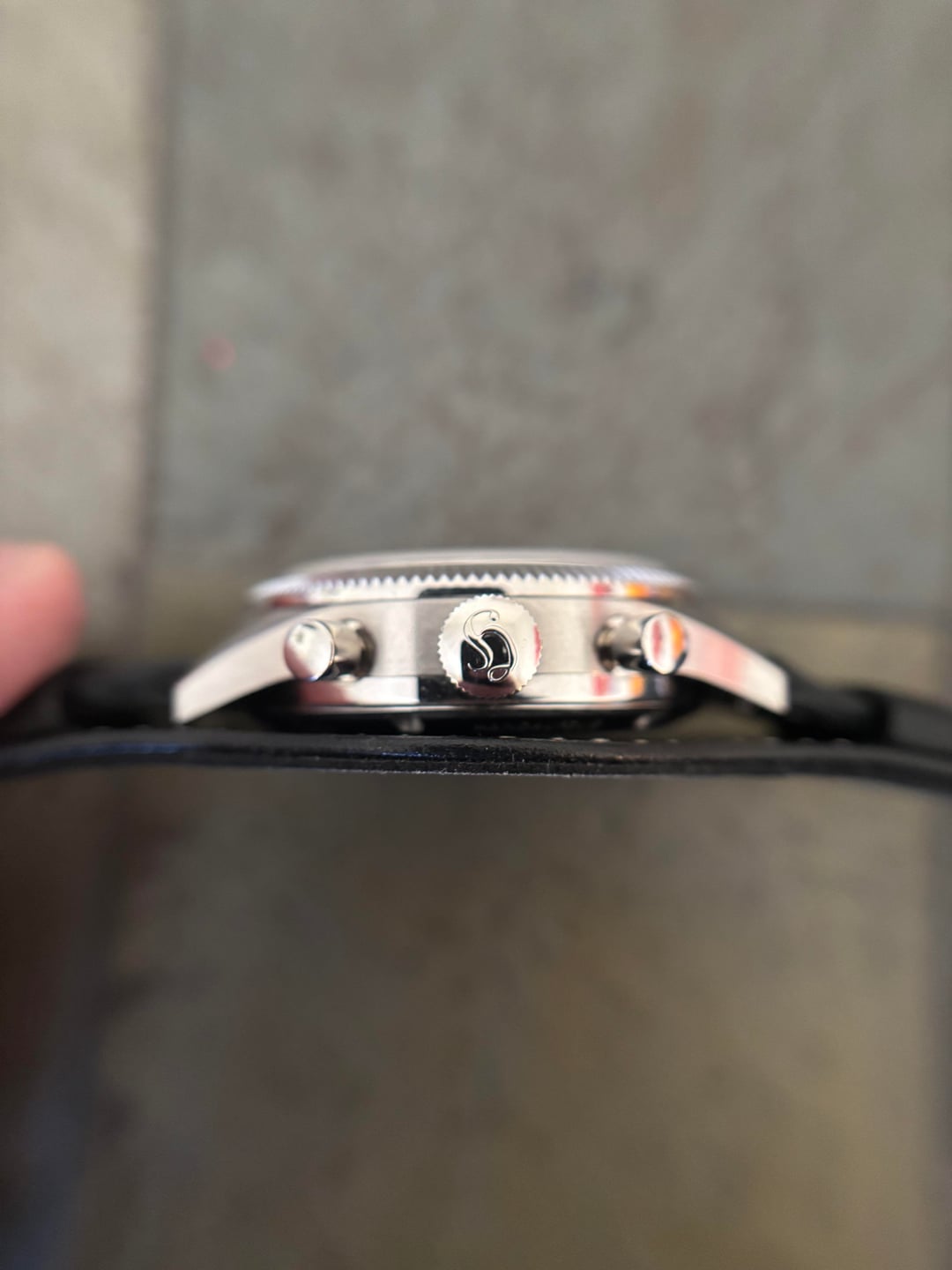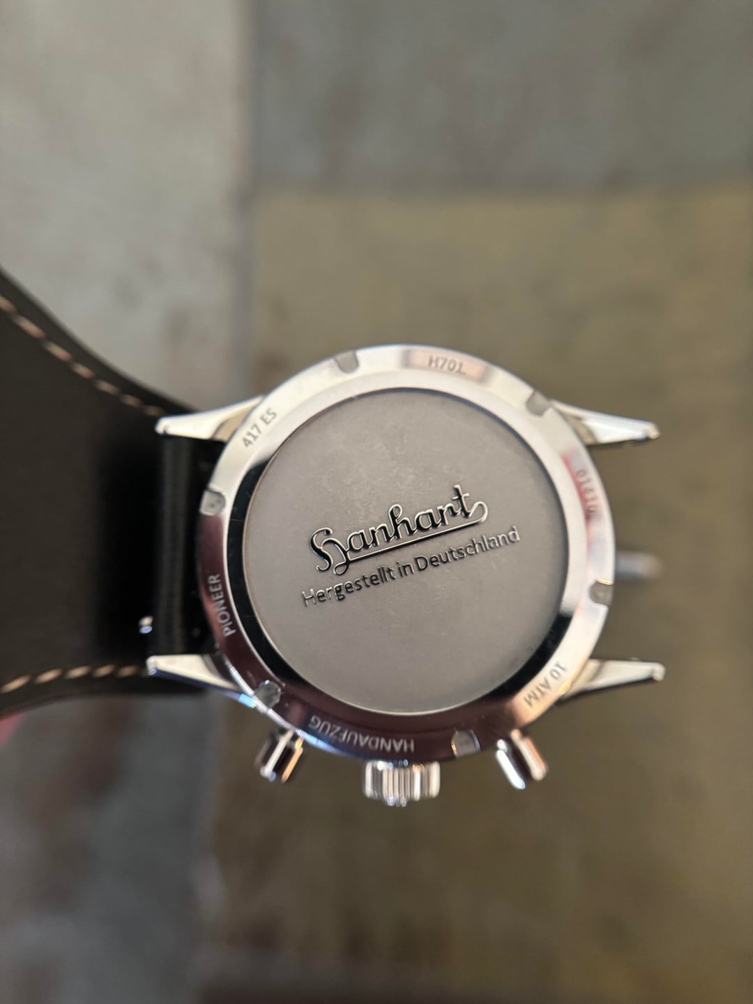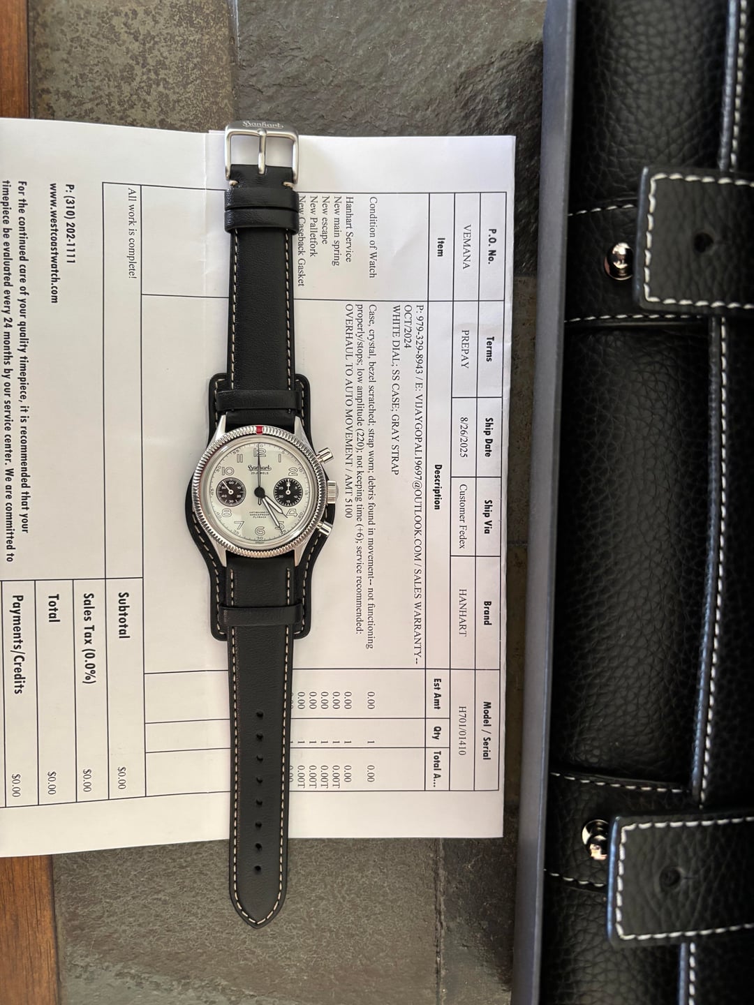 Up for sale today is my Hanhart 417 ES column wheel flyback chronograph with panda dial. This is a catch and release for me. Excellent watch, but I think the reverse panda is more my style after all. I am the second owner, and the watch was originally purchased from Watchbuys in Oct'2024. Watch is in excellent condition and includes the original, unused bundt strap. Was sent in for service by the original owner because of power reserve issues, and keeps excellent time within +/- 2 secs/day. Price: $2,100 including shipping within the US. Payment: Paypal F&F, or Zelle Shipping: Insured USPS Priority mail. Oh