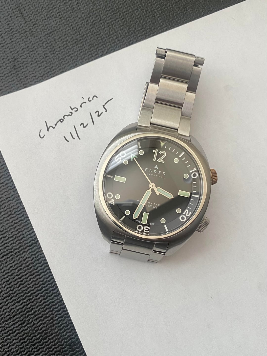 Happy Sunday guys! For sale is a Farer Endeavour Aqua Compressor. This is the stainless steel version that is no longer available (Farer only offers this watch in titanium now). I am the second owner and have worn the watch a handful of times with care in rotation. In very good pre-owned condition. See pics and video. Comes with full kit as pictured (rubber and canvas straps, booklet, card, cloth, stickers, extra links (bracelet currently sized to 6.5” wrist), bracelet removal tool): Video: https://imgur.com/a/5xe2Cuz ——————————————— Case Material: Stainless steel with mixture of satin brushed top surfaces and polished case sides Case Diameter: 41mm x 45mm lug-to-lug x 12.5mm thick Weight: 150g (as sized to 6.5” wrist) Bracelet: Stainless steel Crystal: Domed Sapphire WR: 300m Movement: ETA 2824-2 Elabore No-Date movement. Dual crowns, one made of solid bronze, one made of stainless steel Internal elapsed time bezel Applied markers with polished marker surrounds ——————————————— Feedback: I’ve done many smooth deals on r/watchexchange and 500+ swaps on r/knifeswap. I’ve also done many smooth watch deals on watchuseek. Feel free to take a look at my feedback from prior watch deals. ——————————————— Asking $950 shipped CONUS Payment via Zelle, Venmo, PayPal FF Please message me with any questions. Thanks!