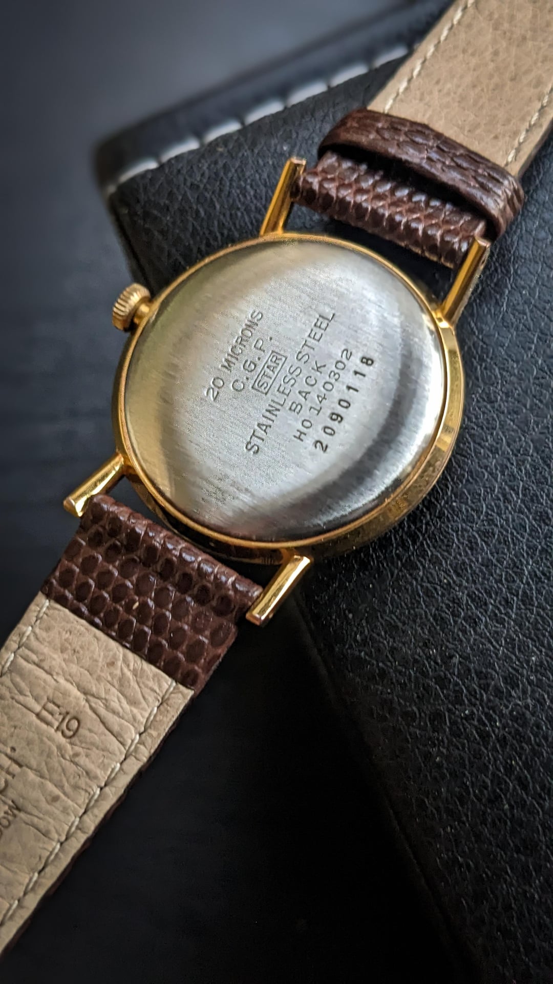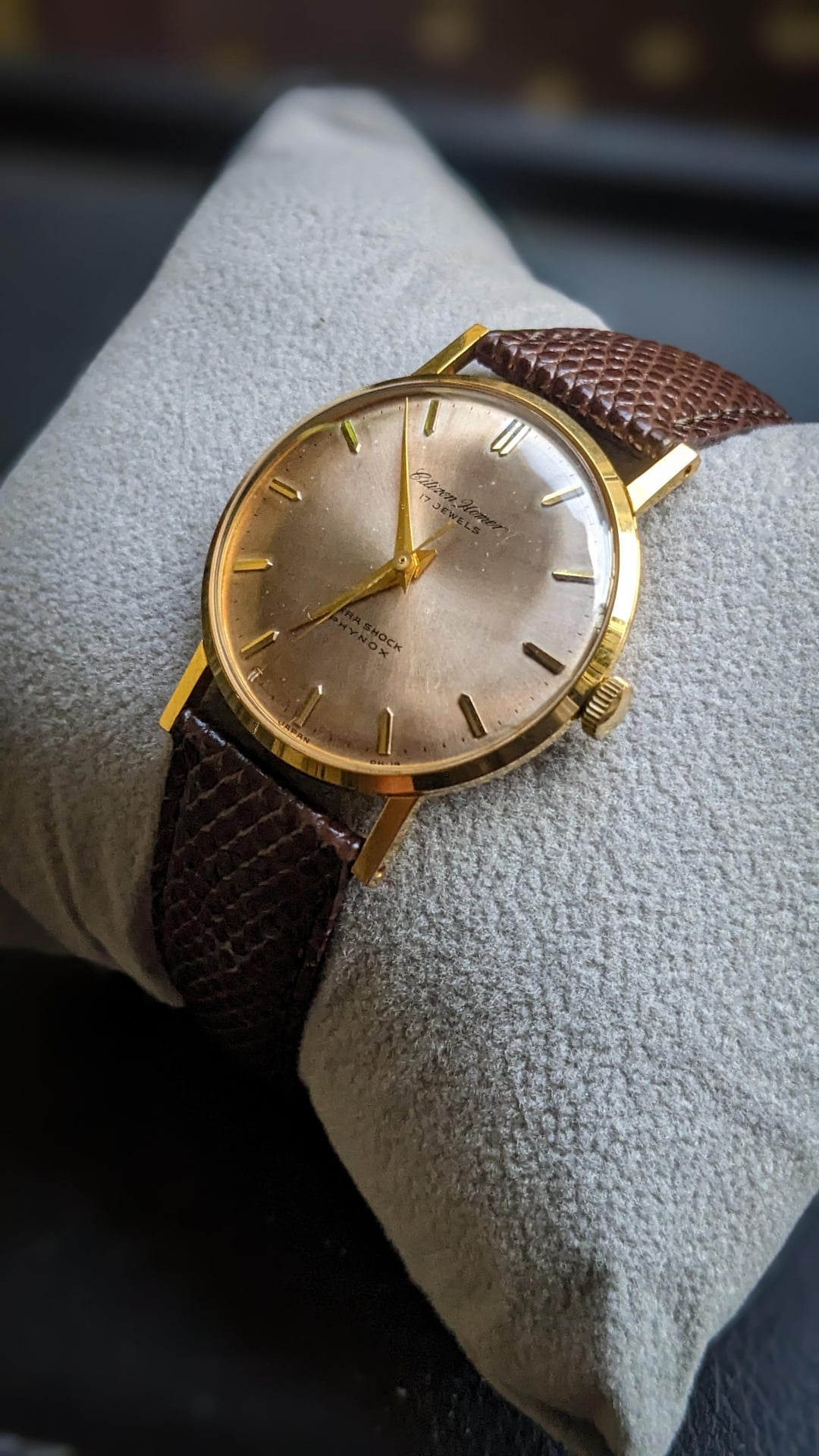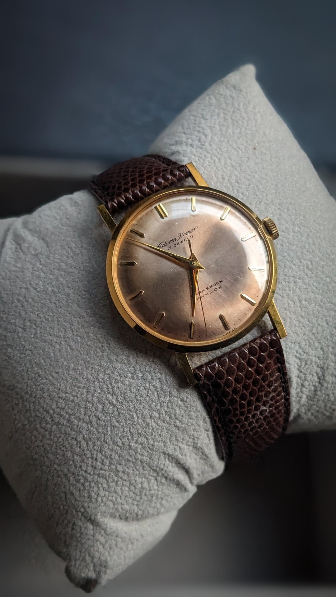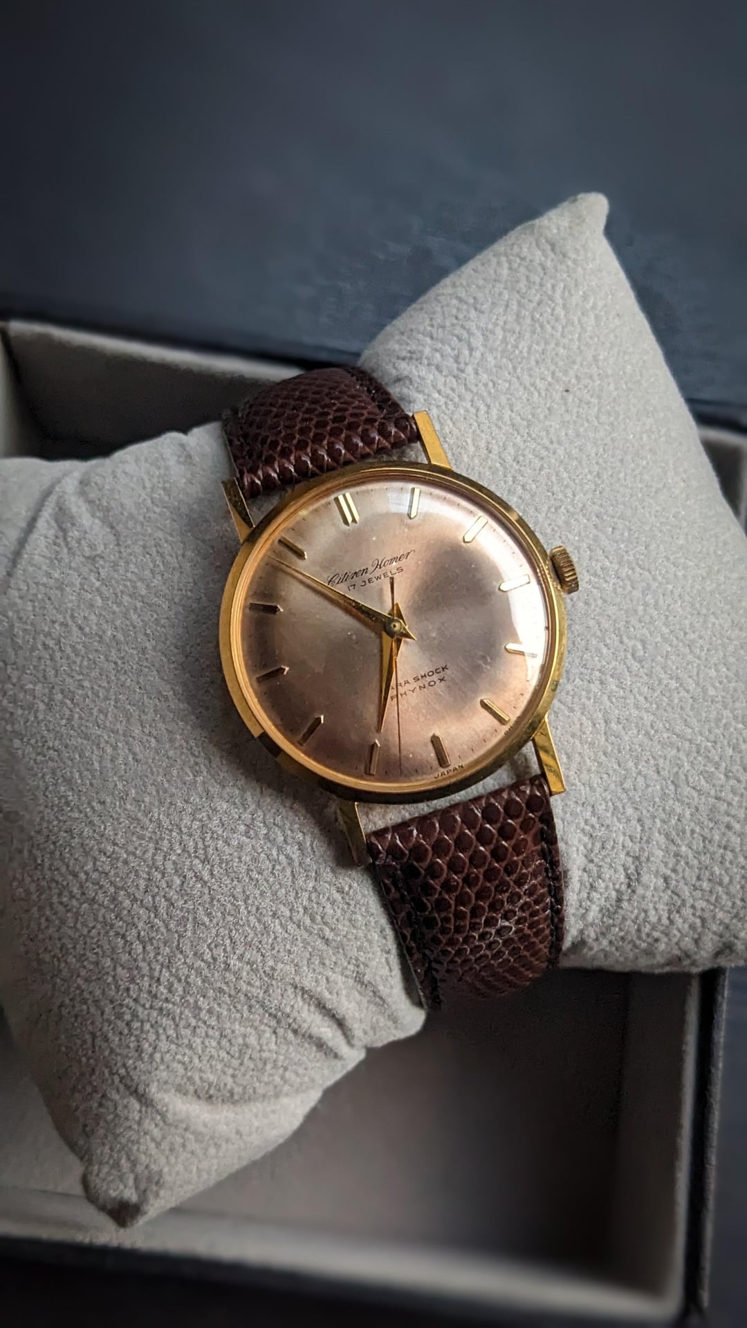 Hello watchfam , Here's A 1960's " citizen Homer 20 micron gold plated wristwatch reference H0150801 with an automatic 17 jewel movement, made in Japan. The watch has a large size 34mm s gold plated with a patinabeautiful dial which enhance the overall design . The watch comes on a brown aftermarket strap which compliments the sgolden case and dial nicely. Please note that this is a 60+ year old watch and as such is not going to be 'as new' and thus the case does have some scratches and scuffs so please study the photos. The movement is running well for daily Usage, not serviced. Timestamp: https://imgur.com/a/PcnjzRW Price 355$