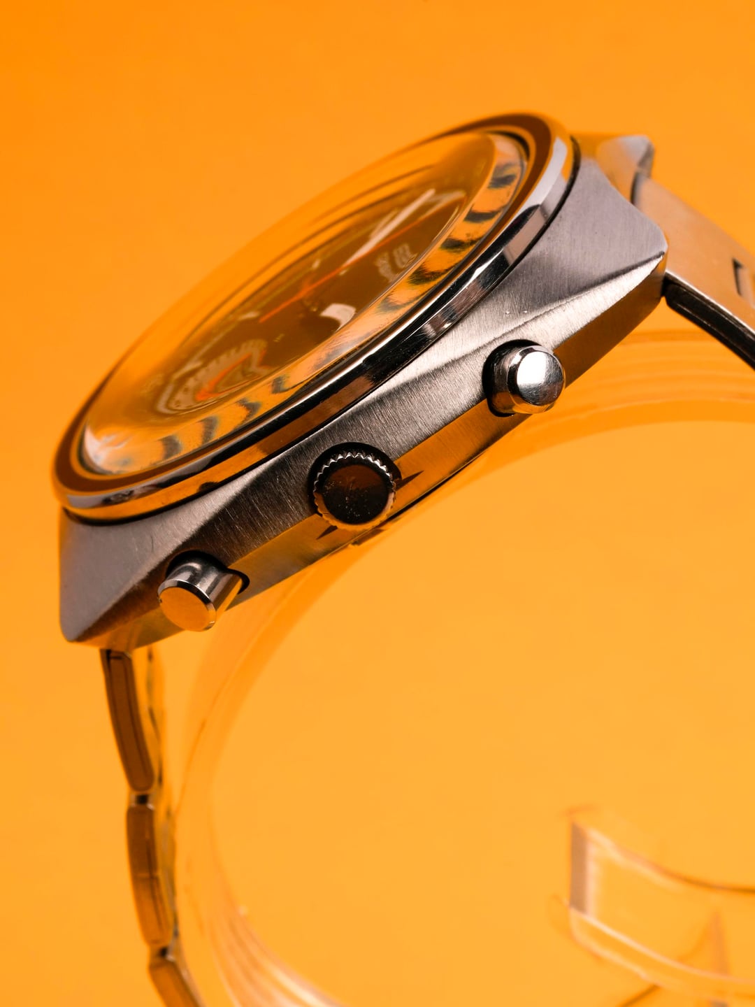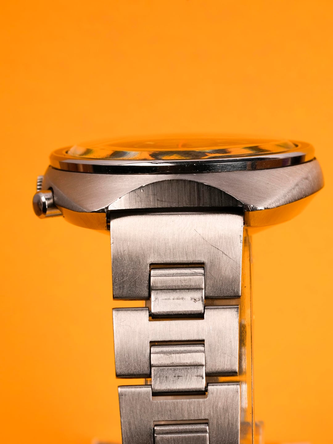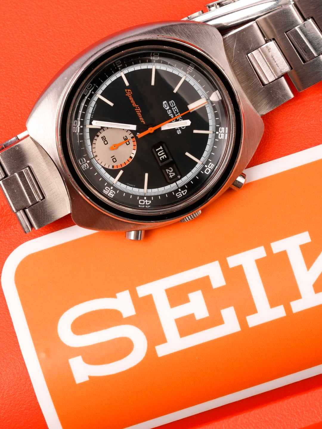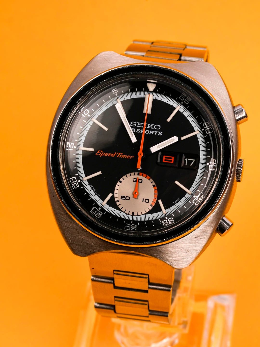 This variant is truly special and really stands out on the wrist! The dial, marked “JAPAN 6139 - 7040T,” features a striking matte black finish. The prominent “SpeedTimer” logo is realised in a contemporary orange colour sitting beautifully across from the sleek black day/date frame. The bracelet maintains its original flat three-link design, coded XJA161, tapering perfectly to snugly fit under the lugs. I have to say, this model is one of my personal favourites! It showcases a split bi-color 30-minute sub-register in black and silver, accented by vibrant orange chronograph hands that really bring it to life. A particularly interesting detail is the stunning triple hinge “Chiclet” Bracelet made from stainless steel, which is unique to this variant. That and the UFO saucer case shape really makes this a unique Seiko design even for Seiko. As part of Seiko’s early automatic chronograph legacy, the 6139 - 7020 is more than just a watch; it’s a piece of horological history. Its combination of functionality, precision, and vintage appeal makes it a hot topic among collectors and enthusiasts. In terms of condition, this watch is superb with little to no wear despite its age. The crystal is flawless, with just a small nick beneath the day window. It comes on the original bracelet, sized for an 18cm (7inch) wrist, with ample space for adjustment. Everything is crisp, smooth and neat. Please see video for a demonstration. Please see photos for cosmetic condition. Note: so you know exactly what you will get I have provided macro photos but please remember these will show wear invisible to the naked eye. A lovely piece with a contemporary orange accented colourway I’ve enjoyed owning ready for its next adventure. Please see my other listings for more vintage Seiko Speedtimer goodness. 💵 Price: $525 USD + $35 USD shipping ( shipping costs me around $70-$80, so I cover half). Images, Video & Timestamp [https://imgur.com/a/5Ntdr5m](https://imgur.com/a/5Ntdr5m)