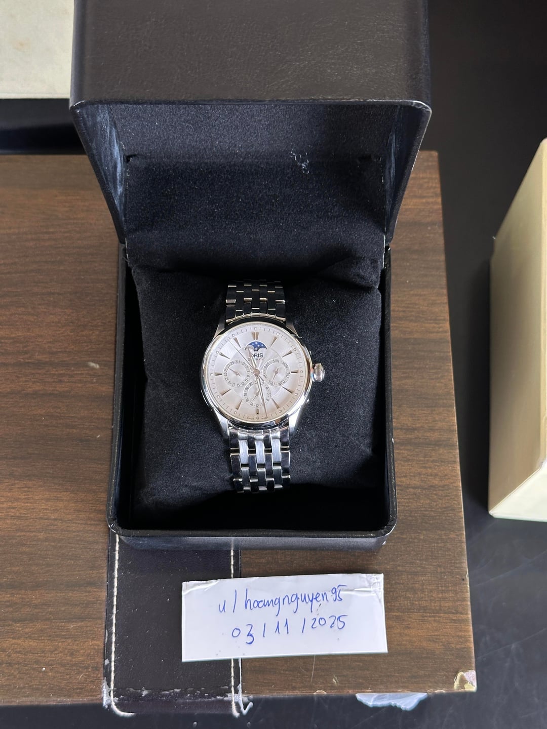 Up for sale is the Discontinued Stainless Steel Oris Artelier Complication Moonphase 7592 40mm in excellent condition. Photos: https://drive.google.com/drive/folders/1avdcWqVPK827y1ZtSkPv0MXjxBPt3Gu3 Video: https://drive.google.com/file/d/10CADPX-1_ZM0-SUTIrBpnq42fr7zVkAW/view?usp=drivesdk Timestamp: https://drive.google.com/file/d/1NHabZ1tkFFdxiMLiLF5Y6VoqpCkKnTuc/view?usp=drivesdk The Oris Artelier Complication 7592 is a discontinued piece that manages to pack in some of the most useful complications without ever feeling cluttered. At 40mm, the case wears beautifully, slim enough to slide under a cuff, yet with enough presence to feel substantial. The stainless steel bezel against the silver dial gives it a touch of warmth that balances the otherwise clean, modern design. On the dial you’ll find subdials for day, date, a second 24-hour time zone, and a moonphase at 12 o’clock , practical information presented in a layout that stays symmetrical and easy to read. Powering it is the Oris Calibre 582 automatic movement, offering a 38-hour reserve and visible through the caseback. The watch was produced in 2008 as shown on the caseback. The watch is in excellent condition showing minor hairline scratches on the case and the caseback. The crystal is flawless, with clean bezel, clean dial and case. Watch comes fitted on OEM Oris Bracelet that fits up to 21cm (8.3 inches). The watch has been serviced, so it’s keeping excellent time and it’s currently running at +/-5s a day. Watch comes with standard watch box (no papers) Price: $1100 + $60 flat shipping (via DHL/ UPS express with tariffs/duty fee covered). Payment via PayPal F&F or G&S (+4.6% fee paid by the buyer). Not accepting trades. Feel free to message me with any questions or if you’re interested. Have a great day! Check out my other watches on Instagram: @jasonswatchcorner