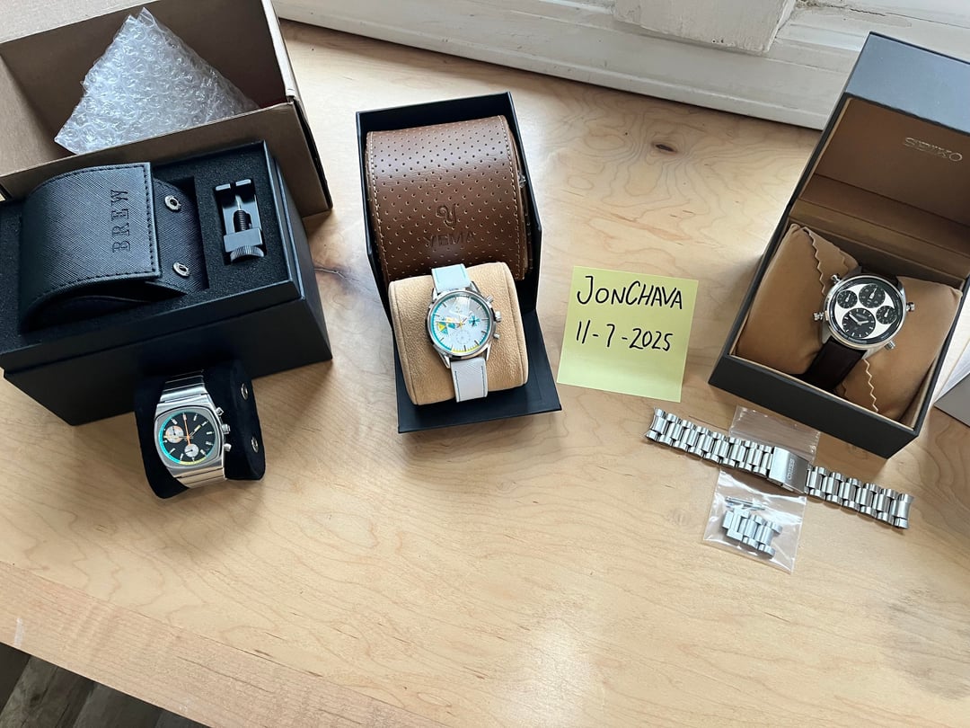 Selling three watches today: *1: For Yema Yachtingraf Croisière, White version on leather, and under warranty until August 2027. Its in like new condition, no noticeable issues or marks. 370 shipped. https://yema.com/products/yema-yachtingraf-croisiere-meca-quartz-ymhf1583-bb *2: Brew Metric Retro. Watch is in great condition. Catch and release. https://www.brew-watches.com/products/brew-metric-retro-black?srsltid=AfmBOoqoVsKEH9v86s_lAndQ1EiAcfV6pyUhyoVYOufQvXdSX7J7hXIh **375 Shipped** *3: Seiko Prospex SBER001 8A50 Panda White Dial Speedtimer JDM Solar Quartz Watch - $475 shipped https://japan-select.com/products/seiko-prospex-speedtimer-sber001-made-in-japan-jdm?variant=40175005630519&country=US¤cy=USD&utm_medium=product_sync&utm_source=google&utm_content=sag_organic&utm_campaign=sag_organic