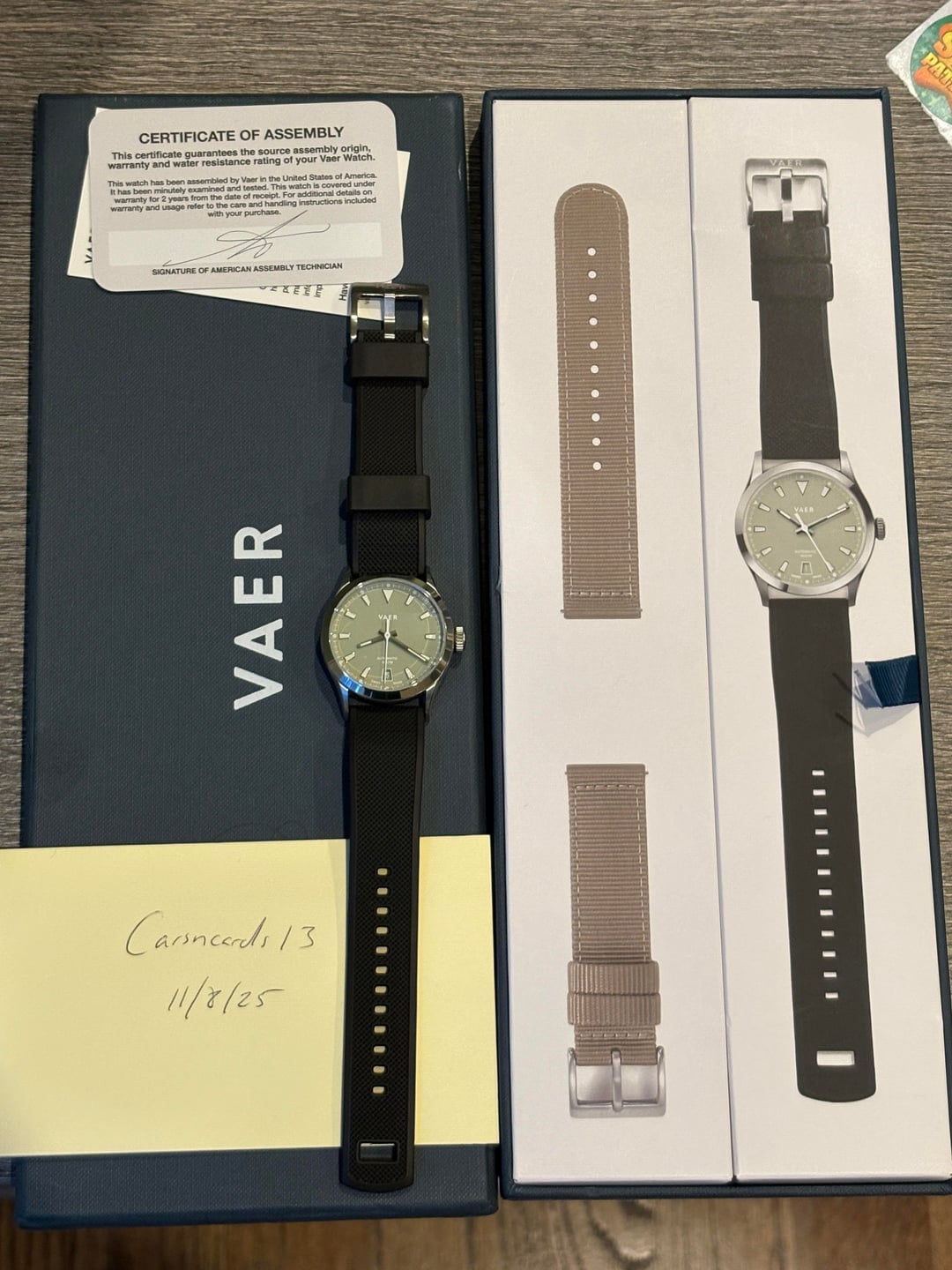 Selling a hard-to-find Vaer A7 Olive with two Vaer straps. The nylon strap is unworn. The case is in excellent shape. No significant defects to note. Comes with all boxes and papers. Below are specs for the watch. $499 shipped CONUS via Paypal FF or Venmo. **Product** **Details** * New Product Retail: $899 * Model: A7 Atlas Olive * Case Size: 36mm * Water Resistance: 100m * Crystal: Single Domed Sapphire w/ internal AR coating * Movement: SW-200 * Lume: 15 Layer C1 Super-LumiNova Hands & Numerals * Assembly Origin: Swiss Assembly
