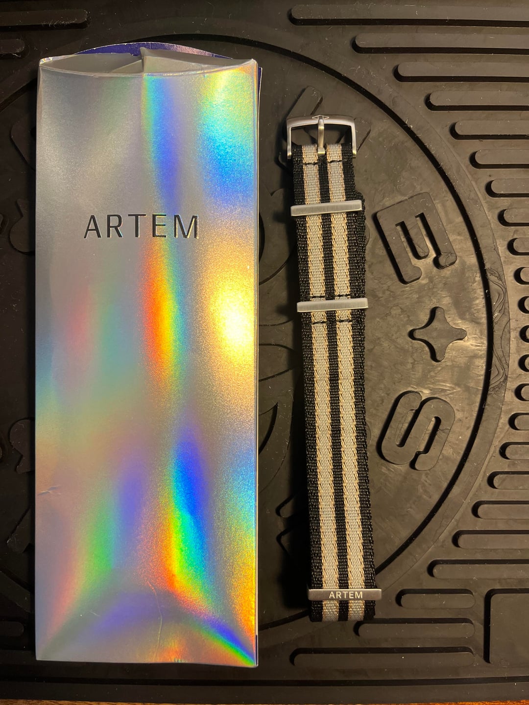 Artem 20 mm NATO “No Time to Die” with brushed keepers and buckle in mint condition. Tried-on, but not worn outside the house; still like new. Pictures: [https://imgur.com/a/MIySunh](https://imgur.com/a/MIySunh) $50 includes shipping within CONUS, PayPal or Zelle accepted. Thanks!