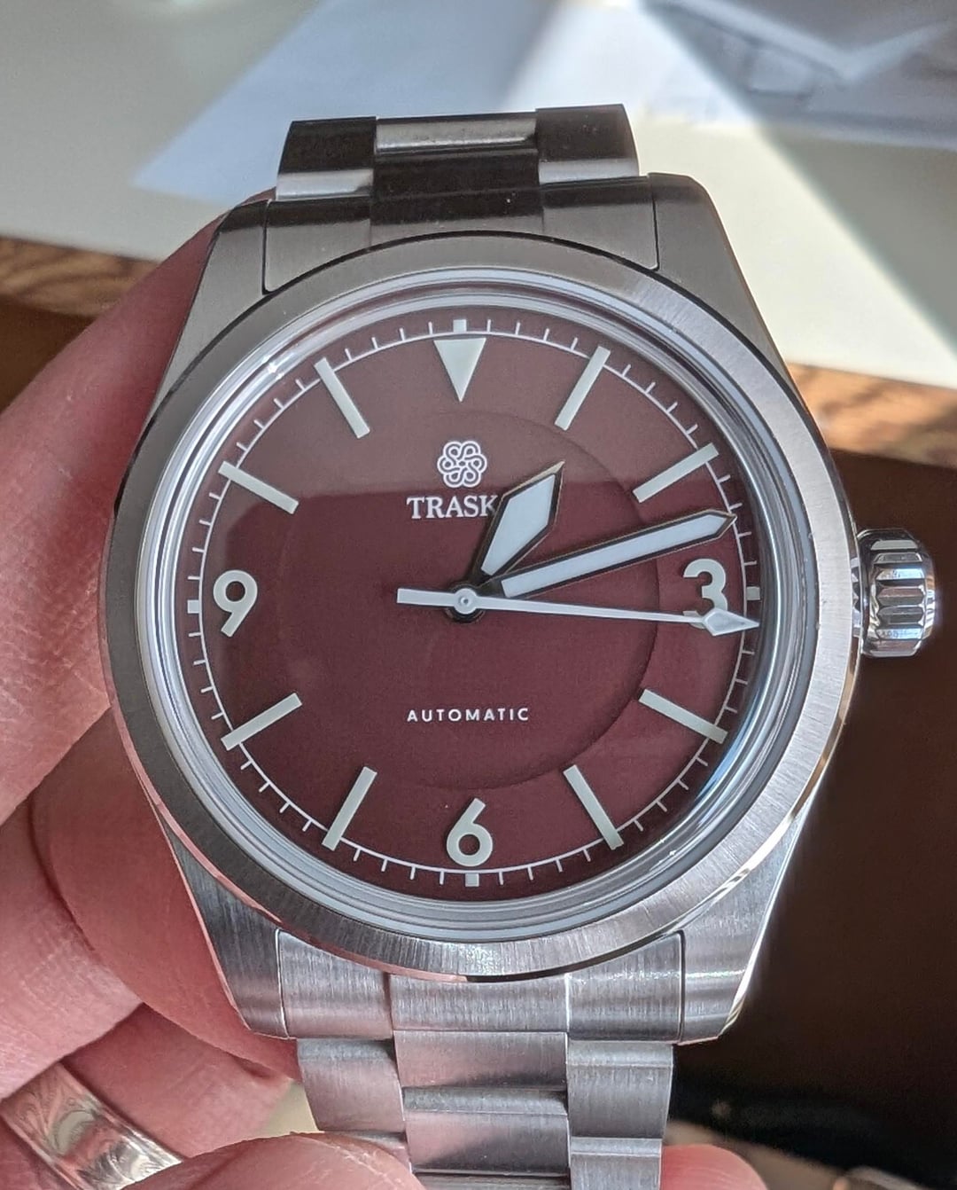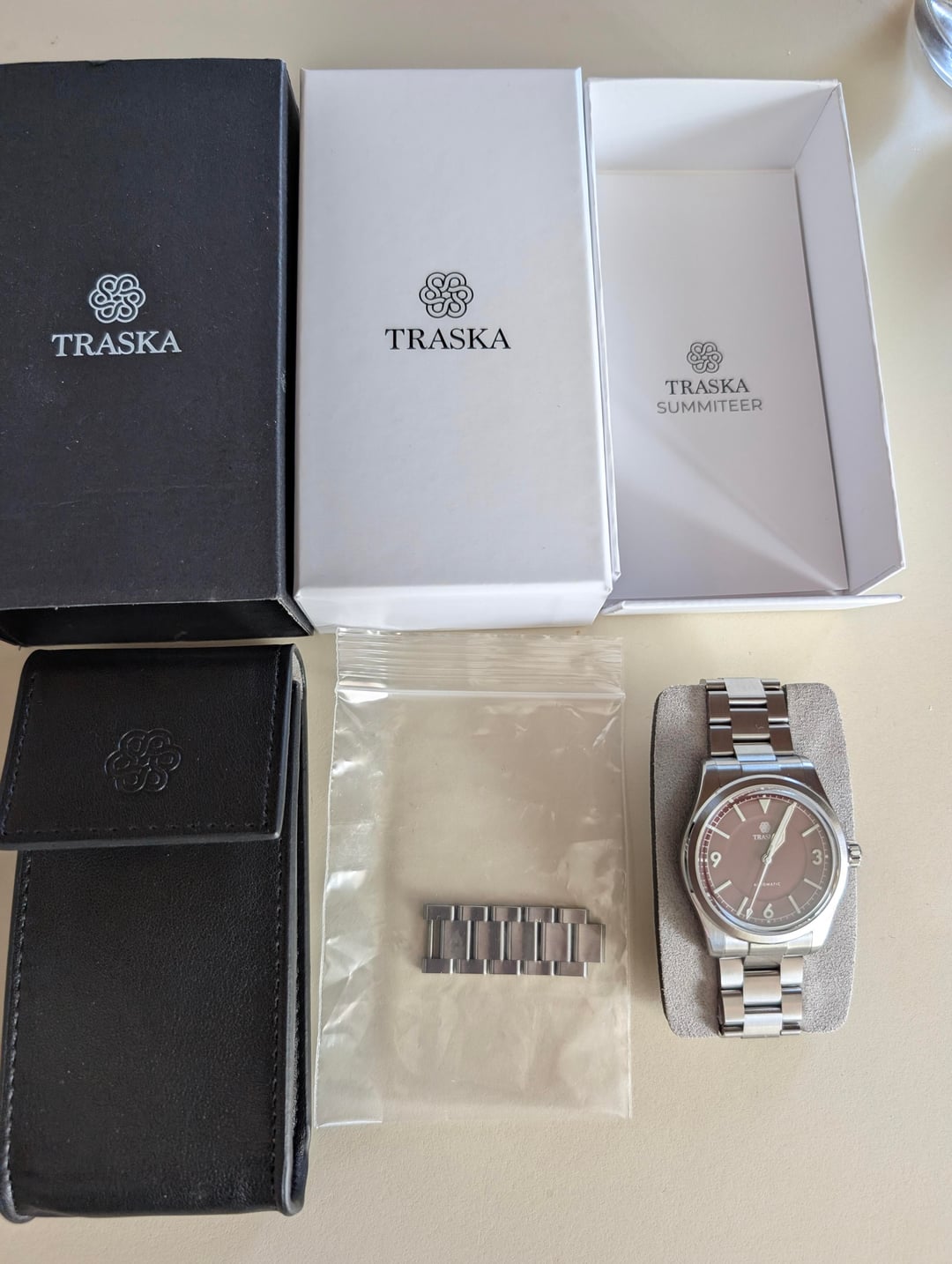 WTS Traska Summiteer 38mm Oxblood in excellent condition. Has the tooless quick adjust clasp. The scratch resistant coating is no joke: No scratches or dings that I have noticed. Even the clasp is pristine. This is reference 2195. Runs great, includes full kit. Would be happy to make a video or take additional pics upon request. Asking $480 Shipped CONUS, PayPal FF.