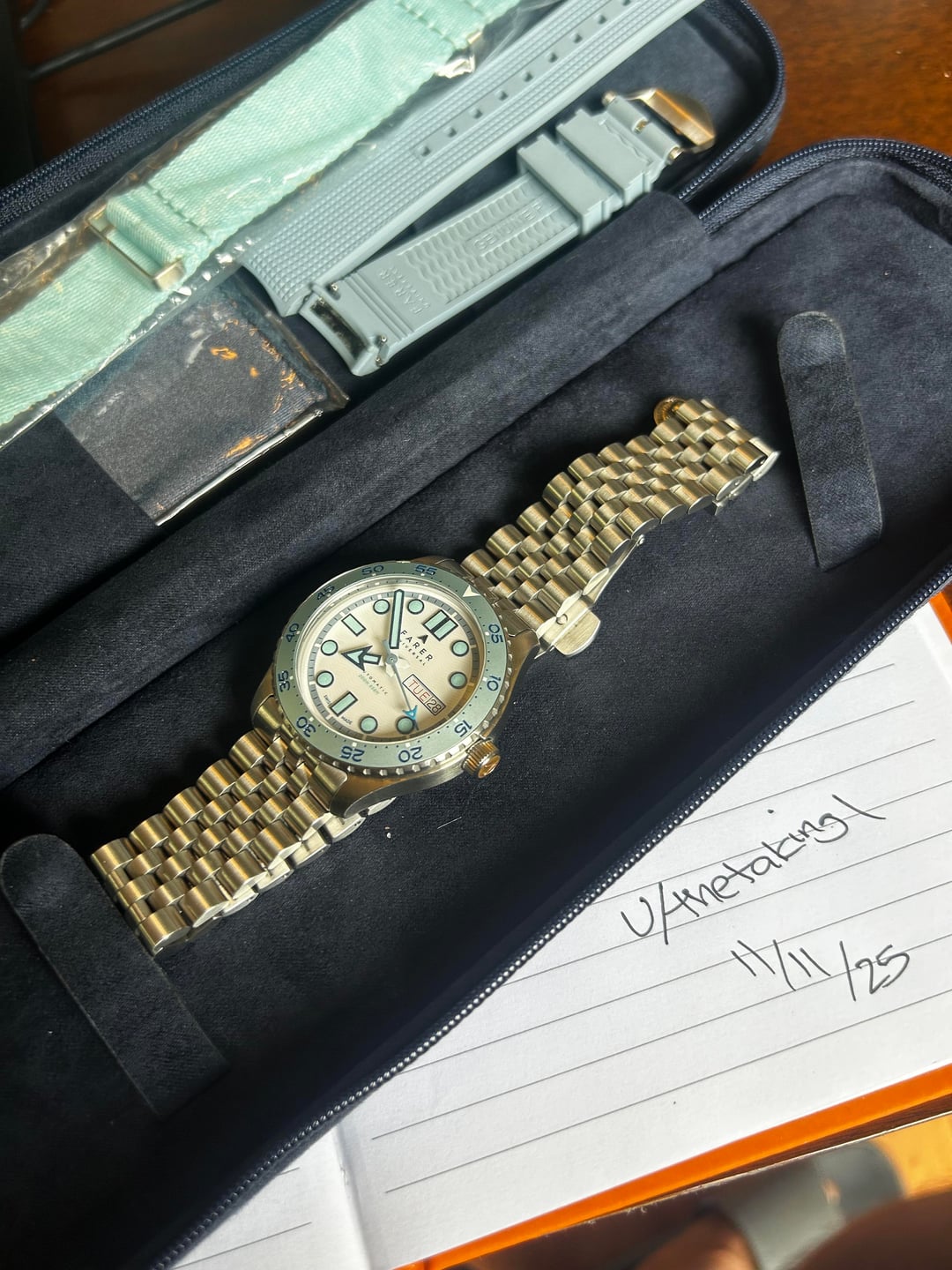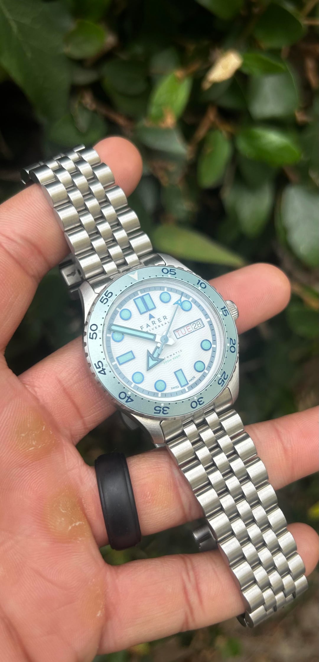 This one just oozes charm. The Farer Freshwater brings that signature Farer pop — the dial is crisp, lively, and totally different from anything else in your watch box. It’s got that playful British design DNA mixed with Swiss precision, and it just works. LOOK AT THAT LUME! Comes as a full kit, in good condition, and ready to brighten up any collection. Runs great, wears even better, and looks incredible in natural light. $795 + label costs, and I’ll pack it up with care. Open to fun trade offers, too — just no random microbrands I’ve never heard of.