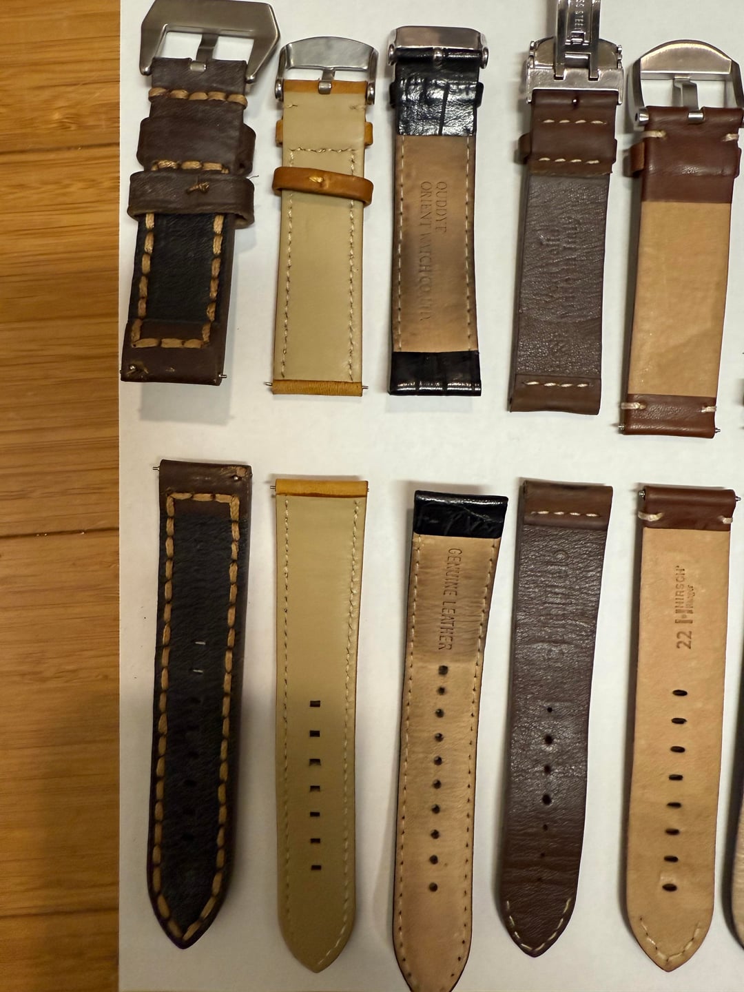 Hello, Downsizing strap collection. 16 Straps Total in various new or used condition, I want to sell as a bulk. Majority are 22mm double pass NATOS and Leather Straps, there is one orange 22mm rubber strap, one 24mm NATO Strap and two 20mm NATO Straps Various brands, including Barton, Steinhart, Blushark, NATO, Crown and Buckle, StrapCo $150 shipped OBO Zelle, Venmo, PayPal
