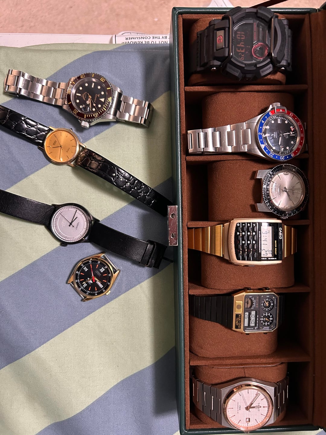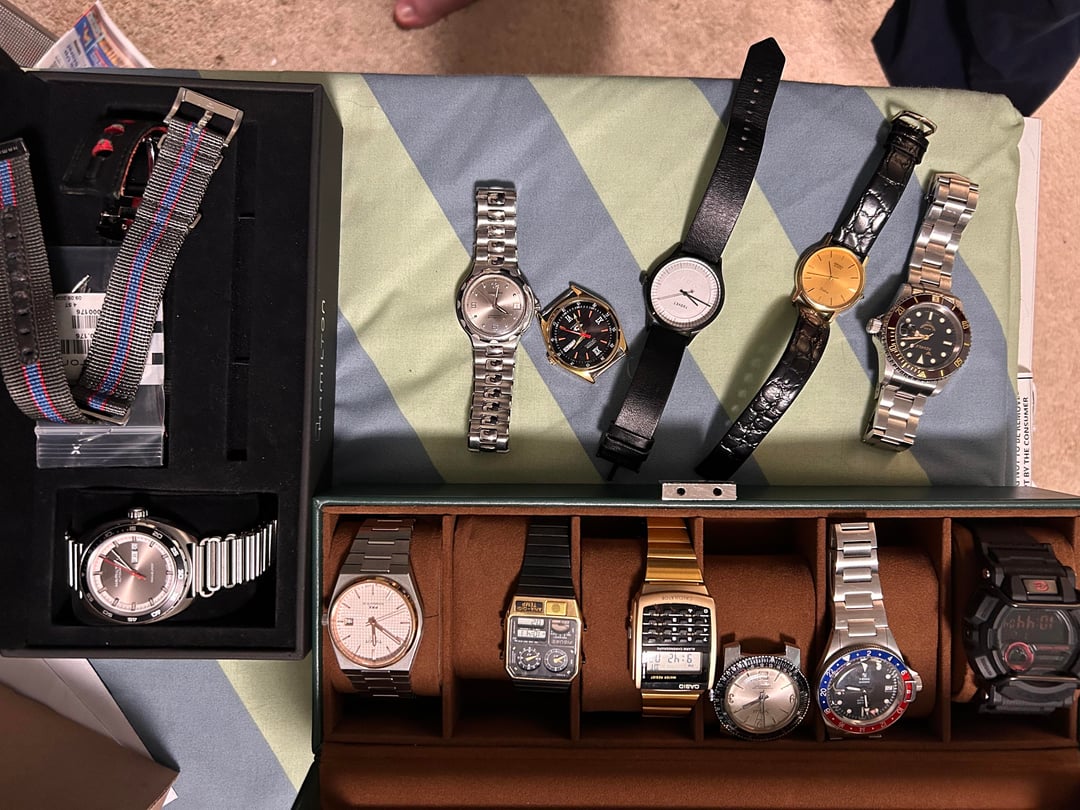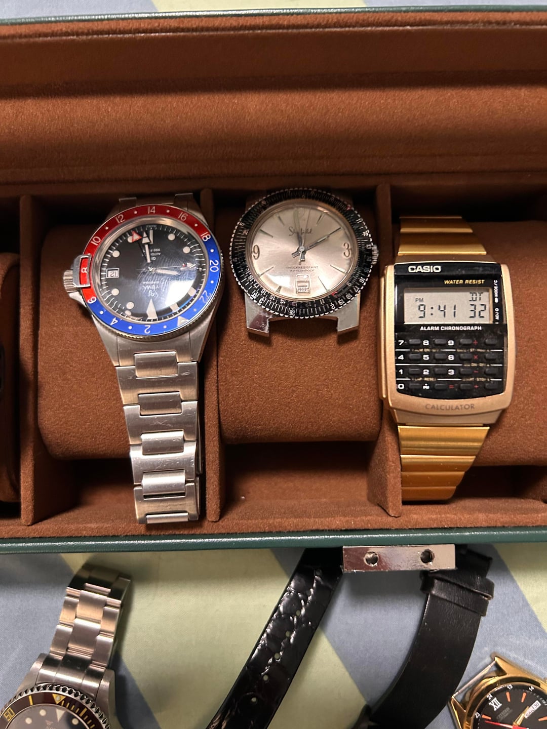 hello folks, looking to trade some of my overflowing watches away that I do not wear. not really sure what I want at the moment, I can post some rough ideas below though! brief rundown: a gshock(gd-400?). bought new on ebay, barely worn as it was a bit too big for my taste so I tend to reach for the classic box shaped one Yema superman gmt — bought on eBay, 2/100. seller said there was a problem with the GMT hand but turned out he just didn’t understand the gmt hand tracks the outer bezel vintage sheffield watch with slide rule bezel — from the 60s, another vintage find casio CA506 LE— i bought this new from amazon like a decade ago. lightly worn, mostly just your typical ‘desk scraped’ on the underside of the bracelet. i have the tin for this Figure/citizen ana-digi temp—import purchase, my understanding is that it is for the JDM tissot prx — y’all know about these i’m sure squale 1545 — when squale used to make sub knockoffs. hamilton khaki field 42 — I have the bracelet for this as well but i wore it on a strap primarily tsovet quartz jpt c036 — my first watch i bought probably 15 years ago; i replaced the battery last year hamilton pan europ 42mm gray — they discontinued these, I bought sometime a couple years ago from Japan when the exchange rate was favorable a random 70s citizen — cheap ebay find when i was looking for a fun 70s japanese watch early on all of these are operational, and have kept good time, but have not seen a lot of wear (most only a handful of times, the squale got a bit more). none have been serviced since i owned them but frankly i kinda went overboard buying watches so I got most of these in the last year and I just want to try to see what i can do here before dealing with ebay. I do have an ebay account with 100% positive feedback if that eases your concern and can message you there if you have questions about some 0 transaction guy I will post what i’m looking for (broadly) below EDIT: forgot about the seiko dolce. had the battery replaced a year ago, great little quartz watch. some of the indicted appear to have fallen off at some point which i did not notice for a long time, as it’s honestly hard to tell until you point it out. very neat watch, insanely thin