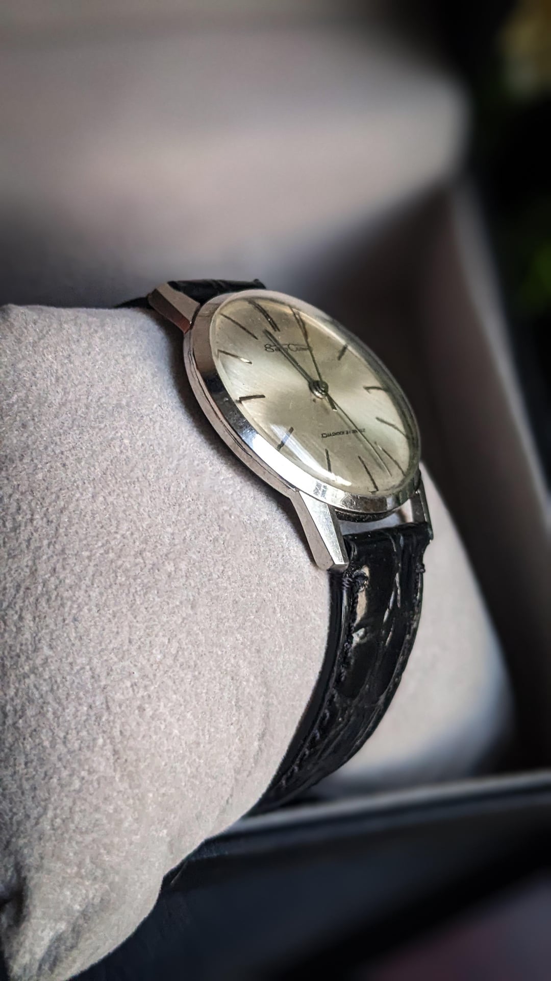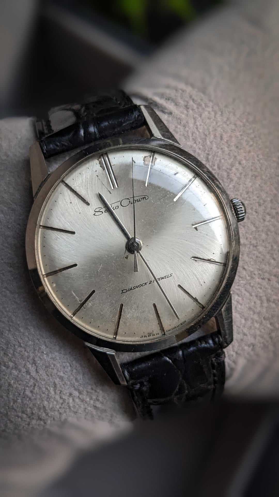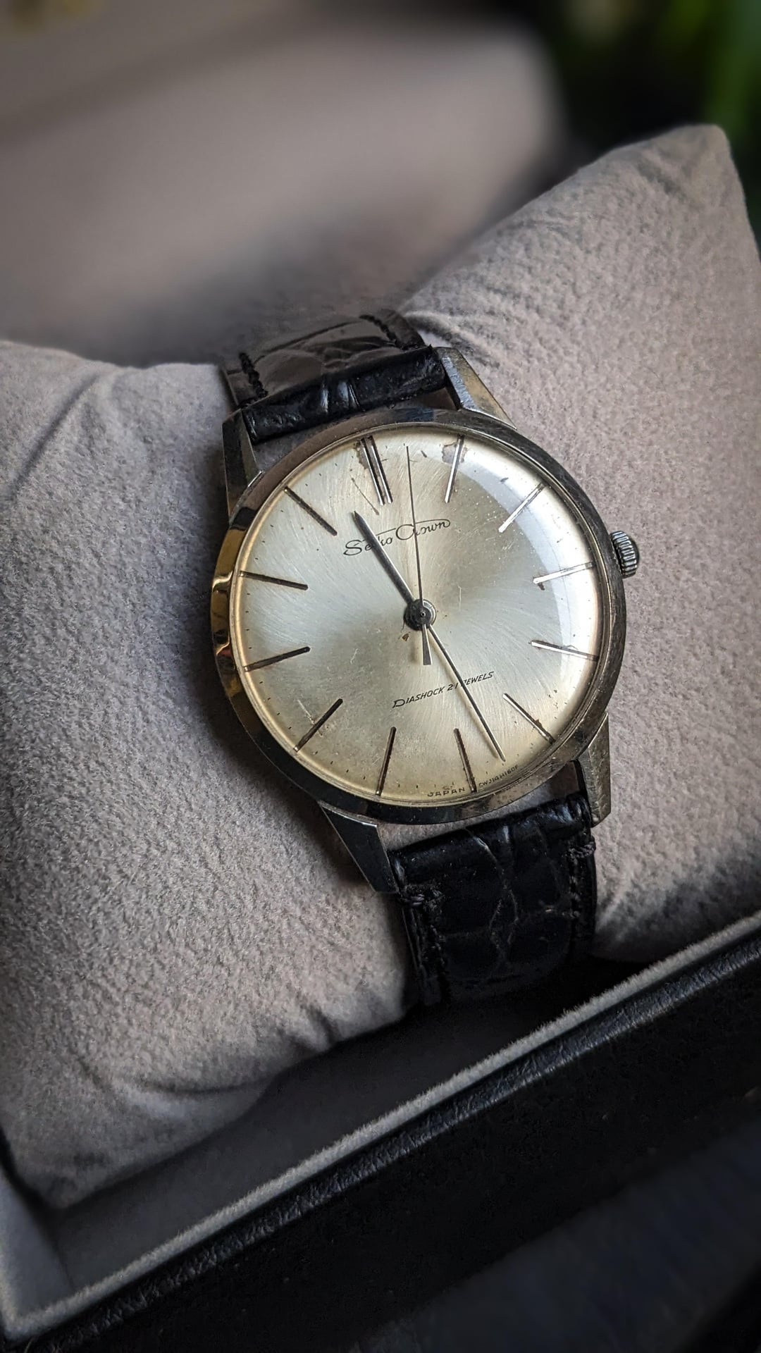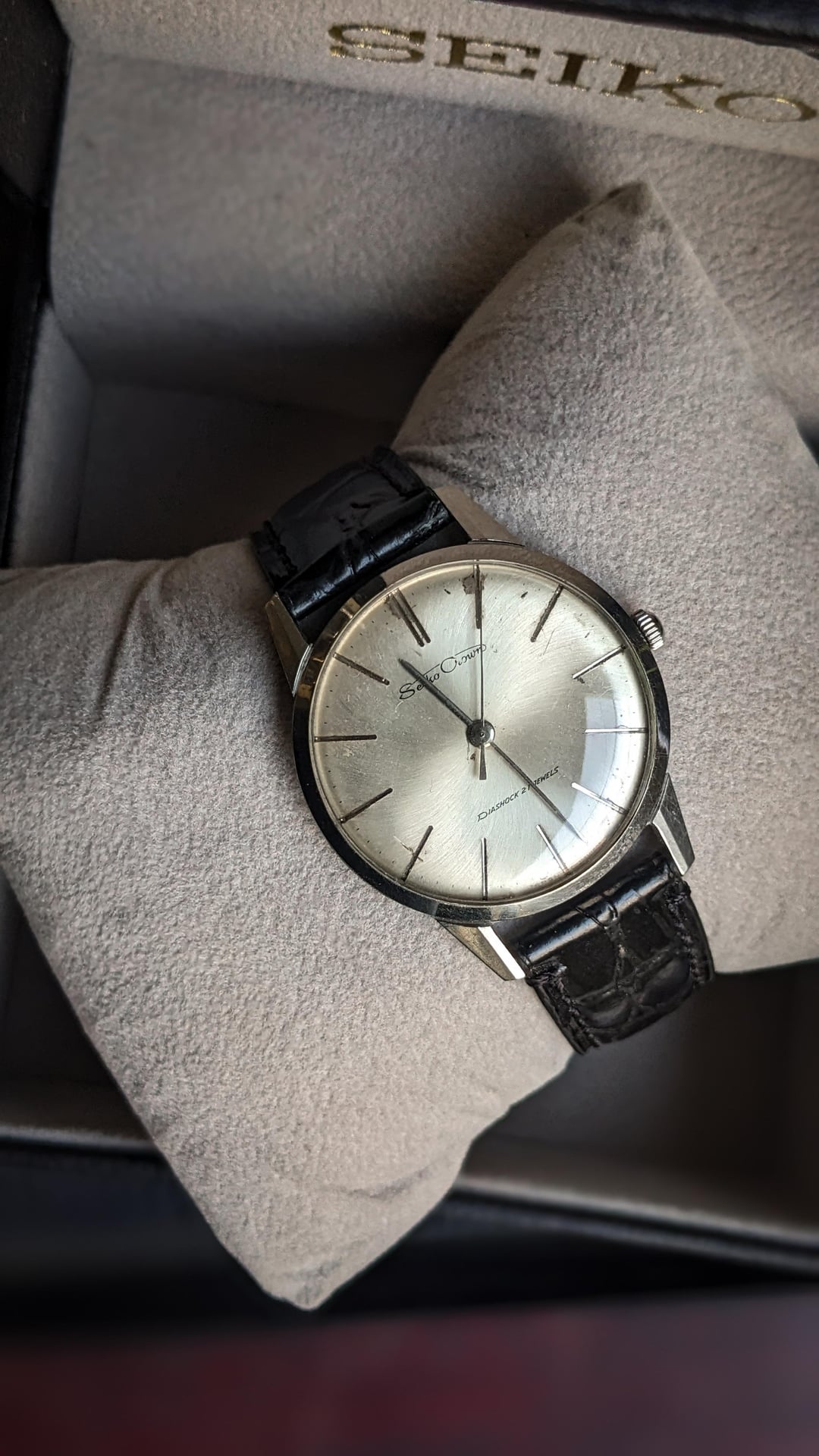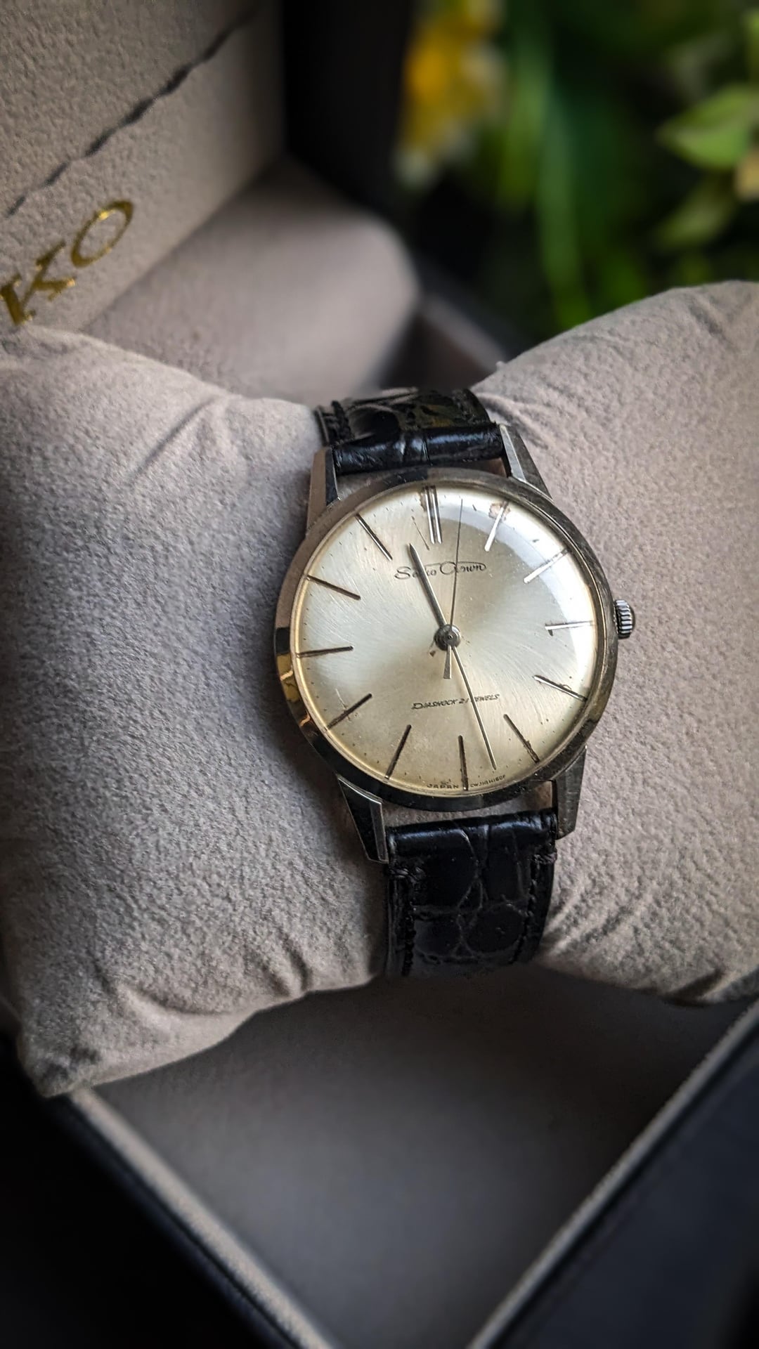 Hello watchfam, This is a vintage Seiko Crown J14065 men’s wristwatch, a classic example of Seiko’s early mechanical craftsmanship from the 1960s. Powered by a 21-jewel manual winding movement, this timepiece showcases Seiko’s dedication to precision engineering before the rise of automatic and quartz eras. The watch features a stainless steel case with a polished finish and elegant lugs, paired with a silver sunburst dial and applied indices. The minimalist dial design reflects the refined aesthetics typical of Seiko’s Crown series , understated yet sophisticated. The in-house Seiko 21-jewel manual movement runs smoothly and keeps good time for daily Usage (not serviced). The acrylic crystal is clear with minor age marks, and the case retains its sharp vintage profile. Details: Brand: Seiko Model: Crown J14065 Movement: Manual winding, 21 jewels Case: Stainless steel Dial: Silver with applied hour markers Crystal: Acrylic Era: 1960s Condition: Vintage used, working well Strap : aftermarket Price: $295 Timestamp: https://imgur.com/a/k70x0Wc