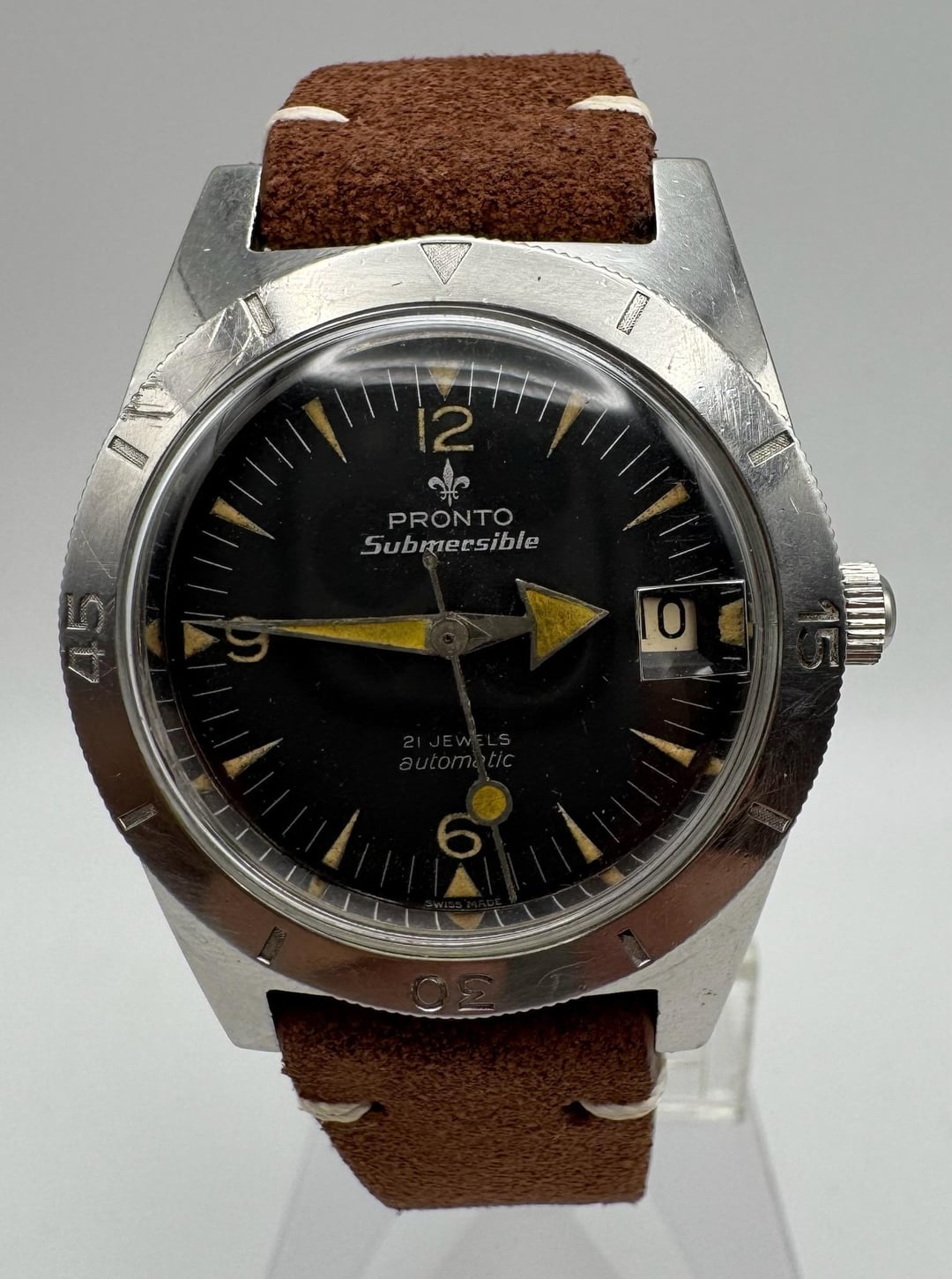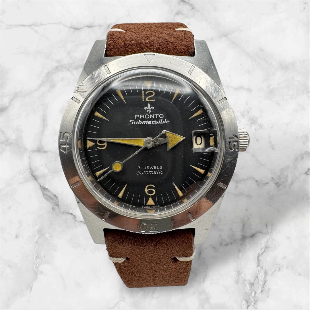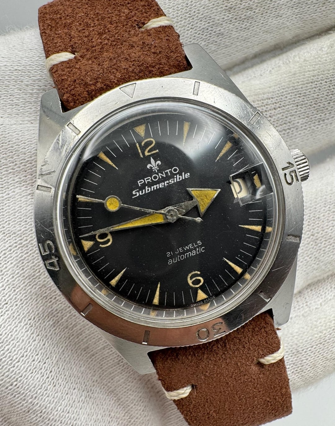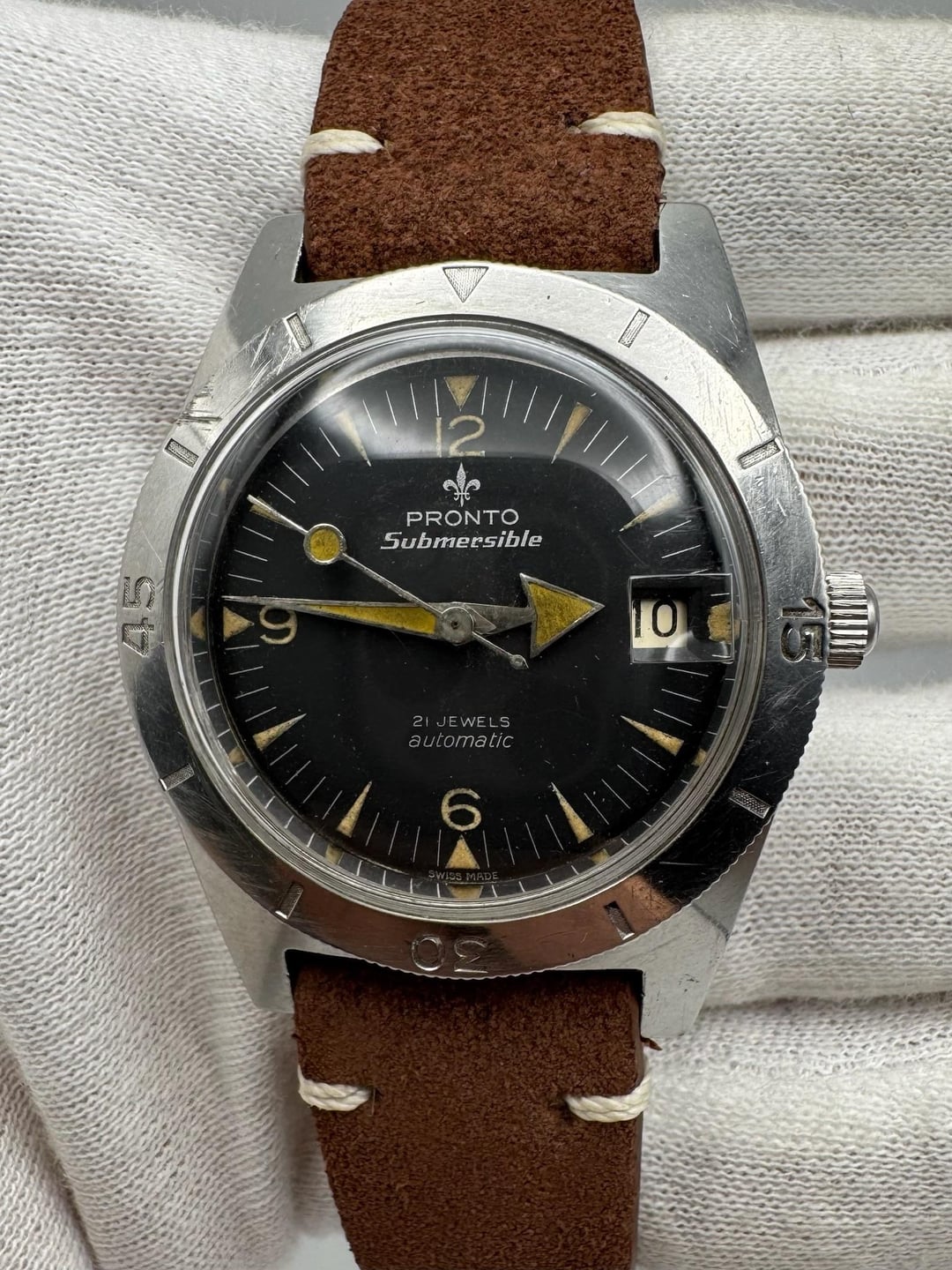 Vintage 1960’s Pronto Submersible Steel in Original Condition This 1960’s Pronto Submersible presents a wonderful example of a well-preserved vintage dive watch. The stainless steel case appears unpolished, showcasing honest wear with visible scratches and light marks that add character and authenticity. Its original black tritium dial has developed a beautiful warm yellow patina on the indices, perfectly complemented by the matching broad arrow hands. While the movement’s service history is unknown, the watch remains in very nice overall condition for its age. Measuring 36x46mm, it wears comfortably on the wrist and captures the compact proportions typical of vintage divers. Fitted on a new 19/16mm brown leather strap, this Pronto Submersible stands as a distinctive and attractive piece from the golden era of tool watches. **Size:** 36mm **Year:** 1960s 📜 Includes: No box or papers 💵 Price: $965 + FREE overnight shipping with FedEx fully insured. [Timestamp](https://imgur.com/a/22GSBPZ) 🔥 Follow us on [Instagram](https://www.instagram.com/bogossiajewelers) 📍 Location: New York 🔒 Authenticity: 100% guaranteed, buy with confidence. We have 150+ reviews on Chrono24 with 180+ transactions, and Excellent rating score on Trustpilot. Visit our [profile](https://www.reddit.com/u/BoghossianJewelry/s/vm81HAdB7o) for links and references. 📦 Domestic Shipping: Ships with FedEx overnight, within 24 business hours of payment, from New York, NY to CONUS. The shipment is fully insured against damage, loss or theft. 🌍 International Shipping: Incurs an additional $100. 💳 Payment: PayPal/CC (+4%), Web, or Face-to-face deal in NY. 🔐 [Seller References](https://bogossia.com/authenticity) 🔗 [Other Listings](https://www.reddit.com/u/BoghossianJewelry/s/vm81HAdB7o) 📸 [IG: @bogossiajewelers](https://www.instagram.com/bogossiajewelers)