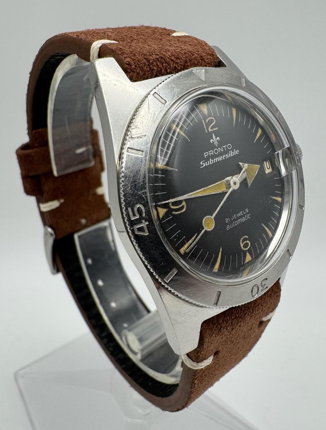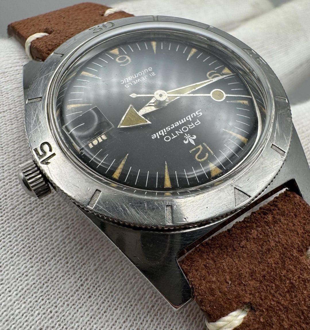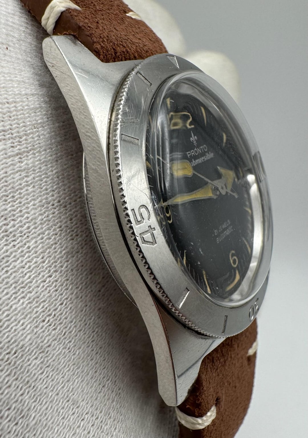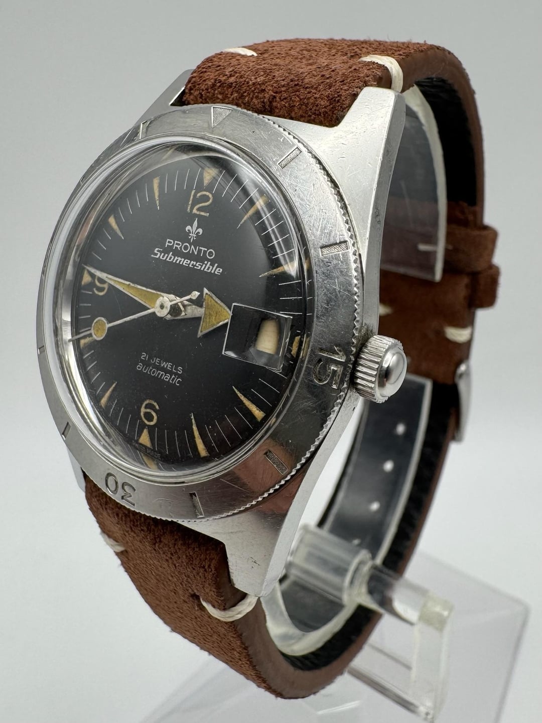 Vintage 1960’s Pronto Submersible Steel in Original Condition This 1960’s Pronto Submersible presents a wonderful example of a well-preserved vintage dive watch. The stainless steel case appears unpolished, showcasing honest wear with visible scratches and light marks that add character and authenticity. Its original black tritium dial has developed a beautiful warm yellow patina on the indices, perfectly complemented by the matching broad arrow hands. While the movement’s service history is unknown, the watch remains in very nice overall condition for its age. Measuring 36x46mm, it wears comfortably on the wrist and captures the compact proportions typical of vintage divers. Fitted on a new 19/16mm brown leather strap, this Pronto Submersible stands as a distinctive and attractive piece from the golden era of tool watches. **Size:** 36mm **Year:** 1960s 📜 Includes: No box or papers 💵 Price: $965 + FREE overnight shipping with FedEx fully insured. [Timestamp](https://imgur.com/a/22GSBPZ) 🔥 Follow us on [Instagram](https://www.instagram.com/bogossiajewelers) 📍 Location: New York 🔒 Authenticity: 100% guaranteed, buy with confidence. We have 150+ reviews on Chrono24 with 180+ transactions, and Excellent rating score on Trustpilot. Visit our [profile](https://www.reddit.com/u/BoghossianJewelry/s/vm81HAdB7o) for links and references. 📦 Domestic Shipping: Ships with FedEx overnight, within 24 business hours of payment, from New York, NY to CONUS. The shipment is fully insured against damage, loss or theft. 🌍 International Shipping: Incurs an additional $100. 💳 Payment: PayPal/CC (+4%), Web, or Face-to-face deal in NY. 🔐 [Seller References](https://bogossia.com/authenticity) 🔗 [Other Listings](https://www.reddit.com/u/BoghossianJewelry/s/vm81HAdB7o) 📸 [IG: @bogossiajewelers](https://www.instagram.com/bogossiajewelers)