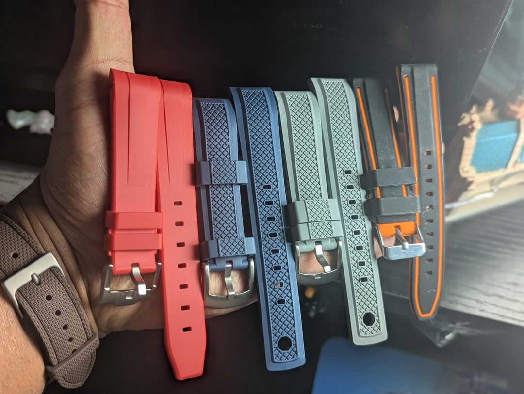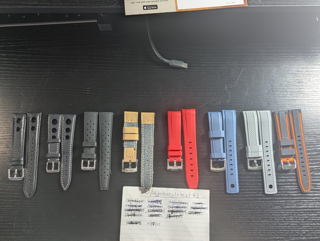 Hi all! As the title says. Selling all these 9 straps for a very reasonable price of **$49 shipped** (within the USA)! **They are all 20mm and standard length and New/Like New** Here's a link to the Seiko Strap. Comes with the Kamen Rider: https://www.theseikoguy.com/seiko-5-sports-kamen-rider-2024/ All other straps are unbranded but of good quality! **- Seiko Kamen Rider Rally** **- Navy Leather Rally Strap** **- Black Tropic Style FKM** **- Grey/Tan Canvas Leather Hybrid** **- Red Fitted Fkm for Moonswatch/Speedmasters** **- Blue and Grey fkms** **- Black/Yellow Silicone** Happy to answer questions! **Check out my other straps for sale!**