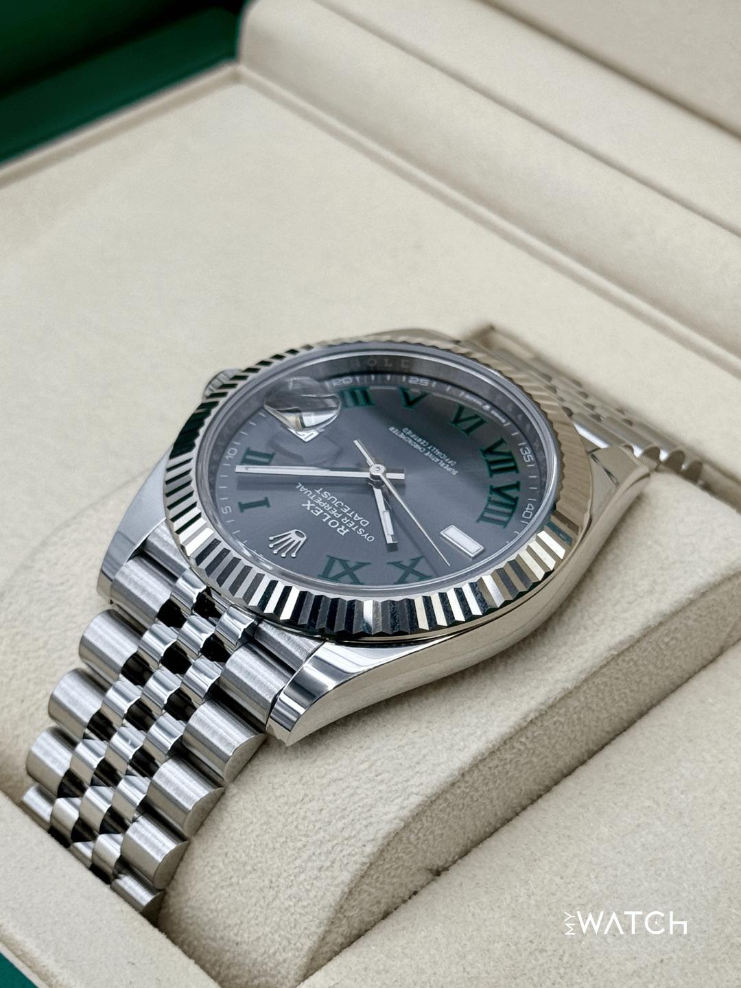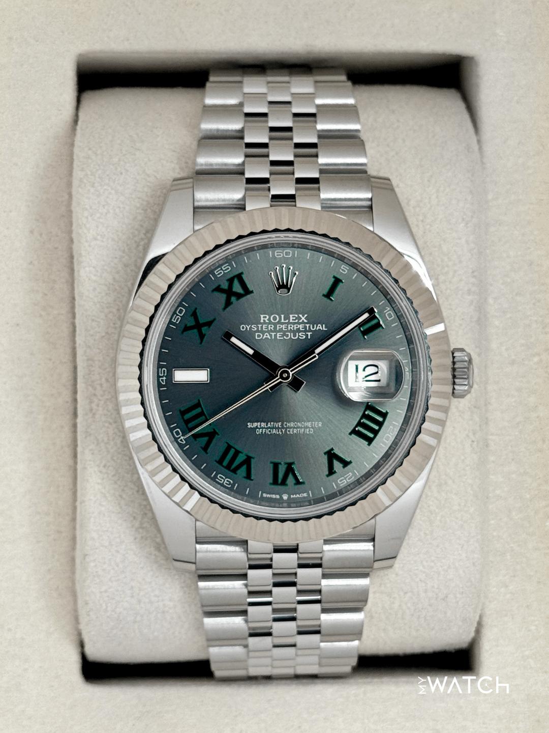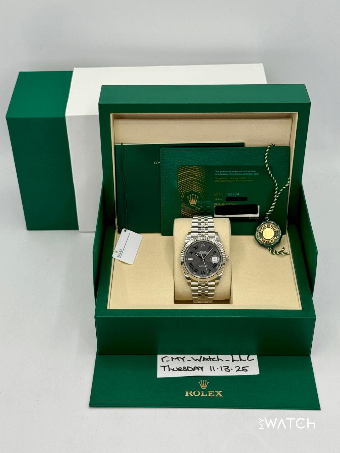 🔵**2025 Rolex Datejust 41mm 126334 Stainless Steel and 18kt White Gold Fluted Bezel Jubilee Bracelet Wimbledon Dial** 🔵**TRADE or SELL us your luxury watch, all brands considered. Message me details.** **Includes the following:** **✔️BRAND NEW 2025 UPDATED ROLEX DOUBLE BOXED (NOT PICTURED)** **✔️Box and Papers - Yes** **✔️Warranty card dated May 2025** **✔️Manual and Warranty booklets** **✔️Green and White Hang Tags** **✔️Material: Oystersteel and 18K White Gold Fluted Bezel** **✔️Size: 7.75inch Wrist (Full Links)** **✔️Watch is in excellent overall condition. Please see photos for details.** **✔️**[**Trades**](https://mywatchllc.com/pages/sell-rolex-watch) **welcome** Business Name: **My Watch LLC** LOCATION: Oak Park, Michigan ✔️[MyWatchLLC.com](http://mywatchllc.com/) for current inventory ✔️Google Business Listing [https://g.co/kgs/Cmd6FPW](https://g.co/kgs/Cmd6FPW) ✔️Business Hours M-F 9-6 ✔️Facetime/Video chat/calls welcome to view the watch interested. ✔️Contact: 248-422-0909 via text or call for quickest response. 🟢TERMS: Visit [MyWatchLLC.Com](http://mywatchllc.com/) for payments accepted 🟢REFERENCES/REVIEWS: We are well reviewed on all platforms from google, trust pilot, rolexforums, additionally we have 300+ reference in multiple FaceBook watch groups, reference checks welcome. 🟢SHIPPING: If you are not local, we offer Fully Insured FedEx overnight shipping in the USA for a fee. International shipping available.