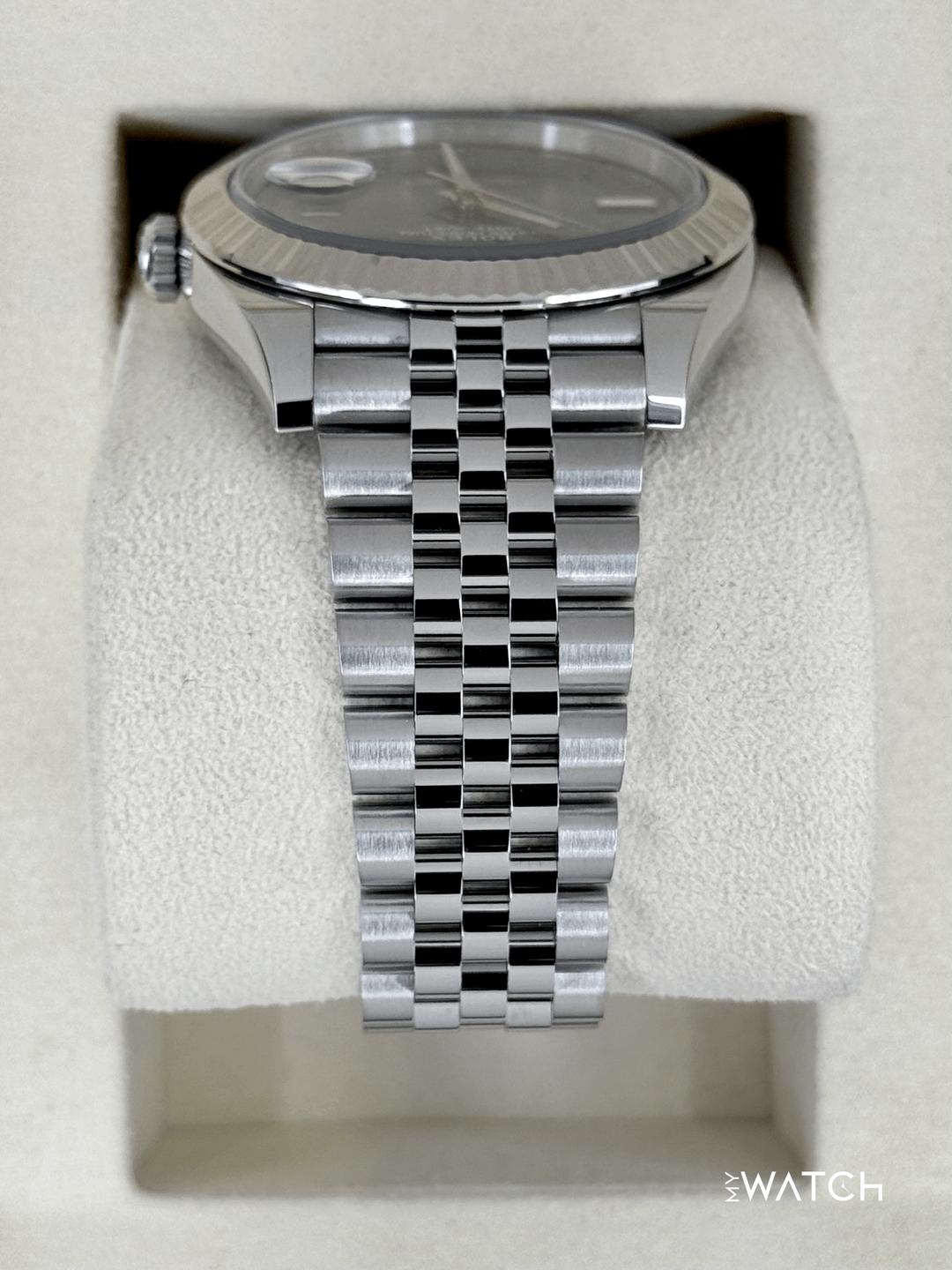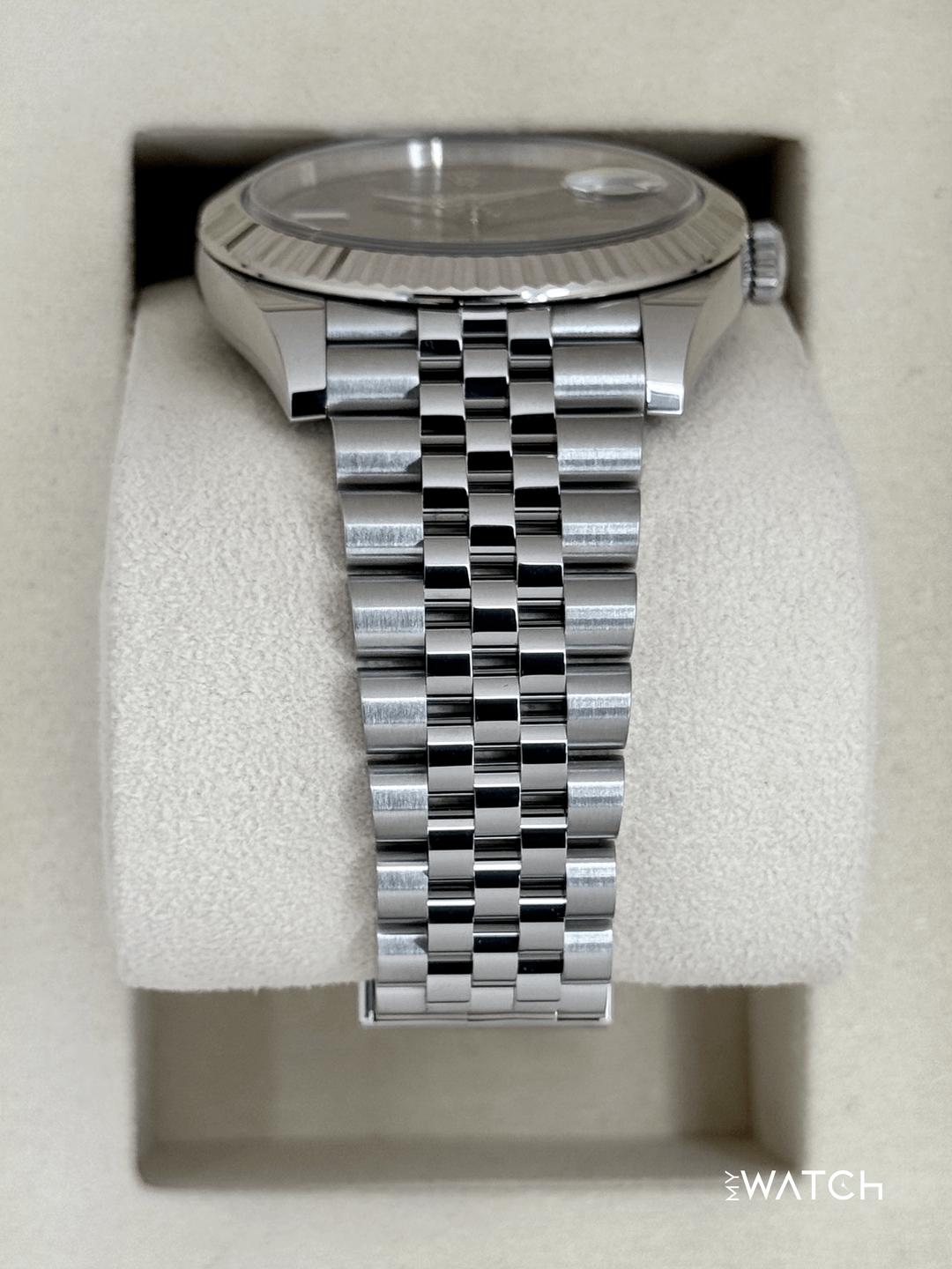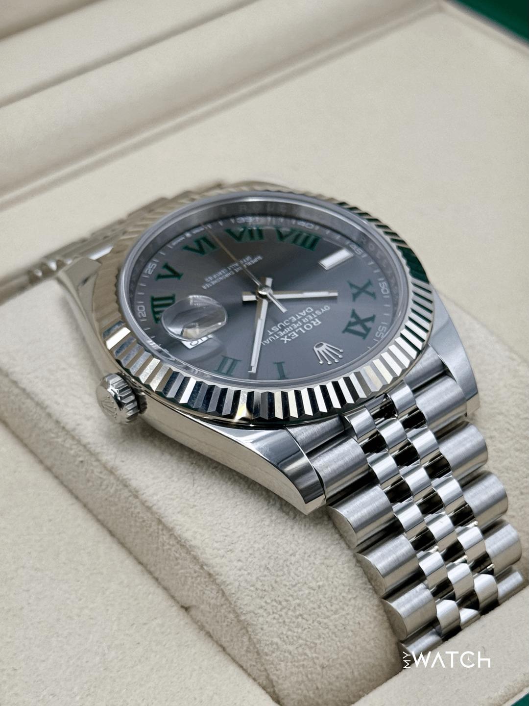 🔵**2025 Rolex Datejust 41mm 126334 Stainless Steel and 18kt White Gold Fluted Bezel Jubilee Bracelet Wimbledon Dial** 🔵**TRADE or SELL us your luxury watch, all brands considered. Message me details.** **Includes the following:** **✔️BRAND NEW 2025 UPDATED ROLEX DOUBLE BOXED (NOT PICTURED)** **✔️Box and Papers - Yes** **✔️Warranty card dated May 2025** **✔️Manual and Warranty booklets** **✔️Green and White Hang Tags** **✔️Material: Oystersteel and 18K White Gold Fluted Bezel** **✔️Size: 7.75inch Wrist (Full Links)** **✔️Watch is in excellent overall condition. Please see photos for details.** **✔️**[**Trades**](https://mywatchllc.com/pages/sell-rolex-watch) **welcome** Business Name: **My Watch LLC** LOCATION: Oak Park, Michigan ✔️[MyWatchLLC.com](http://mywatchllc.com/) for current inventory ✔️Google Business Listing [https://g.co/kgs/Cmd6FPW](https://g.co/kgs/Cmd6FPW) ✔️Business Hours M-F 9-6 ✔️Facetime/Video chat/calls welcome to view the watch interested. ✔️Contact: 248-422-0909 via text or call for quickest response. 🟢TERMS: Visit [MyWatchLLC.Com](http://mywatchllc.com/) for payments accepted 🟢REFERENCES/REVIEWS: We are well reviewed on all platforms from google, trust pilot, rolexforums, additionally we have 300+ reference in multiple FaceBook watch groups, reference checks welcome. 🟢SHIPPING: If you are not local, we offer Fully Insured FedEx overnight shipping in the USA for a fee. International shipping available.