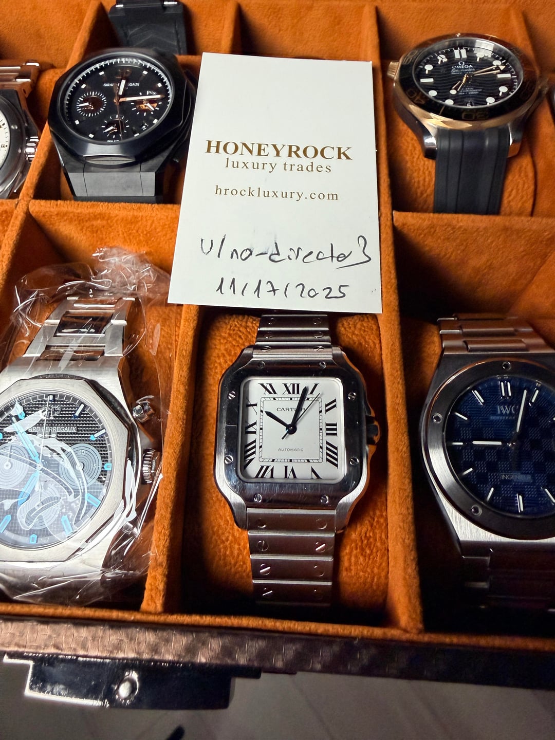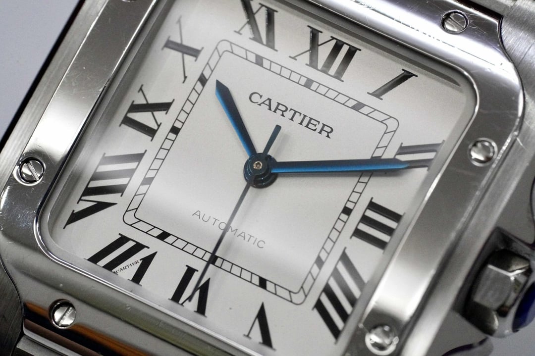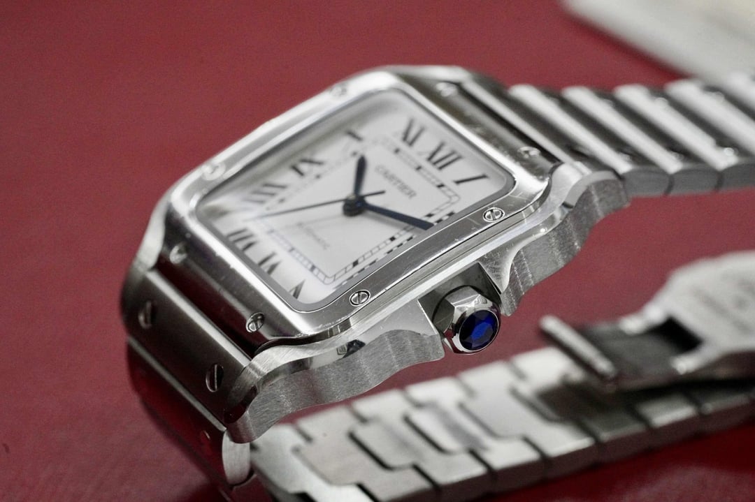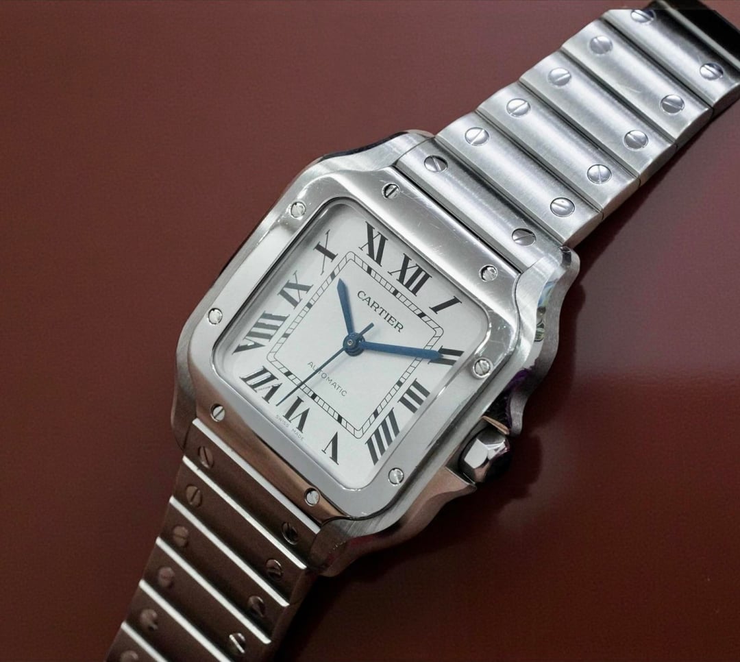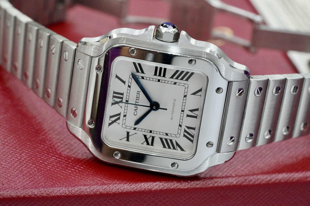 Cartier Santos de Cartier Medium – WSSA0010 - 35mm White Dial 2020 • Full Set • Very Good Condition Price: $5750 The Santos de Cartier Medium (ref. WSSA0010) is one of Cartier’s most iconic modern steel models — perfectly balanced at 35.1 mm with the signature squared case and exposed bezel screws. This 2020 example comes as a full set and remains in very good condition, with only light, normal wear. Bracelet is missing one link. Key Details • Brand: Cartier • Model: Santos de Cartier Medium • Reference: WSSA0010 • Year: 2020 • Set: Full Set (box, papers) • Case Size: 35.1 mm • Case Thickness: ~8.8 mm • Case Material: Stainless Steel • Dial: Silver Opaline • Crystal: Sapphire • Movement: Automatic Cartier Calibre 1847 MC • Bracelet: Stainless Steel (SmartLink) — missing 1 link • Additional Strap: Includes Cartier QuickSwitch leather strap (if applicable for your set — you tell me) • Water Resistance: 100M Condition • Very good condition overall • Dial + crystal are mint • Case and bezel show light signs of careful wear • Movement runs strong and keeps excellent time Notes • Popular medium size — ideal unisex • Full set 2020 with strong resale value • Missing only one link from bracelet