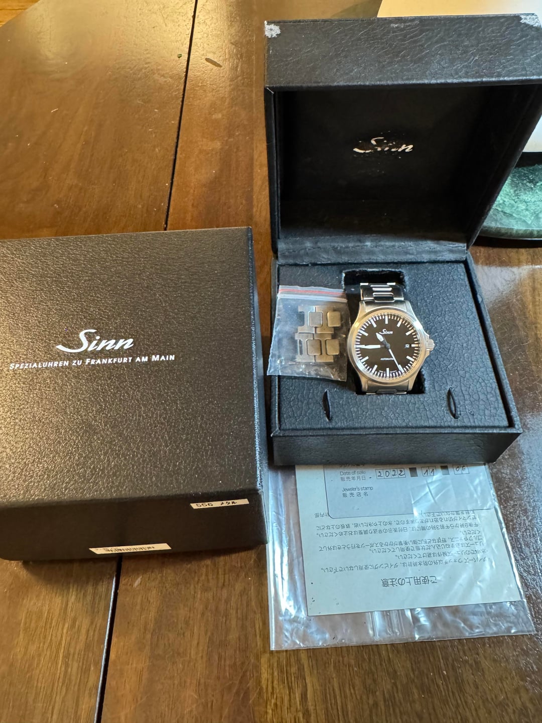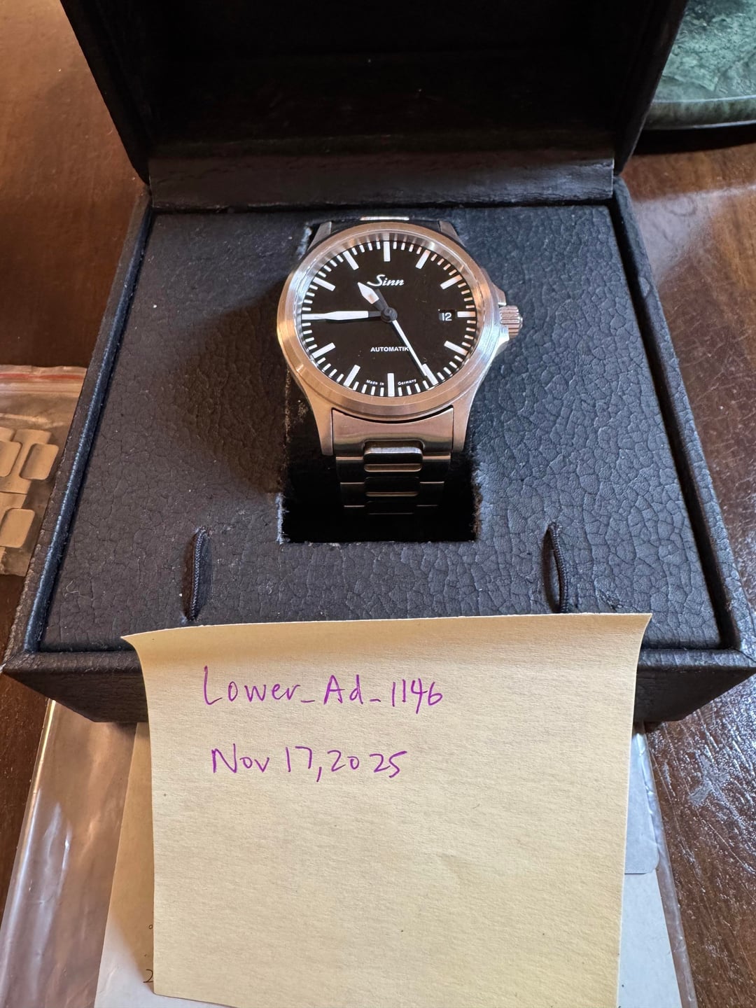 Selling my Sinn 556i, originally dated Nov 6, 2022. I purchased it off WatchExchange and have worn it lightly in rotation. It’s in very good condition with typical signs of careful use. Full kit included. Condition - Case: Very good — clean overall, no major dings - Crystal: Perfect, no scratches - Dial/Hands: Excellent - Bracelet: Minor hairline scratches from normal wear - Clasp: Some visible desk-diving scratches - Caseback / Movement: Clean, running well, no issues What’s Included - Full kit: inner box, outer box, manual, warranty card - Papers dated Nov 6, 2022 - Bracelet sized for ~6.5” wrist - Four (4) extra links included Specs - 38.5mm diameter - 45.5mm lug-to-lug - 11mm thick Shipping & Payment - $1,350 shipped CONUS (insured) - Payment via Zelle / Venmo / PayPal F&F - Not looking for trade