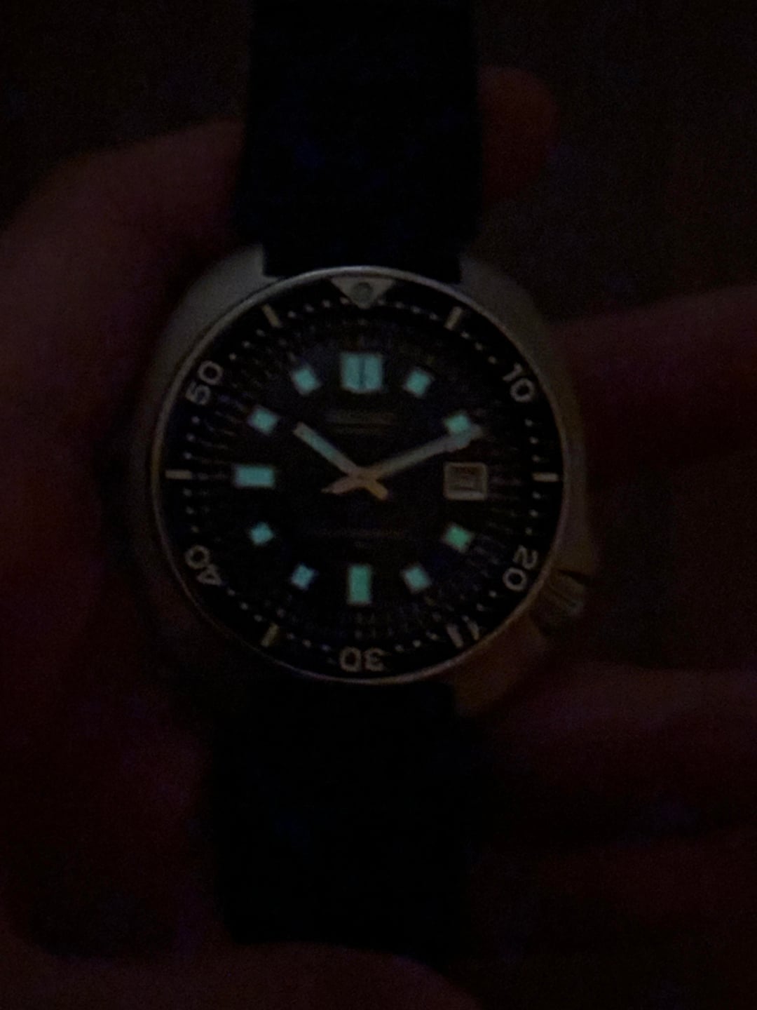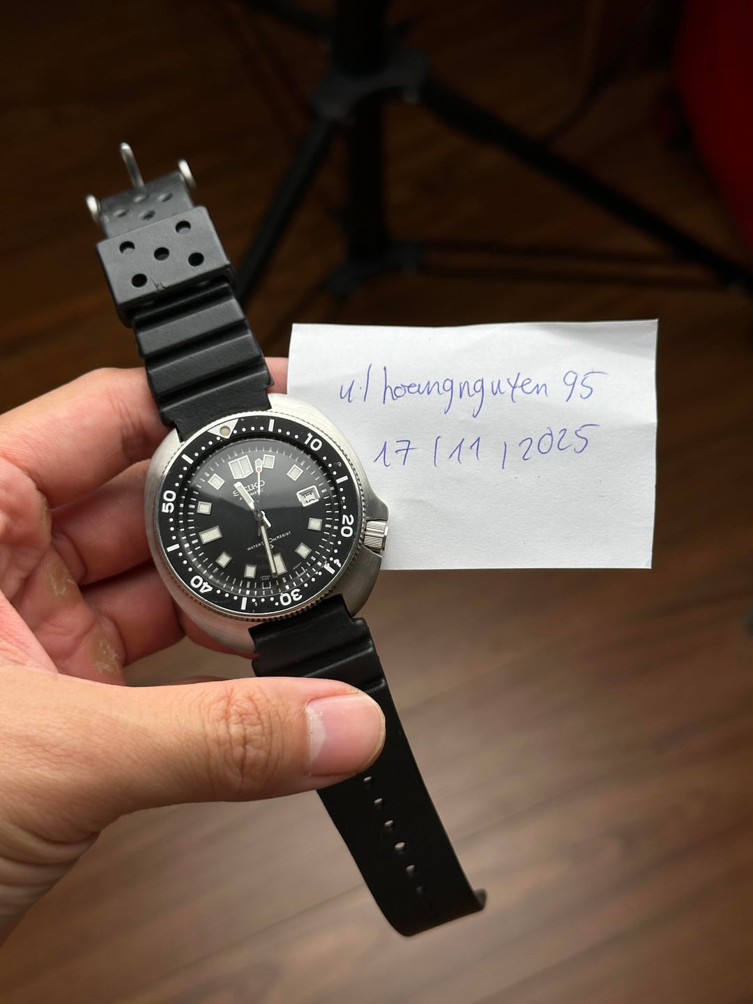 Up for sale is the 1975 Seiko Captain Willard 6105-8110 in good serviced condition Images: https://drive.google.com/drive/folders/1MrrahemvE5cjb13DjSzaLX2YTbgt3C3G Video: https://drive.google.com/file/d/1mMz5eWhBnEJri8Ls8iuvGhlKcv6ZszUL/view?usp=drivesdk Timestamp: https://drive.google.com/file/d/1O9q5Vom_nKv-BbW5K-uWJNEM7moq8DaJ/view?usp=drivesdk The Seiko 6105 “Captain Willard,” is one of the most iconic vintage dive watches Seiko ever produced — not only for its history on the wrist of Martin Sheen in Apocalypse Now, but for the important place it holds in Seiko’s evolution as a true dive-watch manufacturer. The 6105 was Seiko’s second-generation diver, produced from 1968 to 1977. It kept the 150m water resistance of the original 62MAS but introduced key upgrades, including the higher-beat 21,600 bph movement. This example features the hacking 6105B movement (automatic, no hand-winding), along with the original friction-fit bi-directional bezel typical of the era. The case is the instantly recognizable asymmetrical cushion shape — the design that eventually inspired the modern “Turtle.” Measuring 44mm across with a very wearable 47.5mm lug-to-lug, it wears far better than the numbers suggest. The curved crown guard flows into the case and protects the locking crown, giving the watch its trademark silhouette. A Seiko Hardlex crystal completes the rugged dive-tool look. The dial is classic vintage Seiko diver: matte black, bold rectangular indices, double marker at 12, and the shovel-style seconds hand that mirrors the top index. Everything is generously lumed and retains excellent readability. The framed date at 3 keeps the display balanced and true to the original layout. This example remains in great condition, showing light wear consistent with age with no dents. Case and caseback shows well-preserved shapes. The dial is clean with no patina or scratches, second hand can see some light marks. Crystal is clean and in great shape. It comes fitted on Seiko Rubber band. The watch has been serviced and it currently keeps great time at +/-5s a day. Although the watch doesn’t come with original box and papers, a standard watch box will be provided upon receive. Price: $1700 + $60 flat shipping (via DHL/UPS express with tariffs/duty fee covered). Payment via PayPal F&F or G&S (+4.6% fee covered by the buyer). Not accepting trades. Feel free to message me with any questions or if you're interested. Have a great day! Check out my other watches on Instagram: @jasonswatchcorner