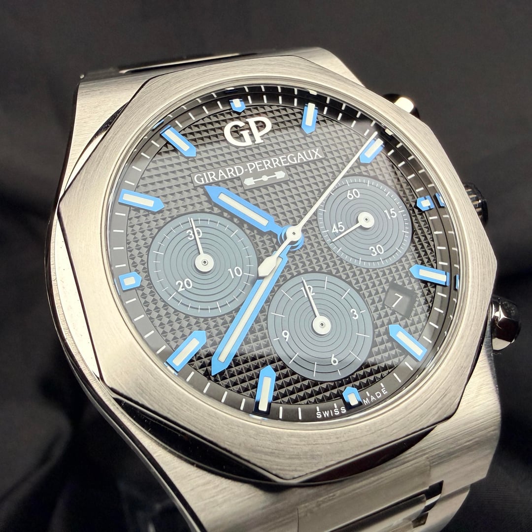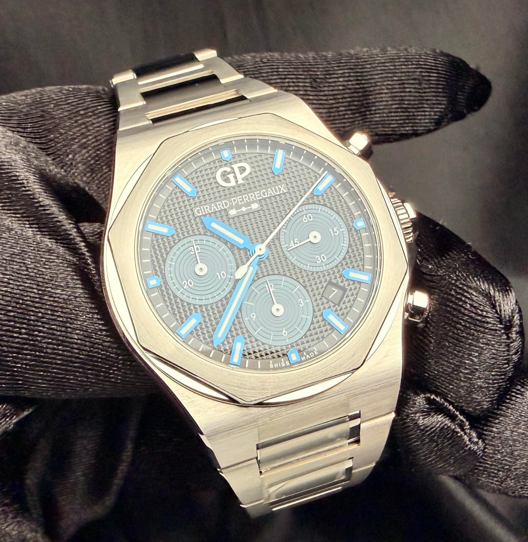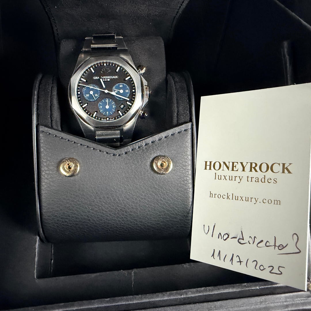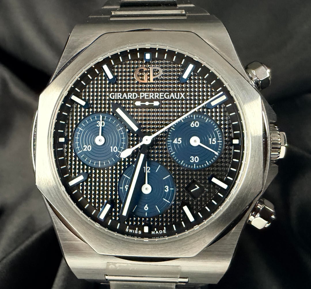 Girard-Perregaux Laureato Chronograph 42mm Ref. 81020-11-631-11A — 2025 — Brand New, Unworn, Fully Stickered — Full Set** A standout in the world of integrated-bracelet chronographs, the Laureato Chronograph combines heritage, high horology, and modern engineering in a way few sports watches can. This 2025 example is brand new, factory-fresh, fully stickered, unworn, and delivered exactly as purchased from the boutique. MSRP is $19,500 + tax, making this a superb value for collectors seeking a flawless, untouched example. Price: $11750 ⸻ Highlights • 2025 Boutique Purchase — Brand new, unworn, full stickers intact • Full Set — Box, outer box, manuals, warranty card • Screw-down chronograph pushers + screw-down crown (transcript confirmation: pushers are fully screwed in / locked) • Beautiful navy-blue hobnail dial with sunken registers • Integrated steel bracelet crafted entirely with screws (no cheap pin sleeves like PP Aquanaut) • Vertical-clutch chronograph engagement — smooth, jump-free activation • Manufacture Calibre GP03300 base / 3300 architecture • True luxury finish with hand-done satin & polished transitions ⸻ DESCRIPTION The Laureato Chronograph sits firmly among the icons of integrated sports watches, carrying a design lineage stretching back to the 1970s. Its distinct octagonal bezel, rounded case geometry, and flowing bracelet profile give it a sculpted, architectural presence—refined yet unmistakably sporty. This reference features GP’s striking matte navy-blue dial with a center hobnail pyramid pattern, one of the most beautiful dials in the category. The sub-registers are slightly recessed, adding visual depth, symmetry, and texture. The indices are applied and lightly blued, creating a subtle contrast that shifts beautifully under light. The 42mm stainless-steel case is finished with crisp longitudinal brushing, accented by fine polished bevels along the lugs and underside. Everything lines up perfectly—the hallmark of true Swiss luxury manufacture work. Unlike competitors, GP builds the Laureato bracelet with full-screw construction for every link. This is more expensive to make, far more durable long-term, and completely avoids the “pin sleeve” shortcuts found in many high-profile integrated bracelets. The result: buttery articulation, no pinching, no hair-pulling, and an incredibly comfortable wrist wrap. The twin-trigger butterfly clasp offers secure closure with a satisfying mechanical feel, operating in a sequential manner so the clasp stays locked until both triggers are engaged. ⸻ MOVEMENT Inside is the revered GP Calibre 3300-based chronograph architecture, a 63-jewel modular movement with: • Vertical clutch engagement • Stop-seconds • Quick-set date • 46-hour power reserve • Smooth, jump-free chronograph start The pushers feel excellent—precise, clean, and positive, a testament to GP’s movement finishing and assembly quality. ⸻ ON THE WRIST At 42mm, the Laureato Chronograph wears like a modern sports piece but with GP’s signature slim profile (approx. 12.3 mm), making it significantly more refined than bulky offshore-style watches. If you love the Royal Oak Chronograph or Nautilus 5980, this sits right in that world—but with its own authentic identity and far better value. ⸻ INCLUDED • GP Presentation Box • Outer Box • Warranty Card (2025) • Manual Booklets • All Factory Stickers On Watch • All Accessories Exactly As Purchased