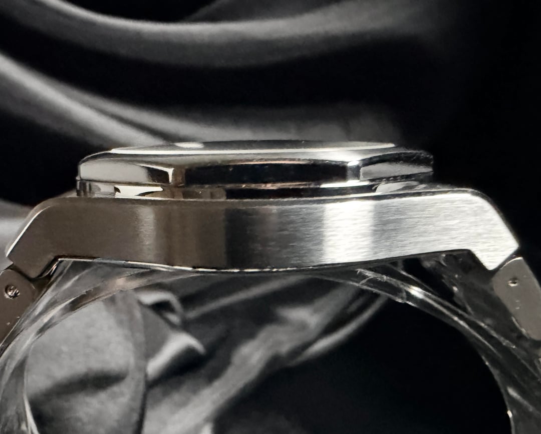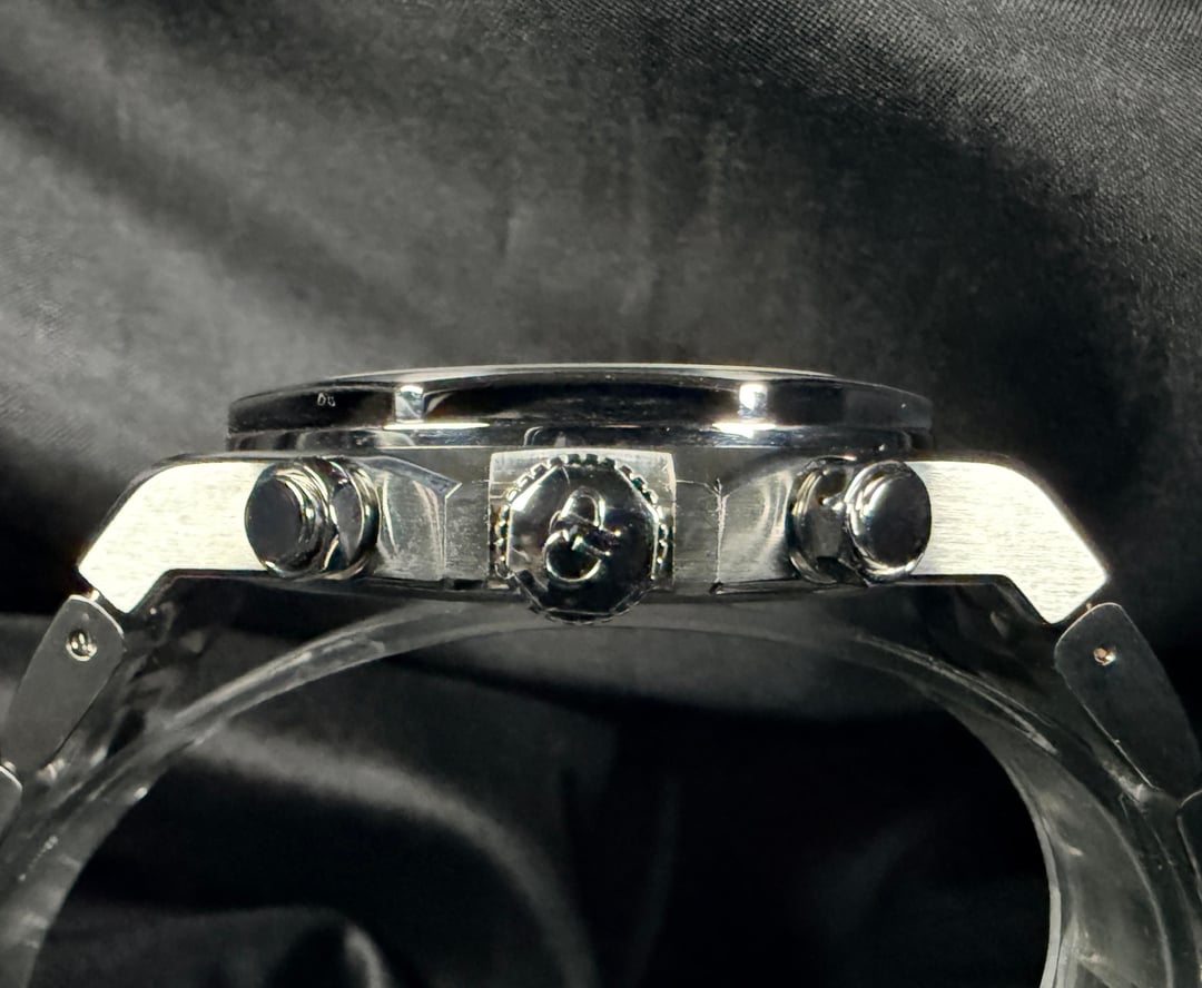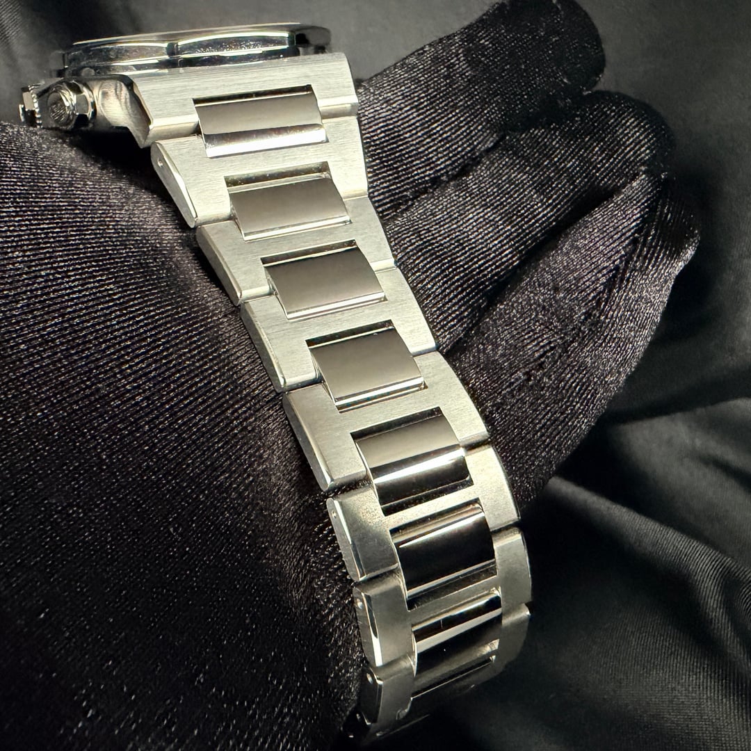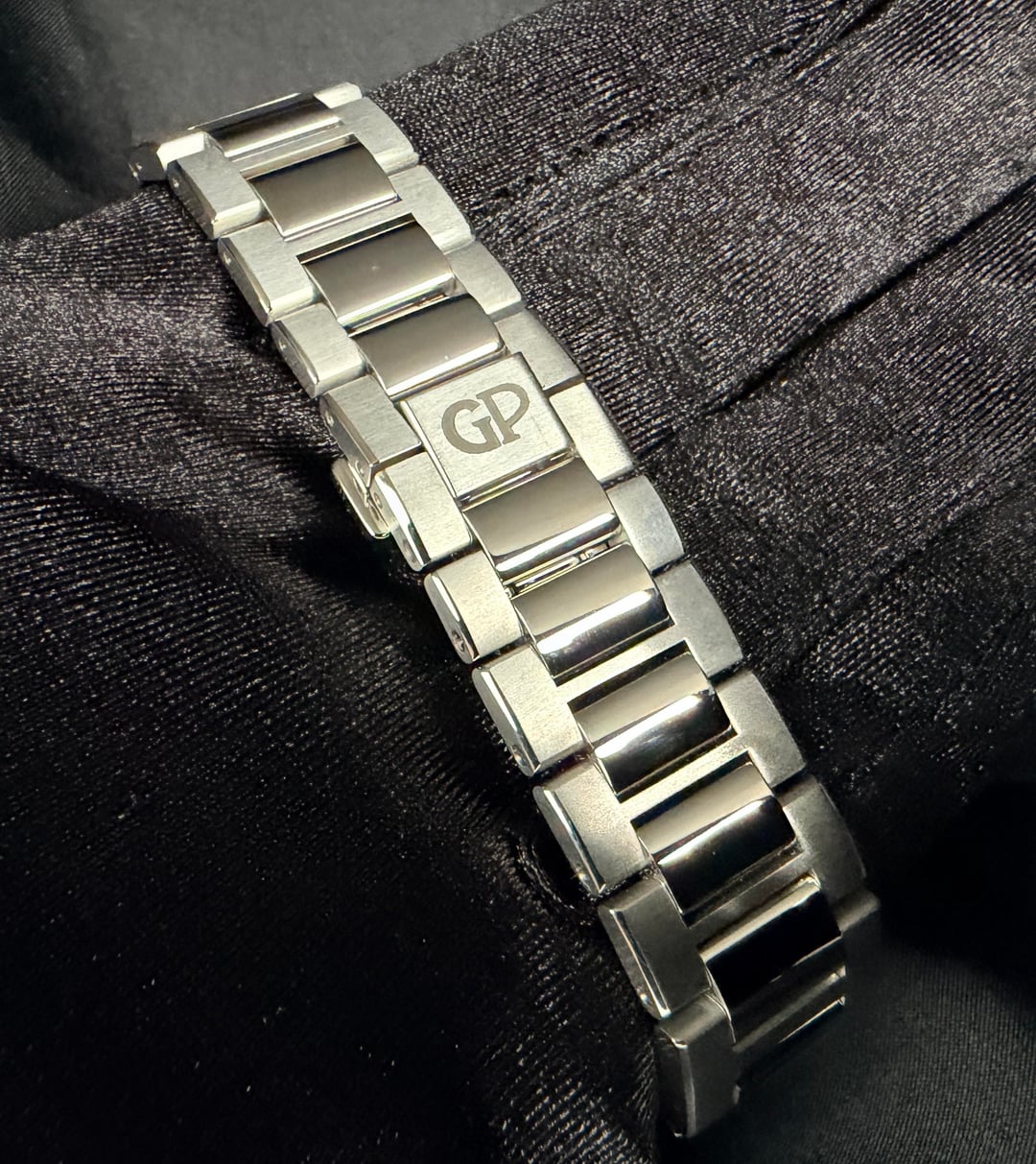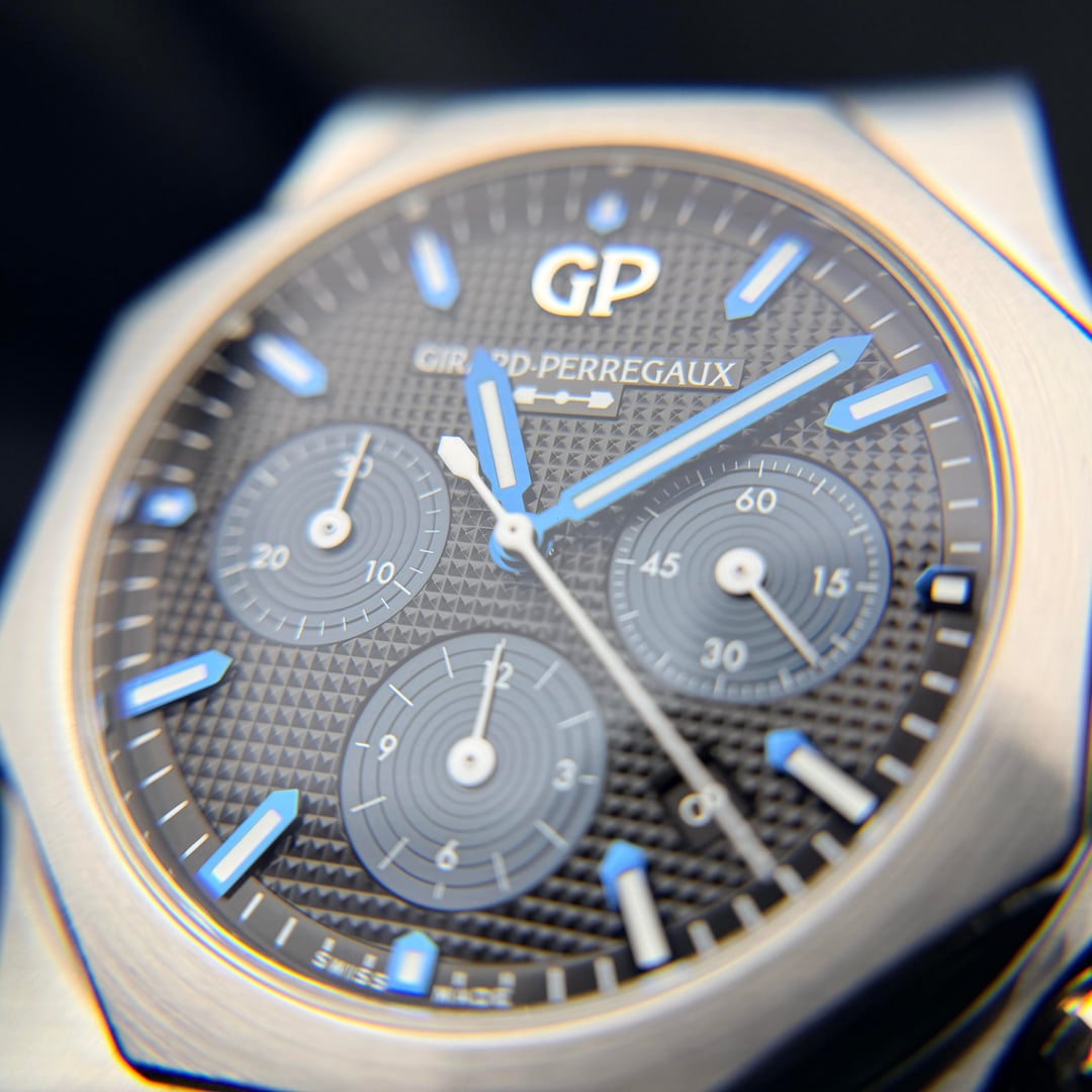 Girard-Perregaux Laureato Chronograph 42mm Ref. 81020-11-631-11A — 2025 — Brand New, Unworn, Fully Stickered — Full Set** A standout in the world of integrated-bracelet chronographs, the Laureato Chronograph combines heritage, high horology, and modern engineering in a way few sports watches can. This 2025 example is brand new, factory-fresh, fully stickered, unworn, and delivered exactly as purchased from the boutique. MSRP is $19,500 + tax, making this a superb value for collectors seeking a flawless, untouched example. Price: $11750 ⸻ Highlights • 2025 Boutique Purchase — Brand new, unworn, full stickers intact • Full Set — Box, outer box, manuals, warranty card • Screw-down chronograph pushers + screw-down crown (transcript confirmation: pushers are fully screwed in / locked) • Beautiful navy-blue hobnail dial with sunken registers • Integrated steel bracelet crafted entirely with screws (no cheap pin sleeves like PP Aquanaut) • Vertical-clutch chronograph engagement — smooth, jump-free activation • Manufacture Calibre GP03300 base / 3300 architecture • True luxury finish with hand-done satin & polished transitions ⸻ DESCRIPTION The Laureato Chronograph sits firmly among the icons of integrated sports watches, carrying a design lineage stretching back to the 1970s. Its distinct octagonal bezel, rounded case geometry, and flowing bracelet profile give it a sculpted, architectural presence—refined yet unmistakably sporty. This reference features GP’s striking matte navy-blue dial with a center hobnail pyramid pattern, one of the most beautiful dials in the category. The sub-registers are slightly recessed, adding visual depth, symmetry, and texture. The indices are applied and lightly blued, creating a subtle contrast that shifts beautifully under light. The 42mm stainless-steel case is finished with crisp longitudinal brushing, accented by fine polished bevels along the lugs and underside. Everything lines up perfectly—the hallmark of true Swiss luxury manufacture work. Unlike competitors, GP builds the Laureato bracelet with full-screw construction for every link. This is more expensive to make, far more durable long-term, and completely avoids the “pin sleeve” shortcuts found in many high-profile integrated bracelets. The result: buttery articulation, no pinching, no hair-pulling, and an incredibly comfortable wrist wrap. The twin-trigger butterfly clasp offers secure closure with a satisfying mechanical feel, operating in a sequential manner so the clasp stays locked until both triggers are engaged. ⸻ MOVEMENT Inside is the revered GP Calibre 3300-based chronograph architecture, a 63-jewel modular movement with: • Vertical clutch engagement • Stop-seconds • Quick-set date • 46-hour power reserve • Smooth, jump-free chronograph start The pushers feel excellent—precise, clean, and positive, a testament to GP’s movement finishing and assembly quality. ⸻ ON THE WRIST At 42mm, the Laureato Chronograph wears like a modern sports piece but with GP’s signature slim profile (approx. 12.3 mm), making it significantly more refined than bulky offshore-style watches. If you love the Royal Oak Chronograph or Nautilus 5980, this sits right in that world—but with its own authentic identity and far better value. ⸻ INCLUDED • GP Presentation Box • Outer Box • Warranty Card (2025) • Manual Booklets • All Factory Stickers On Watch • All Accessories Exactly As Purchased