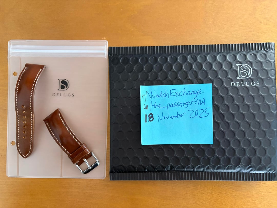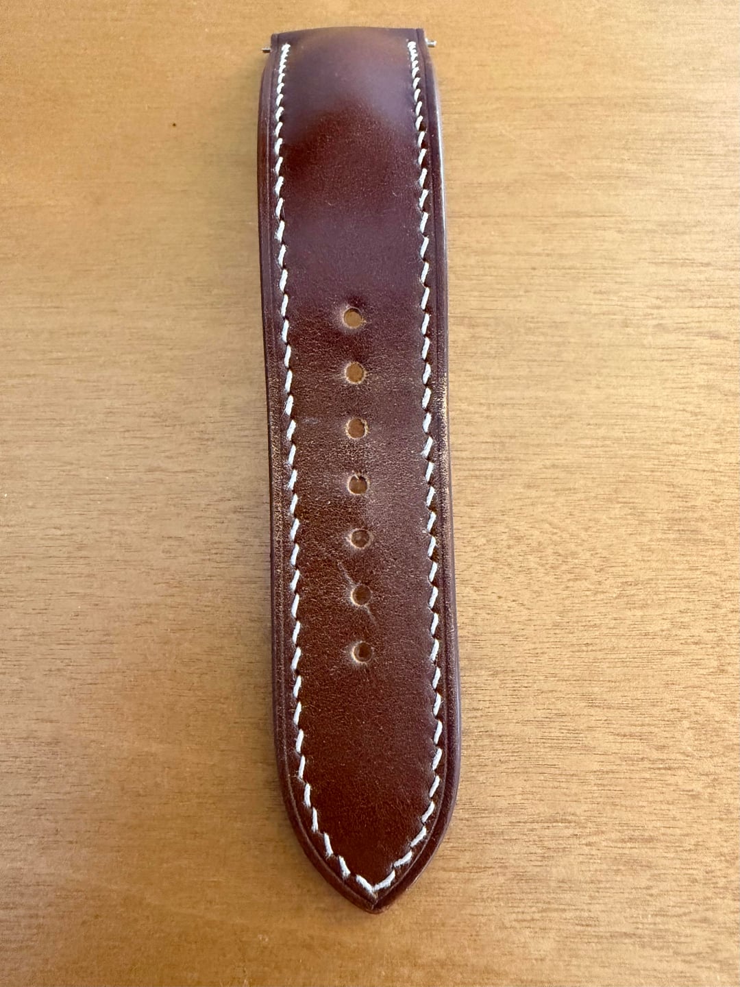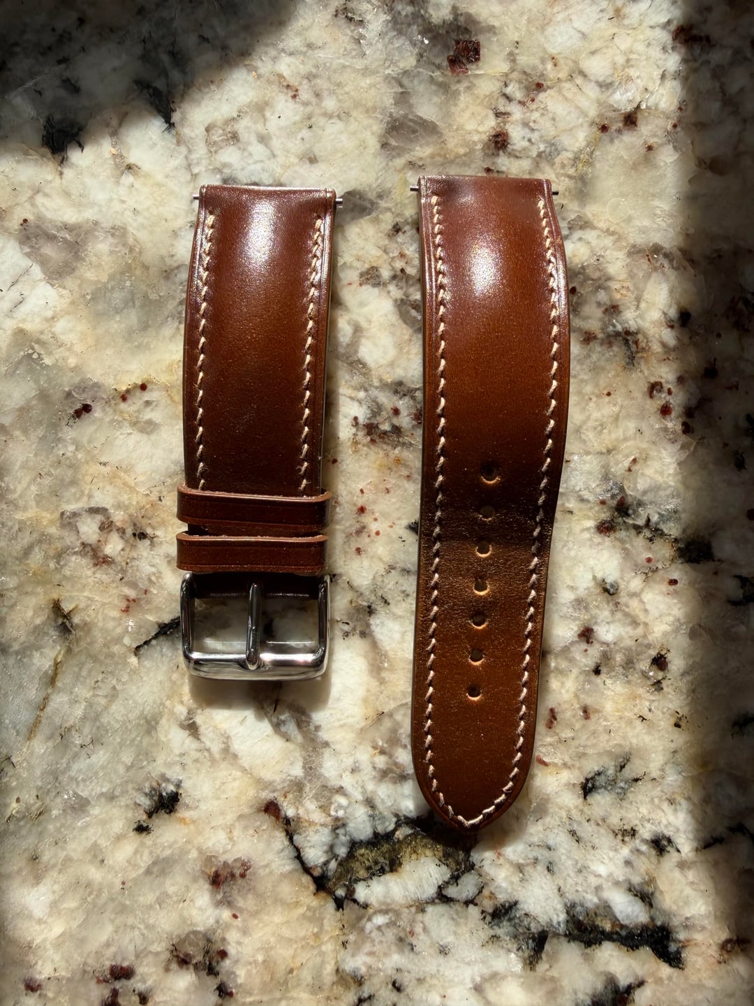 I'm selling a Delugs made-to-order shell cordovan strap, 22 mm lug width x 20 at the buckle. Cognac color with beige stitching, 115 x 70. If ordered today this strap would be US $235 plus shipping, and as a custom order would take six to eight weeks to produce. I wore it but not for long; aside from the curvature there are minimal signs of wear where the buckle meets the strap. (Photo on marble counter surface is the most accurate color representation.) $120. Nonsmoking, child-free home. Payment: Zelle or Paypal. Shipping (Priority Mail) to US addresses only. I've been active on WatchExchange since 2019 and have built up positive feedback as both seller and buyer. I've been on eBay since 1999 and have 100% feedback as both seller and buyer (more than 600 transactions). I also have over two dozen sales on Grailed with positive feedback from buyers (message me for my user ID if you want to review either of those). Please get in touch if you want more info or pics. Given increased recent reports of fraud/attempted fraud on this sub, I'm happy to provide a custom timestamp, or do whatever I can to make you comfortable. Please leave a comment here before messaging.