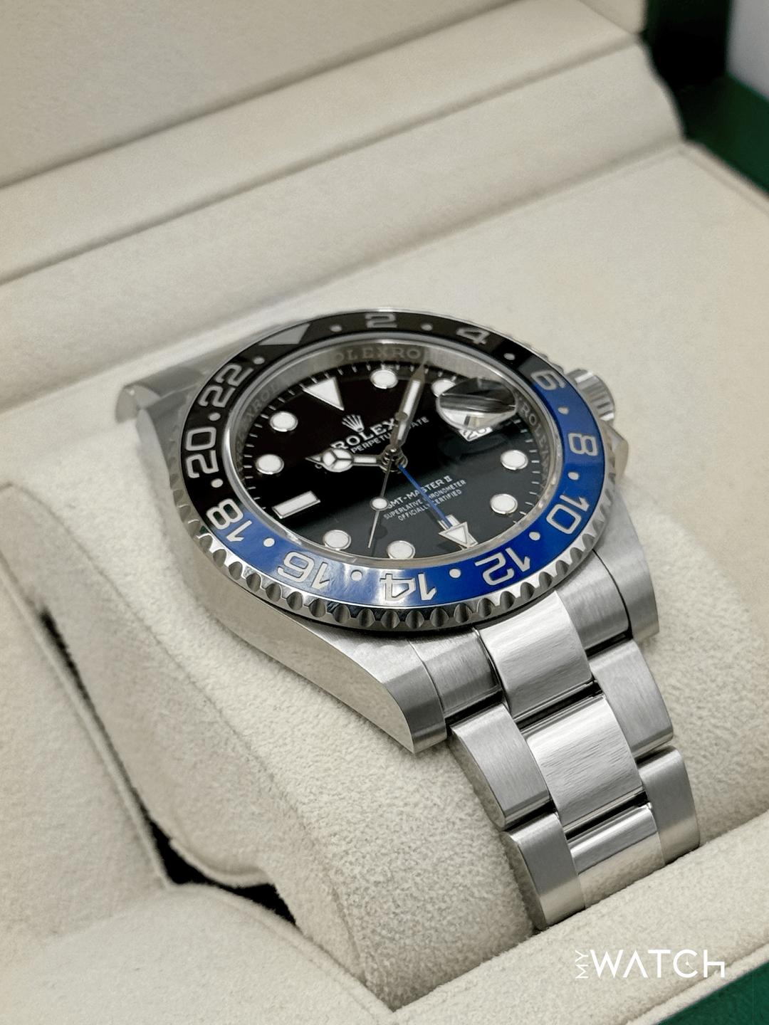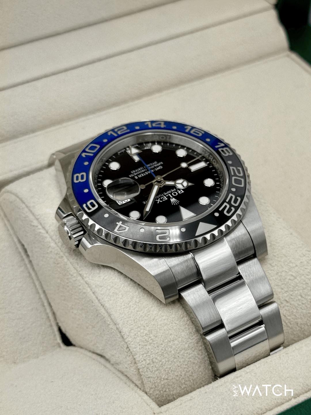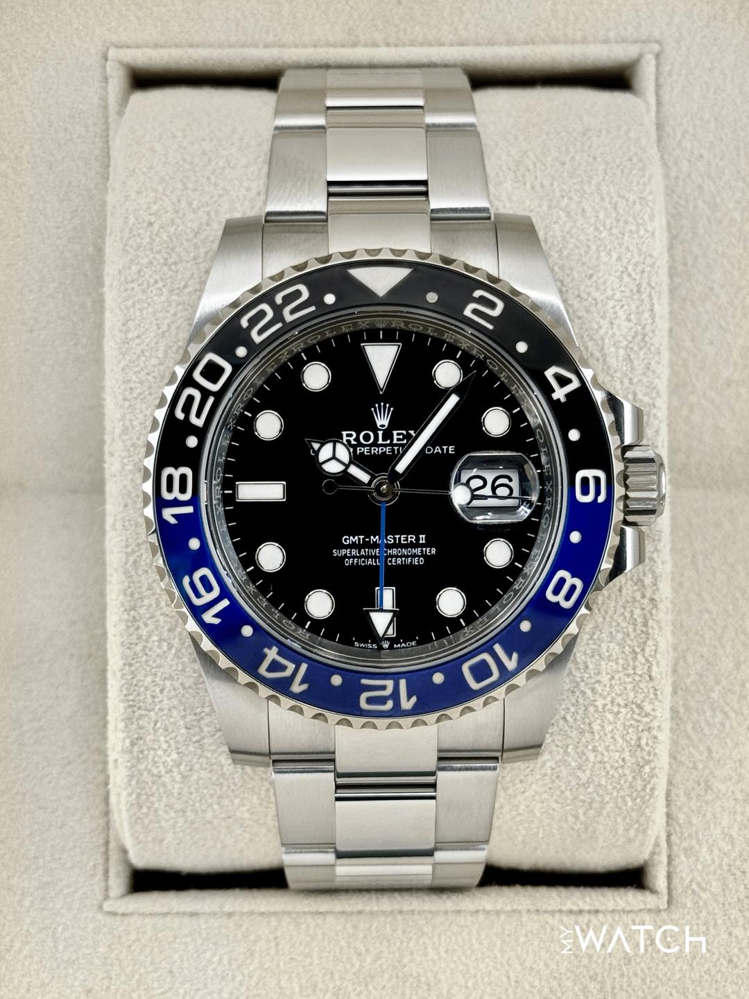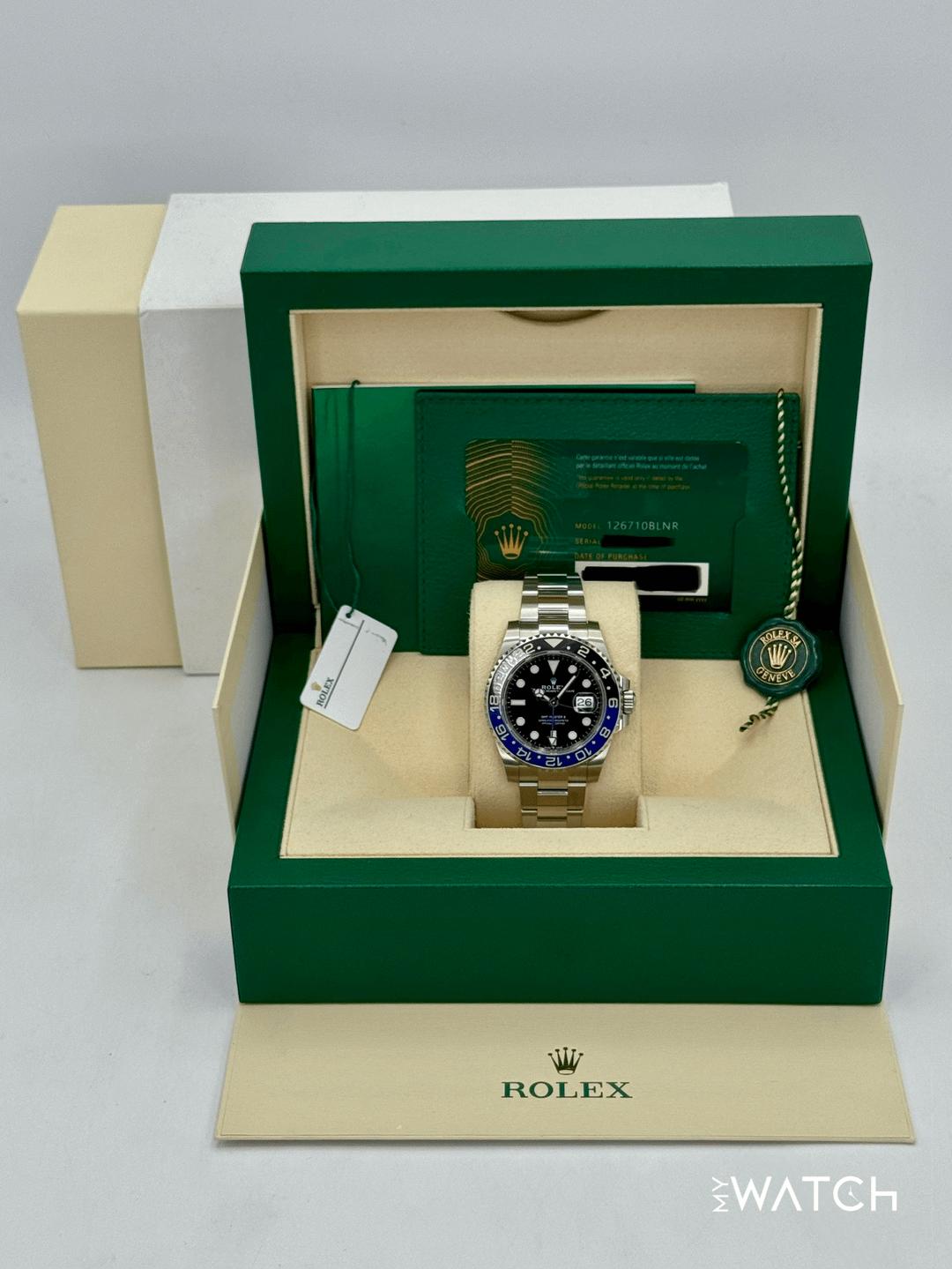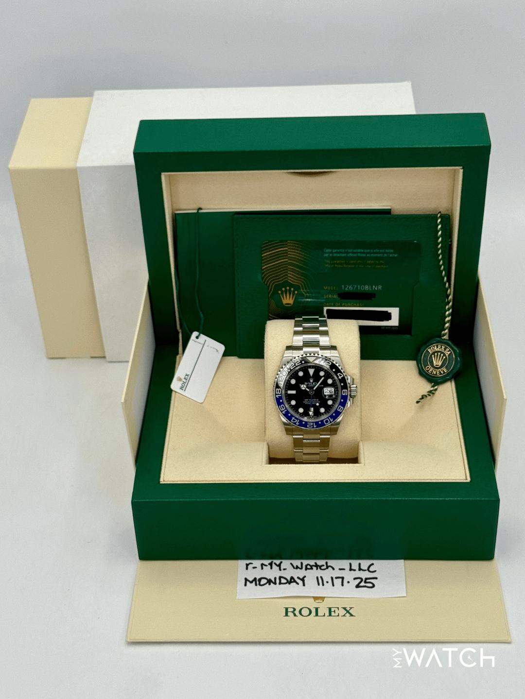 🔵**2023 Rolex GMT-Master II "Batman" 40mm 126710BLNR Stainless Steel Oyster Bracelet Black Dial** 🔵**TRADE or SELL us your luxury watch, all brands considered. Message me details.** **Includes the following:** **✔️Original Rolex Double Boxed** **✔️Box and Papers - Yes** **✔️Warranty card dated October 2023** **✔️Manual and Warranty booklets** **✔️Green and White Hang Tags included** **✔️Material: Oystersteel** **✔️Bezel: Bi Color Ceramic Bezel in Black and Blue** **✔️Size: 8.0inch wrist (Full Links)** **✔️Watch is in excellent overall condition. Please see photos for details.** **✔️**[**Trades**](https://mywatchllc.com/pages/sell-rolex-watch) **welcome** Business Name: **My Watch LLC** LOCATION: Oak Park, Michigan ✔️[MyWatchLLC.com](http://mywatchllc.com/) for current inventory ✔️Google Business Listing [https://g.co/kgs/Cmd6FPW](https://g.co/kgs/Cmd6FPW) ✔️Business Hours M-F 9-6 ✔️Facetime/Video chat/calls welcome to view the watch interested. ✔️Contact: 248-422-0909 via text or call for quickest response. 🟢TERMS: Visit [MyWatchLLC.Com](http://mywatchllc.com/) for payments accepted 🟢REFERENCES/REVIEWS: We are well reviewed on all platforms from google, trust pilot, rolexforums, additionally we have 300+ reference in multiple FaceBook watch groups, reference checks welcome. 🟢SHIPPING: If you are not local, we offer Fully Insured FedEx overnight shipping in the USA for a fee. International shipping available.