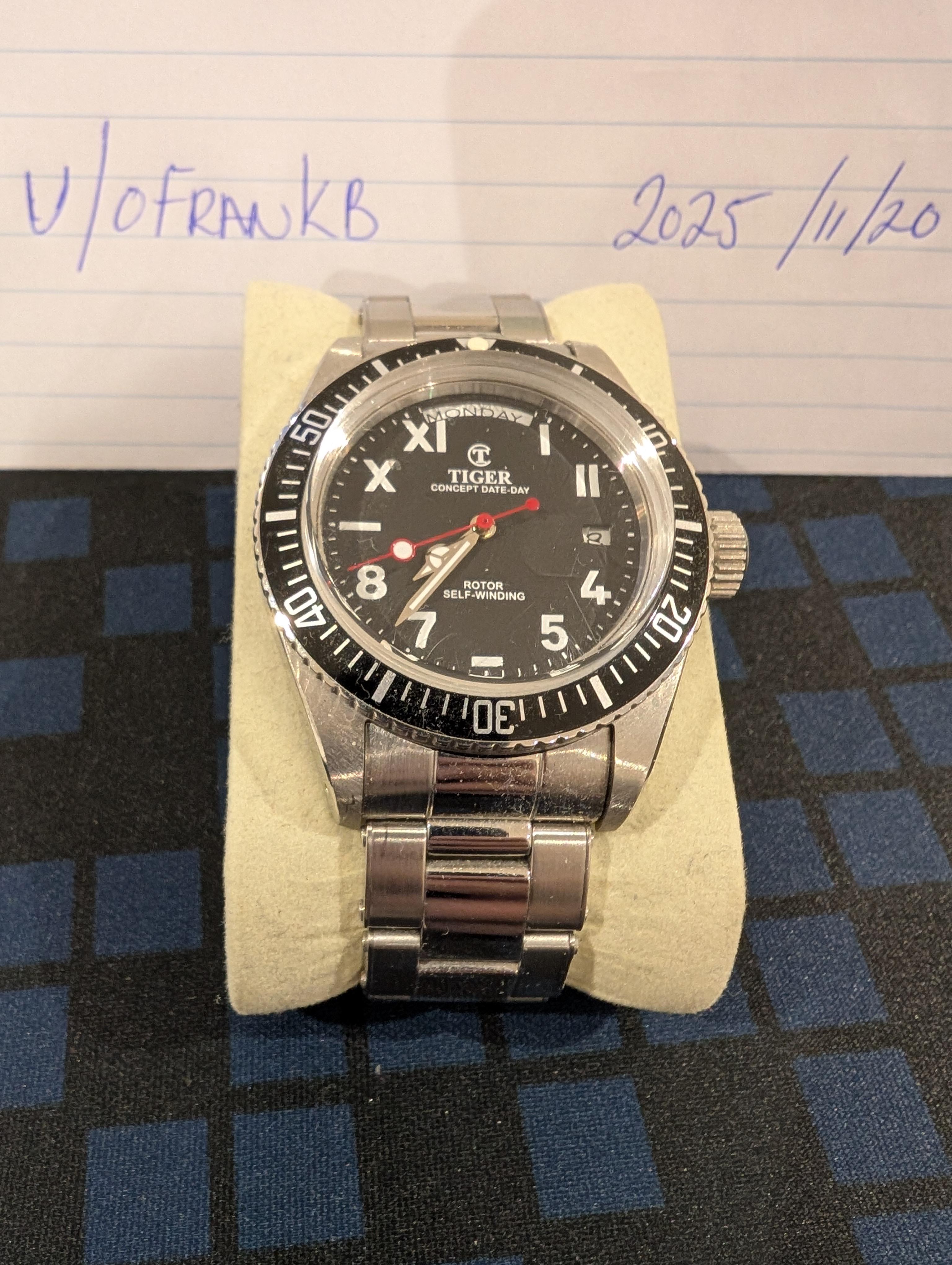 Video : [https://imgur.com/a/NHbXWmd](https://imgur.com/a/NHbXWmd) I bought this directly from Tiger with this “California” day/date dial and movement, Mercedes hand set, with the big ball seconds hand, and BEAUTIFUL TOP HAT plexiglass. I’ve worn it only occasionally, and it’s in good shape with only minor signs of wear. It keeps good time. Specs: Case: 38.7mm without the crown, Movement: DG 2822 Lug to lug: 48.35mm Thickness: 16mm (with crystal) Lug width: 20mm Hacking second The shipping is included from CANADA to CONUS(USA) and CANADA. I only accept Paypal FF. I have only positive feedback. Buy with confidence !!!!