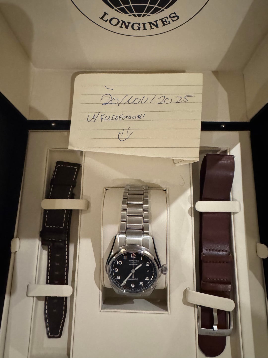 Hello everyone! I'm selling my Longines Spirit, prestige edition. Full Set – Excellent Condition – Original Receipt Included, for 1950$ USD. This is the full Prestige kit, which includes the watch on its steel bracelet plus two additional factory Longines straps (leather + NATO) & two additional textile straps of 150$ value. The Prestige Edition was designed to be fully interchangeable, so swapping straps is simple and tool-free for the two included straps. What’s included: • Watch: Longines Spirit 40mm (excellent condition) • Original Longines steel bracelet fits approximately 7 inch wrist • Two original Longines straps from the Prestige Edition • Full box + papers • Original Longines Prestige Edition presentation box • Original purchase receipt Bracelet note: The bracelet currently fits a 6.3” wrist, and with the two extra links it can fit a larger wrist. Since this is the Prestige Edition, most owners actually prefer using the leather or NATO straps, which are included and easily interchangeable. Happy to ship world wide!