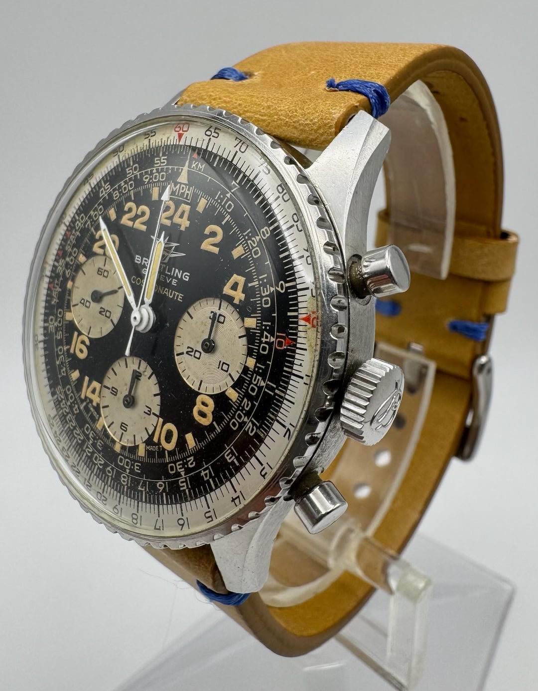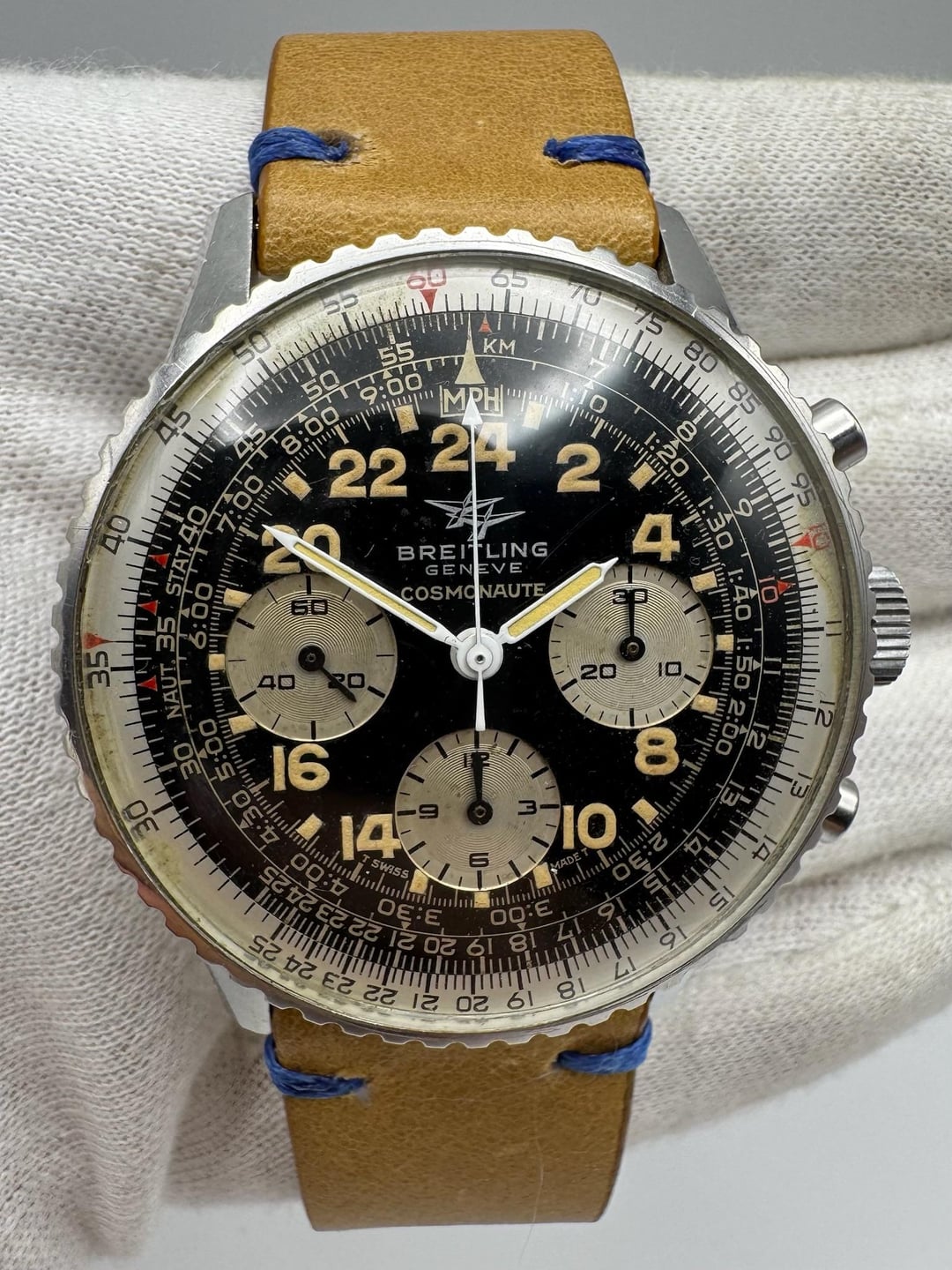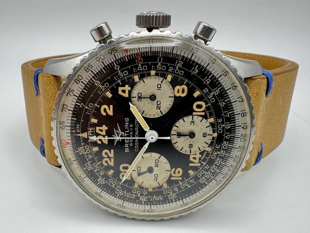 Breitling Navitimer Cosmonaute 809 all original in very nice overall condition. The case remains in its original unpolished state, showing moderate wear consistent with age and use. This particular example carries notable provenance, having belonged to a fighter pilot from the Jordanian Air Force. His name is engraved on the side of the case, accompanied by additional markings on the case back—adding historical depth and individuality to the piece. The original dial has developed an attractive warm patina across the lume plots, perfectly matched by the aged tritium hands. The lume still reacts under UV light, confirming its authenticity. The movement was professionally serviced in October 2025 and runs accurately, with all chronograph functions performing as they should. Fitted on a new handmade 22/20mm light brown ammo strap. A remarkable and historically significant Navitimer that embodies both aviation heritage and authentic character. **Reference:** 809 **Size:** 41mm **Year:** ~1965 📜 Includes: Custom [travel pouch](https://bogossia.com/products/travel-carrying-case) ($50+ value) 💵 Price: $7,250 + FREE overnight shipping with FedEx fully insured. [Timestamp](https://imgur.com/a/wPBKe8v) 🔥 Follow us on [Instagram](https://www.instagram.com/bogossiajewelers) 📍 Location: New York 🔒 Authenticity: 100% guaranteed, buy with confidence. We have 150+ reviews on Chrono24 with 180+ transactions, and Excellent rating score on Trustpilot. Visit our [profile](https://www.reddit.com/u/BoghossianJewelry/s/vm81HAdB7o) for links and references. 📦 Domestic Shipping: Ships with FedEx overnight, within 24 business hours of payment, from New York, NY to CONUS. The shipment is fully insured against damage, loss or theft. 🌍 International Shipping: Incurs an additional $100. 💳 Payment: PayPal/CC (+4%), Web, or Face-to-face deal in NY. 🔐 [Seller References](https://bogossia.com/authenticity) 🔗 [Other Listings](https://www.reddit.com/u/BoghossianJewelry/s/vm81HAdB7o) 📸 [IG: @bogossiajewelers](https://www.instagram.com/bogossiajewelers)