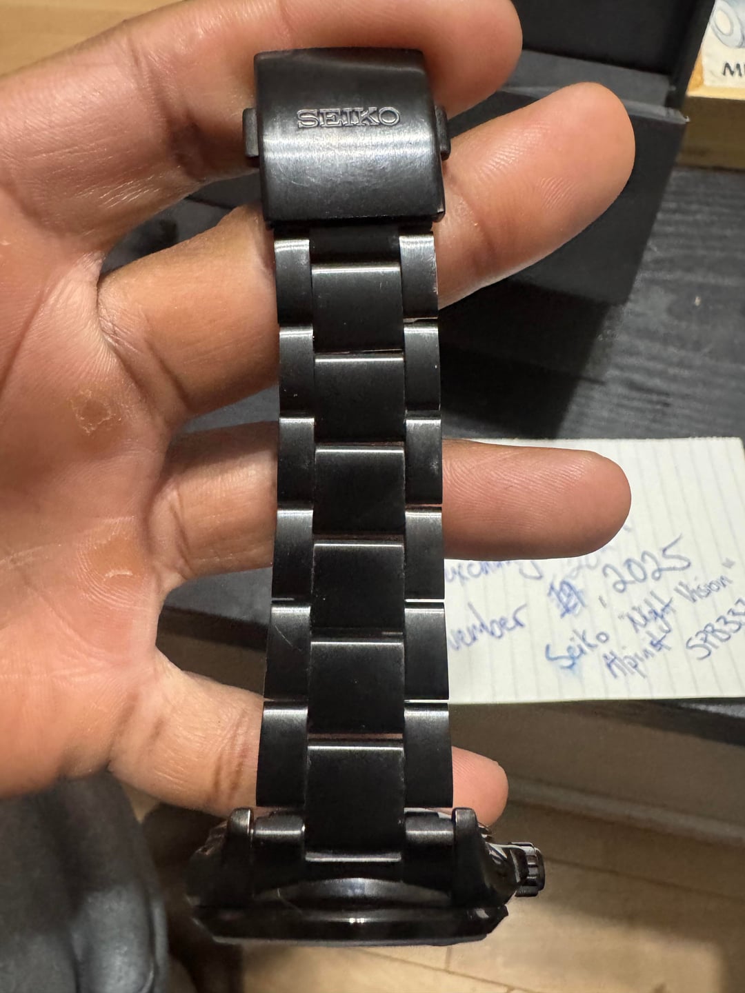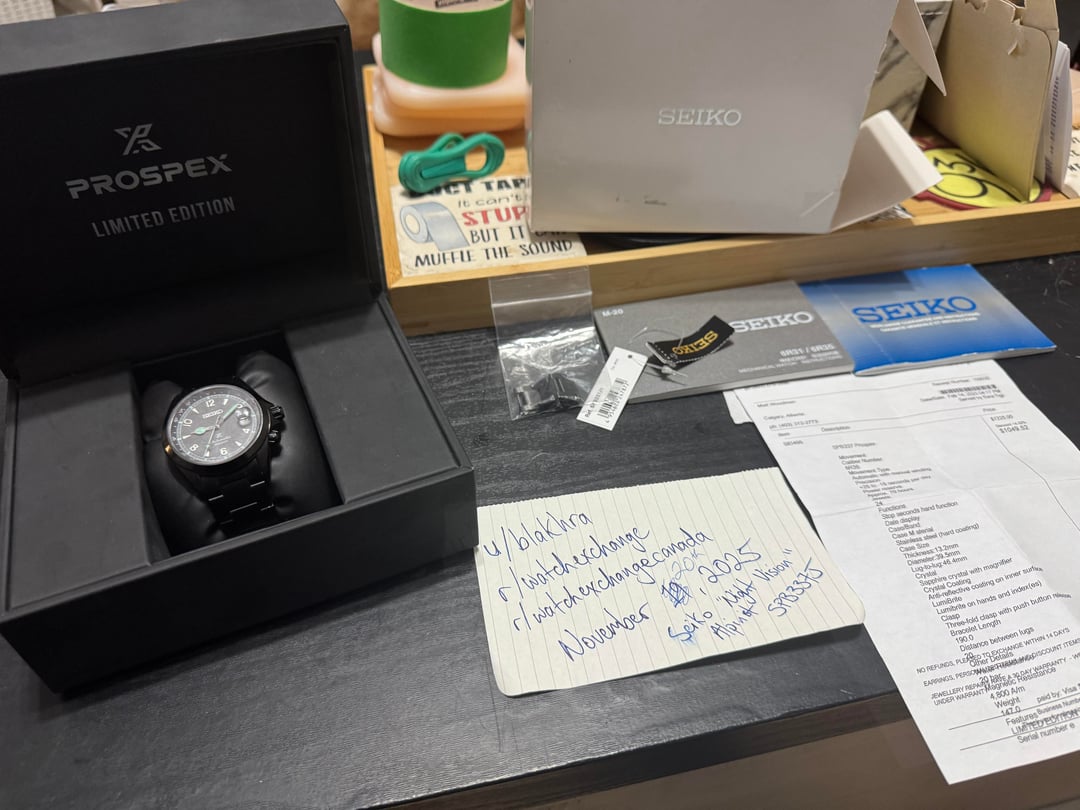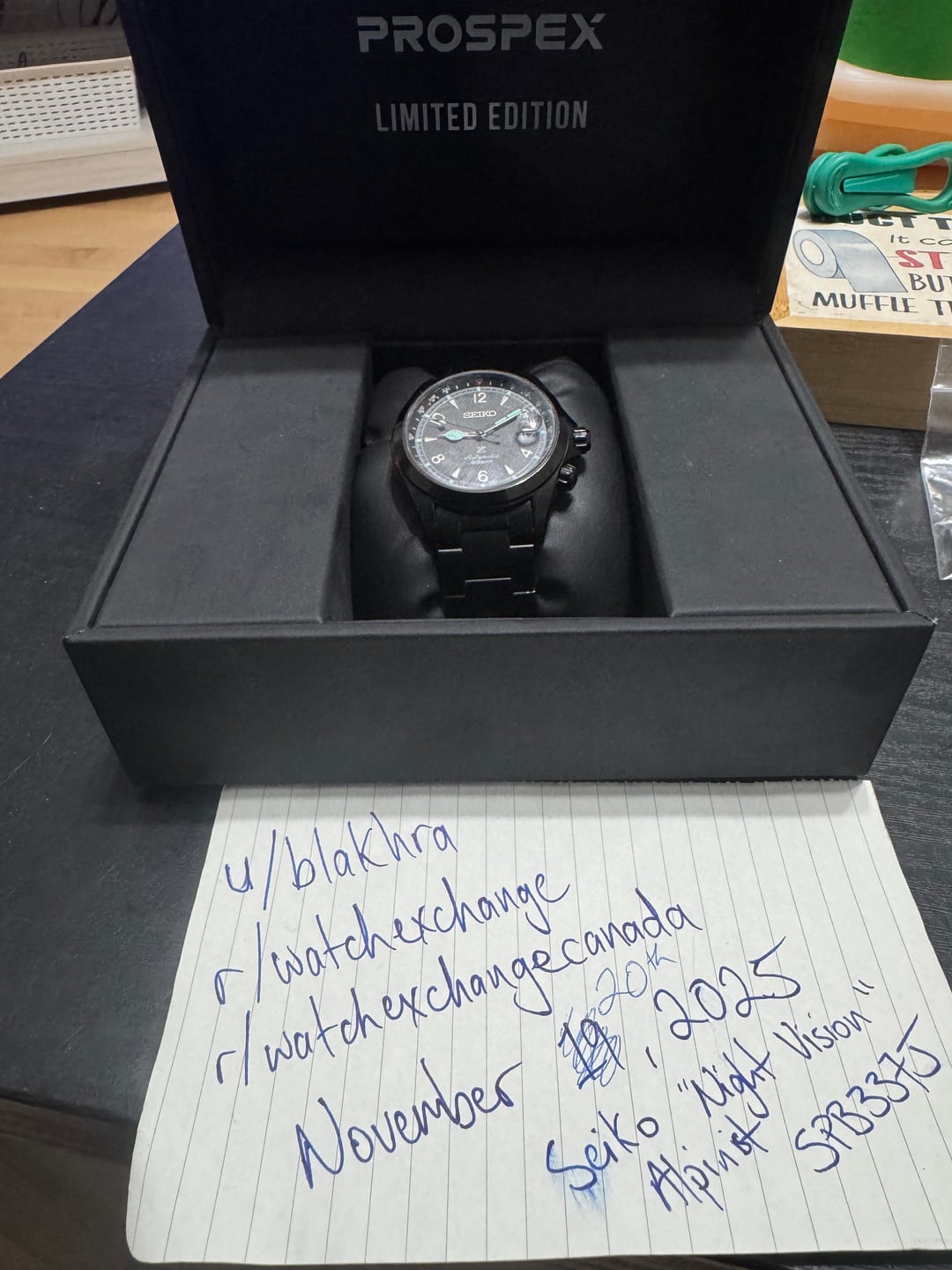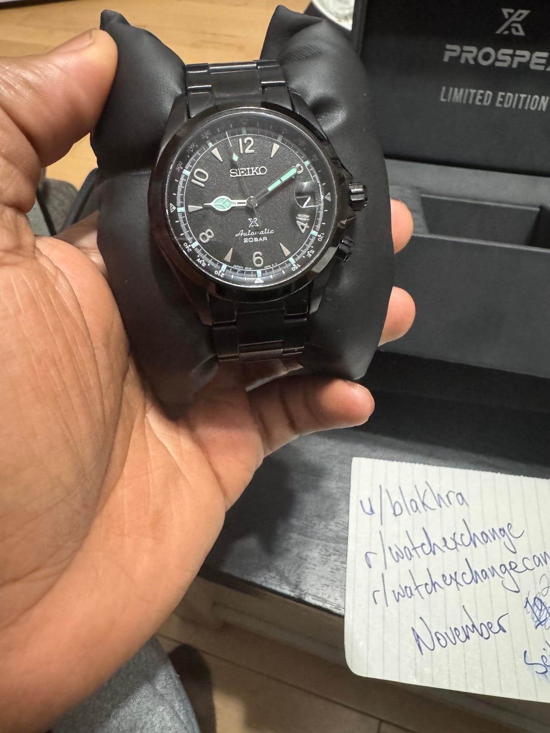 The time has come for me to sell my beloved Night Vision Alpinist, the SPB337J. This has been a staple in my collection for a couple years now, but it is time to pare down. I am the second owner of the watch and it was definitely worn a lot, but the excellent coating on it makes it so hard to tell! There are a couple of small scuffs on the bracelet that I tried to capture in the pictures. It wears beautifully with its 39.5mm diameter and 46.4mm lug to lug. The lume is incredible (as expected from Seiko) and the 70 hour power reserve makes this a great wear for every day or two! As part of the “limited edition” run of these, this is numbered 2601/5500. Watch is located in Canada, but I will ship anywhere CONUS or Canada. Asking a fair $610 USD/$860 CAD, SHIPPED! Payment via PayPal or Interac e-transfer! (Will be cross posted over to r/watchexchangecanada as well!)