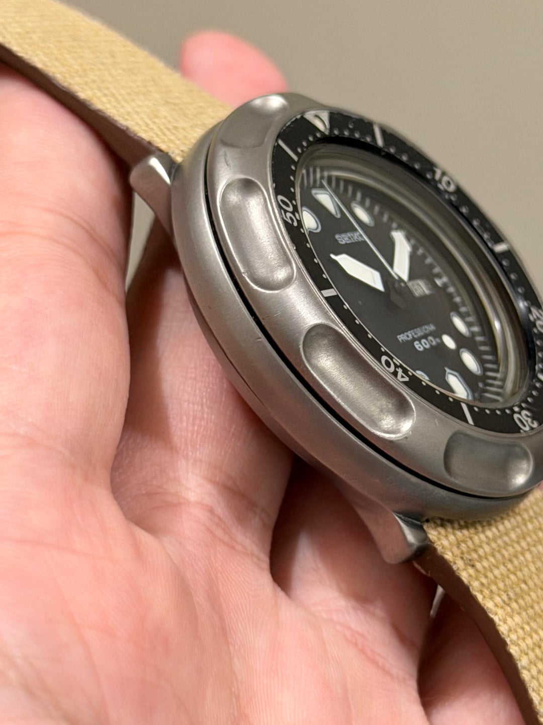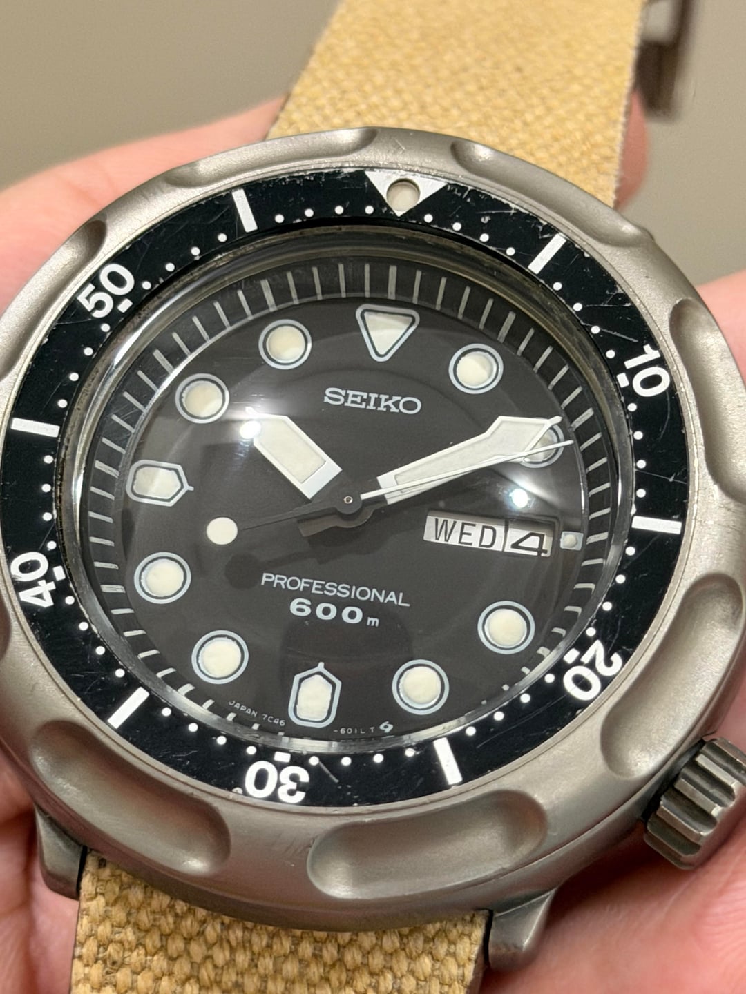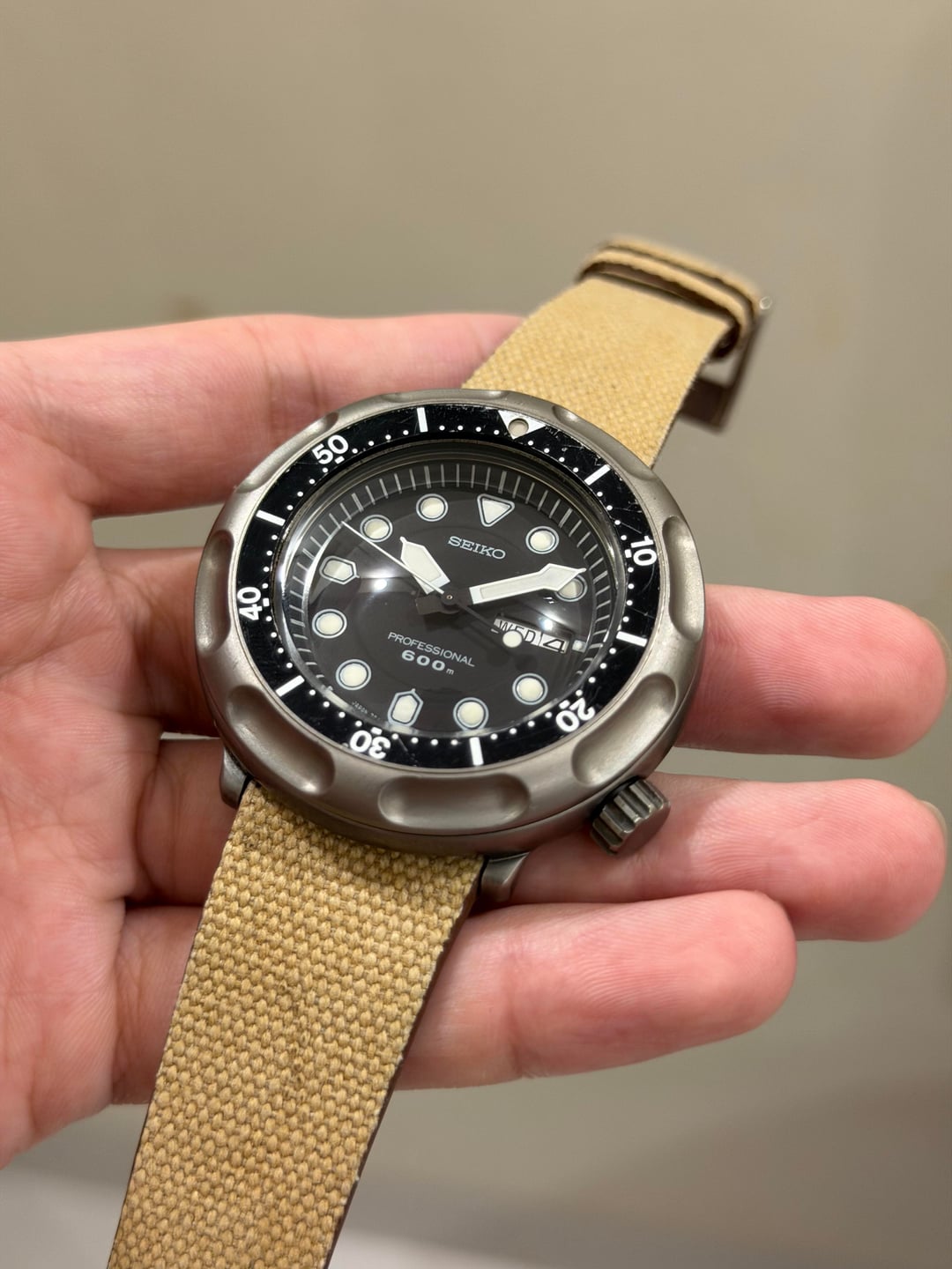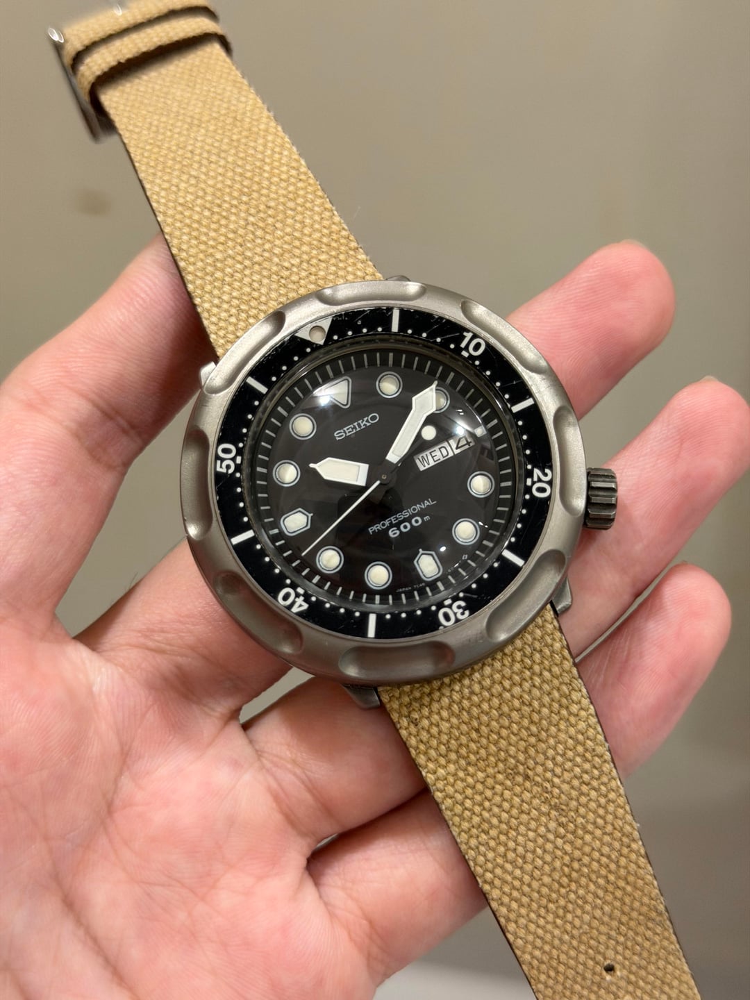 **CONDITION:** The watch was serviced 2 years ago and currently running well. The case is in good condition. The bezel has some scratches. The dial and hands are in good condition. **SPECS:** Manufacturer: SEIKO Movement: Quartz Case Material: Titanium Crystal: Hardlex Band: Canvas strap Box and paper: None Year: 1986 **DIMENSIONS:** Case (w/out crown): 44 mm Lug to Lug: 45 mm Lug Width: 22 mm Thickness: 15 mm **PRICE:** I’m asking for **1999 USD** shipping included (International). I accept PayPal FF, Zelle, Venmo, or Wire. **SHIPPING:** I’m based in the US but currently travelling in Vietnam, so the watch will be shipped from Vietnam (for US buyers, any tariffs will be covered, so buy with confidence). Shipping will usually take 3-5 business days.