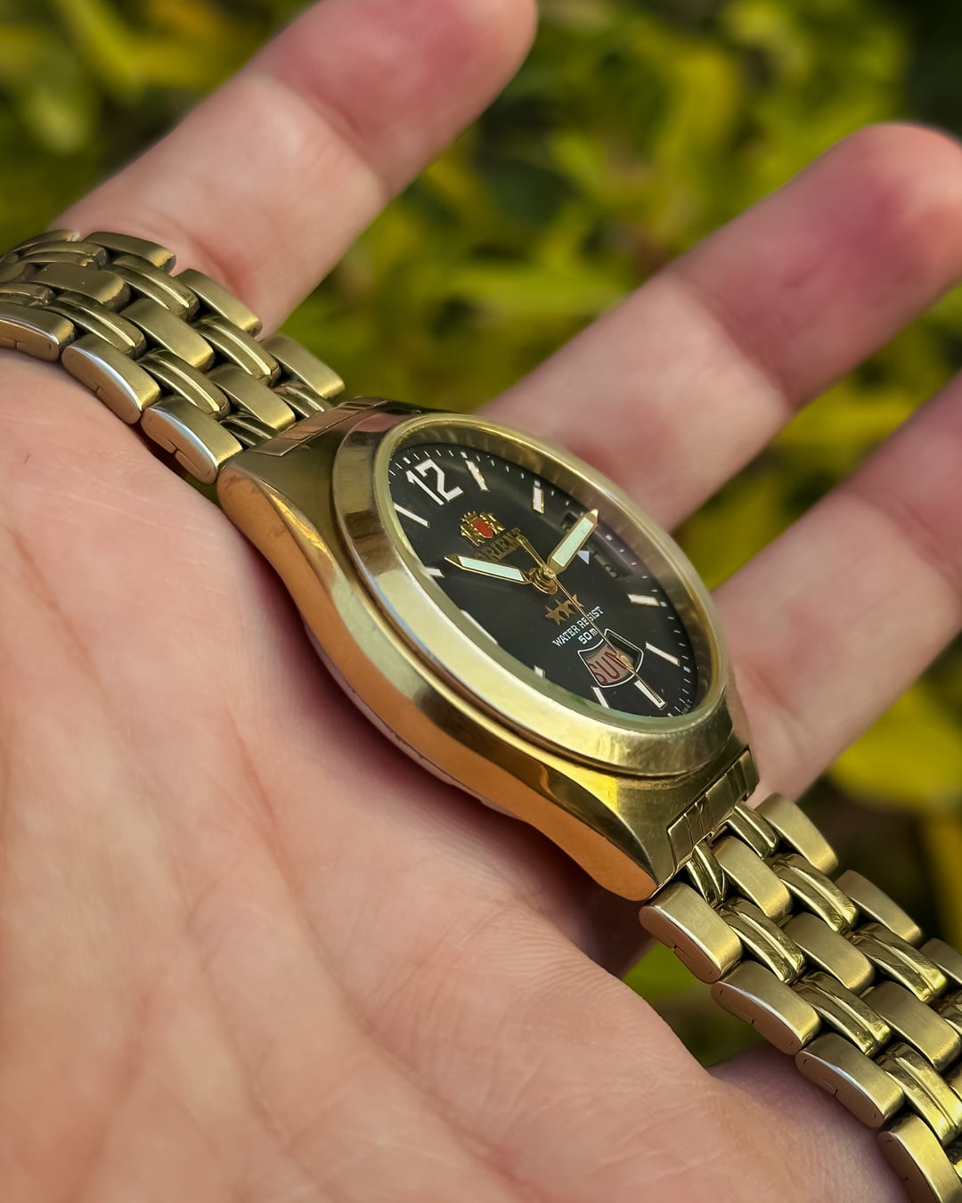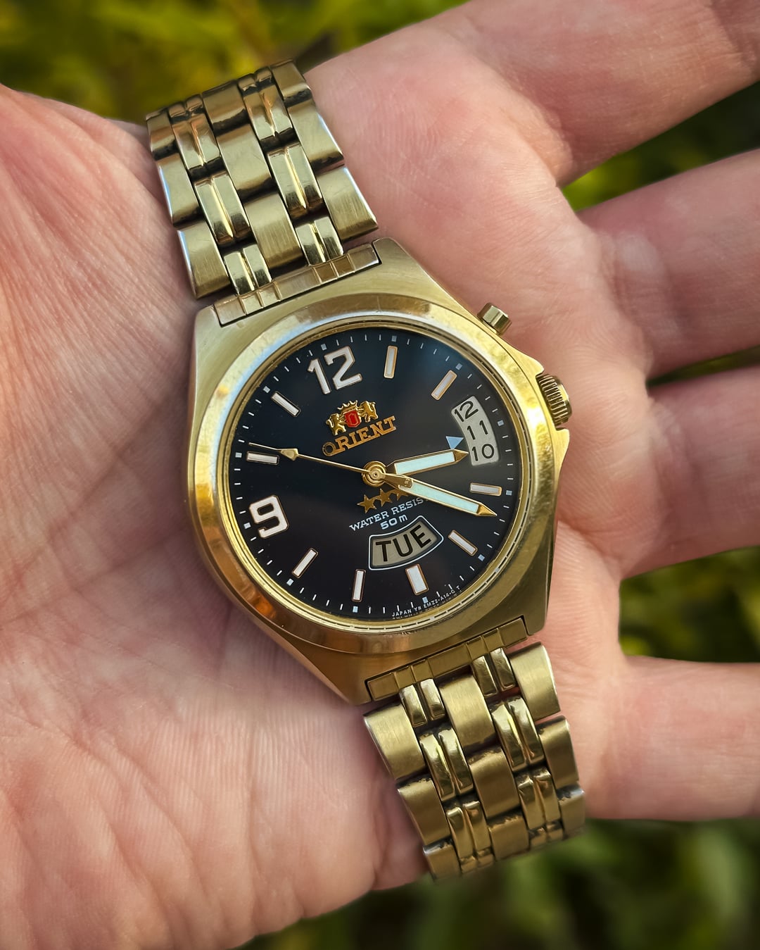 [Timestamp](https://postimg.cc/dZ9cDVQ2) [Lume Shot](https://postimg.cc/CnnJ6vXB) **Hey Watchexchange!** Here’s a charming and quite rare **Orient Tri-Star Crystal** from the 1990s — a bold and characterful piece that showcases one of Orient’s most creative dial layouts from the era. This one immediately stands out with its **black dial**, **gold-tone case**, and that unmistakable **unique day + date dual-window display**, making it a fantastic collectible for lovers of quirky vintage Japanese design. Up front, the glossy black dial shows off **lume baton indices** paired with large **Arabic 12 and 9**, giving it a sporty-meets-dressy aesthetic. The **bold pencil hands**, fully lumed, complement the layout beautifully. You also get that signature Orient charm with the **arched date window at 3 o’clock** and the **curved day aperture above 6 o’clock** — a design very few Orient references ever used. A dedicated **button at 2 o’clock** allows quick day adjustment, adding practicality to its unique layout. The **gold-tone case** gives it a warm vintage presence without being too flashy, particularly against the deep black dial. Completing the package is the **original gold-tone bracelet** — hard to find today and a big bonus for collectors. Inside runs the durable **21-jewel in-house Cal. 46943**, an Orient workhorse movement known for reliability and charm. 🔹 **Dimensions** • Case Diameter: **37mm** (without crown) • Lug-to-Lug: **43mm** • Thickness: **10mm** • Lug Width: **16mm** 💵 **Price:** **$169 shipped** 🚢 **Shipping:** UPS (Worldwide) 📦 **Payment:** **PayPal F&F** or G&S (+4.5% fee by buyer) or **bank wire** (US banks accepted) 📩 DM me for more pics or a custom timestamp. If you’re after a quirky, collectible, and uniquely designed vintage Orient, this **Tri-Star Crystal** offers real character, charm, and rarity. Follow my **Instagram** through the link in my Reddit profile for more vintage drops and upcoming listings.