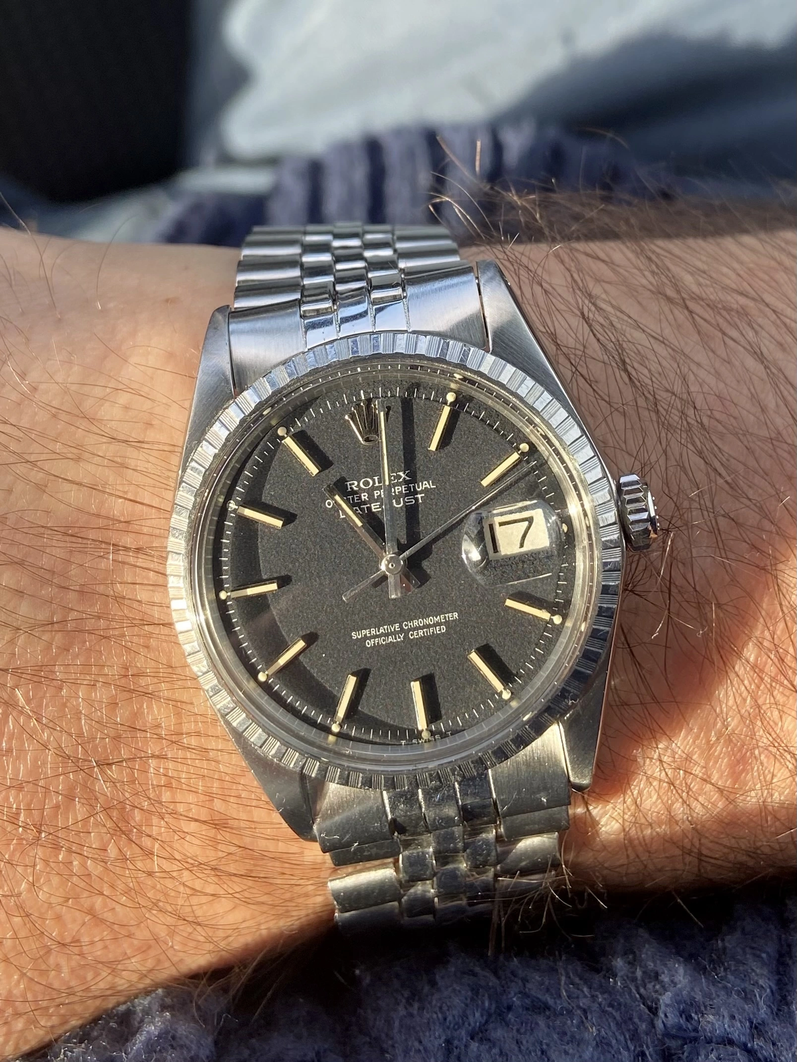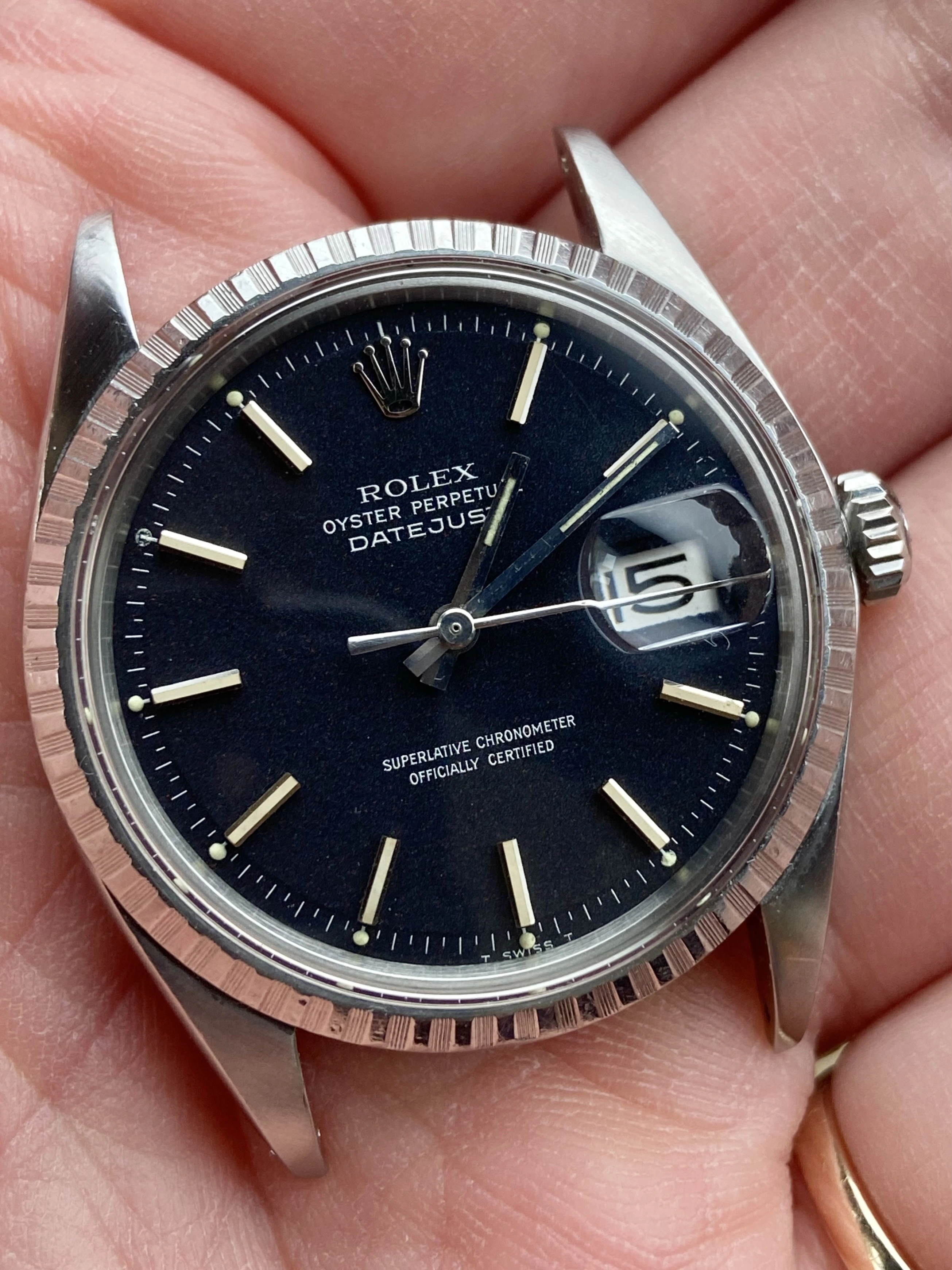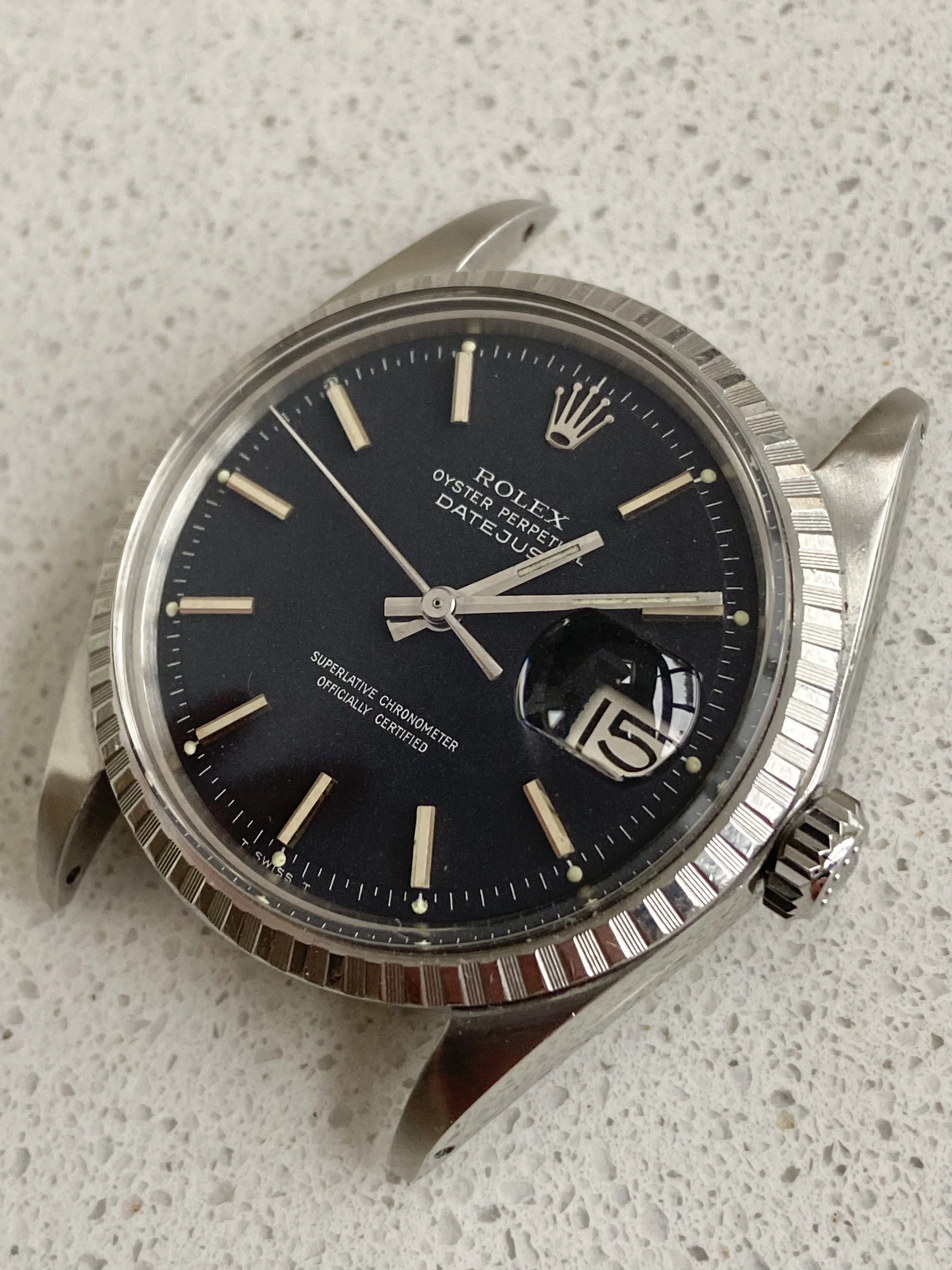 Stainless steel 36mm case ref 1603 with engine turned bezel. Has been polished before (not by me). New genuine Rolex crown, tube, crystal and seals at service on Nov 25. Passed waterproof test at service.