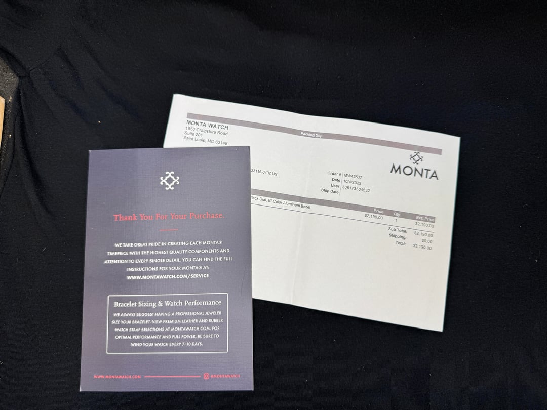 Monta SkyQuest GMT with the black and red bezel and non-gilt dial. Version 2 with the full kit and warranty card dated November 2022. Light signs of wear throughout but in overall excellent condition and keeps great time. If there is something specific you'd like to see I'm happy to send pics or video! Asking $1250 OBO. Link to video here: [https://imgur.com/a/exfbbnJ](https://imgur.com/a/exfbbnJ) Shipping is included from Chandler, AZ in the CONUS ONLY. Paypal F&F, Venmo or Zelle accepted. Thanks for looking!