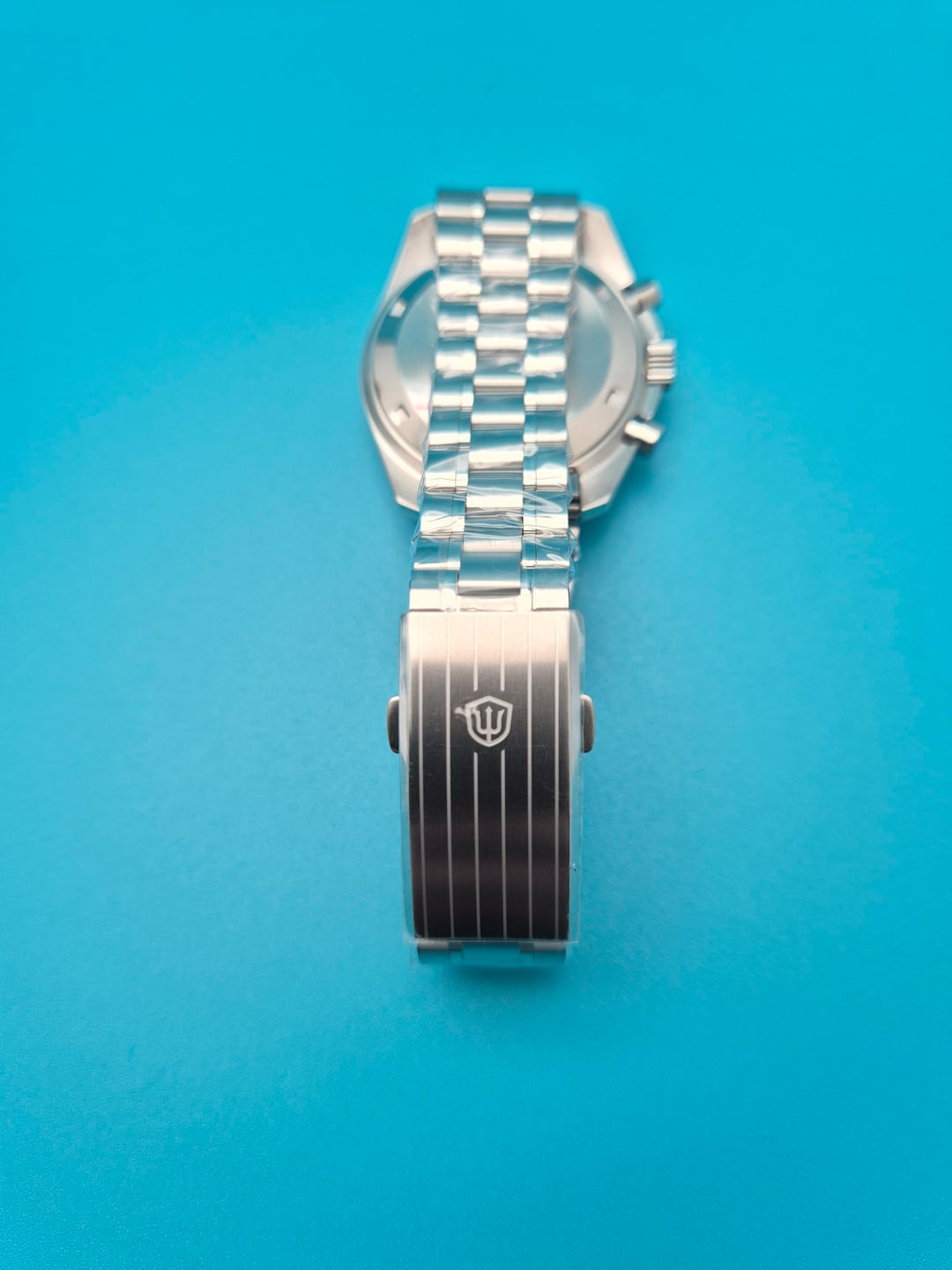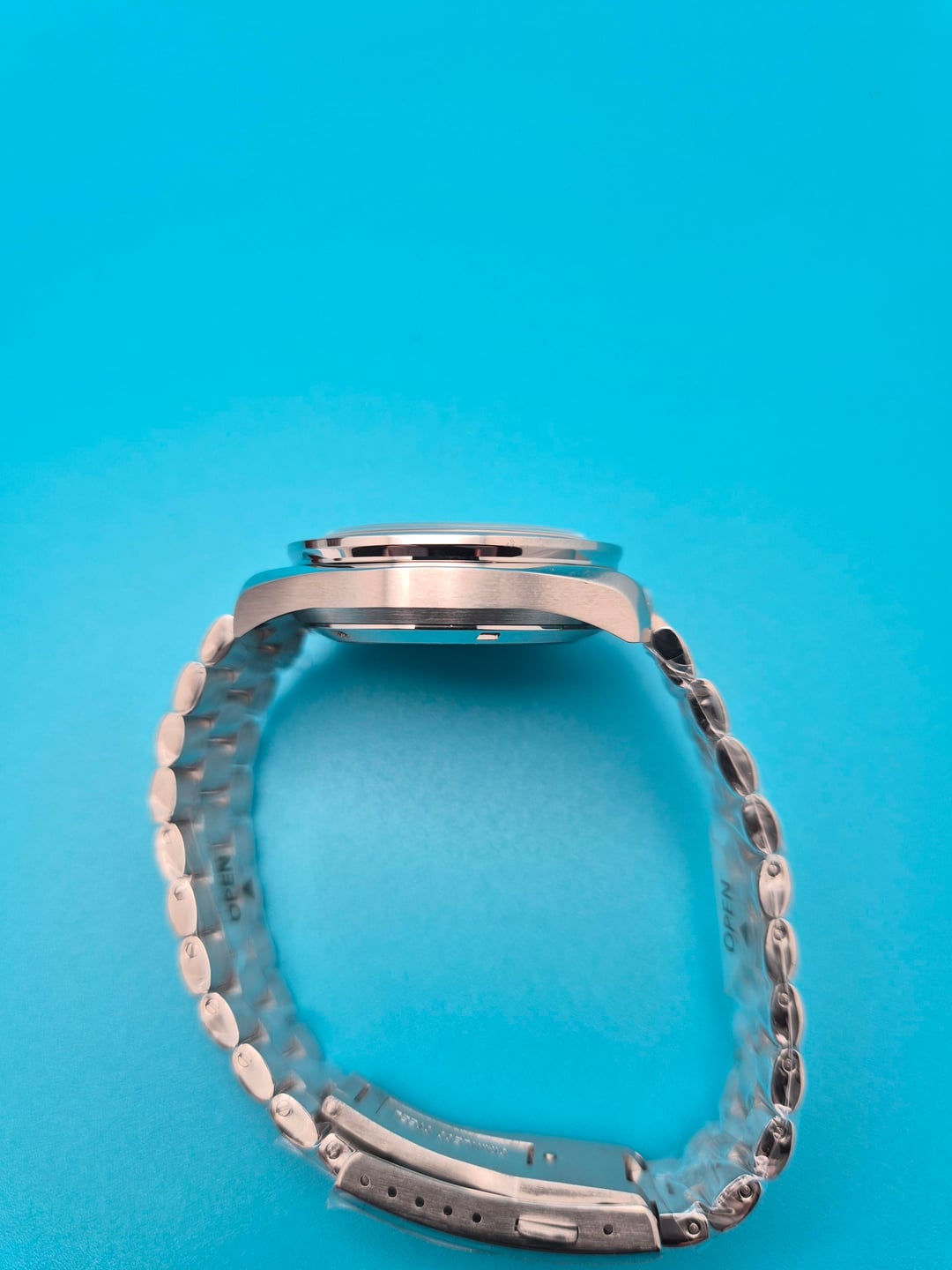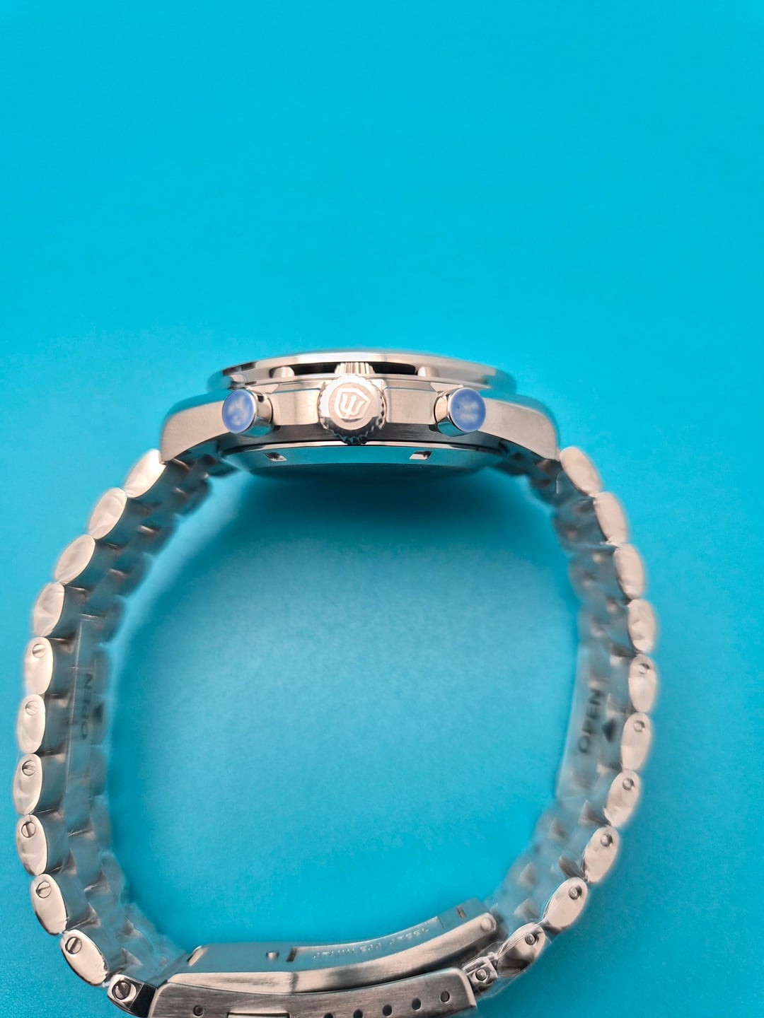 For sale is a modded Omega x Swatch Mission to the Moon Moonswatch. The dial and movement have been professionally transplanted into a Watchdives 1863 stainless steel case with a sapphire crystal. This upgrade gives the watch a significantly more premium feel while preserving the iconic Moonswatch aesthetic. Package Includes: Watchdives stainless steel bracelet, Mission to the Moon box and papers, Mission to the Moon velcro strap. Extra battery. Price: $550, free shipping within CONUS Payment: PayPal F&F, Venmo F&F and Zelle No trades at this time Feel free to reach out with any questions.