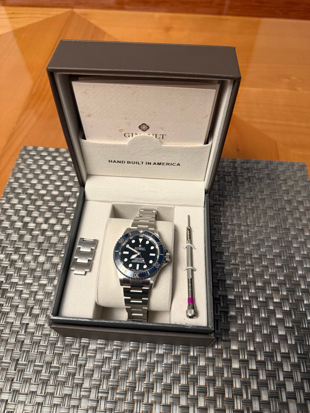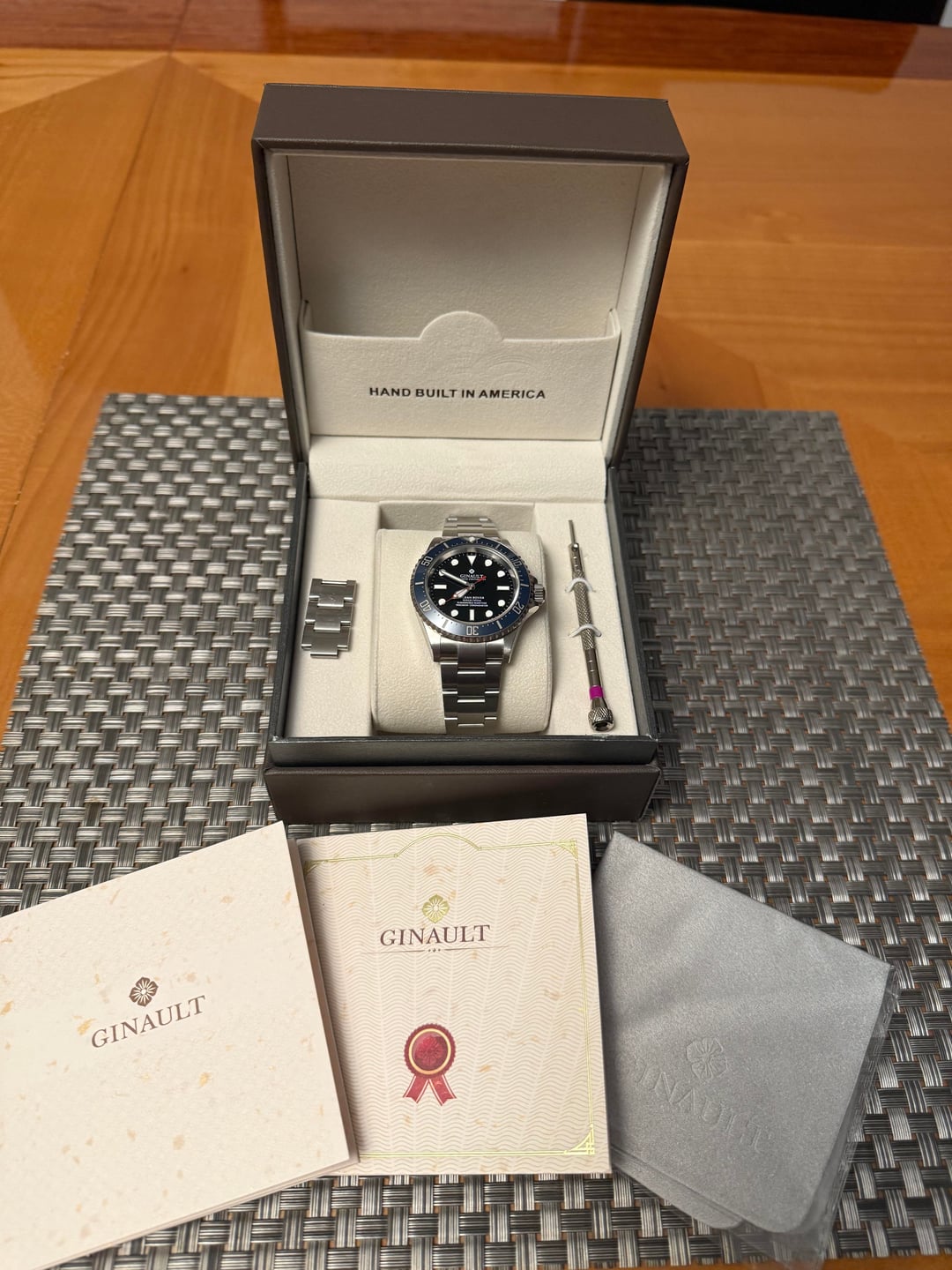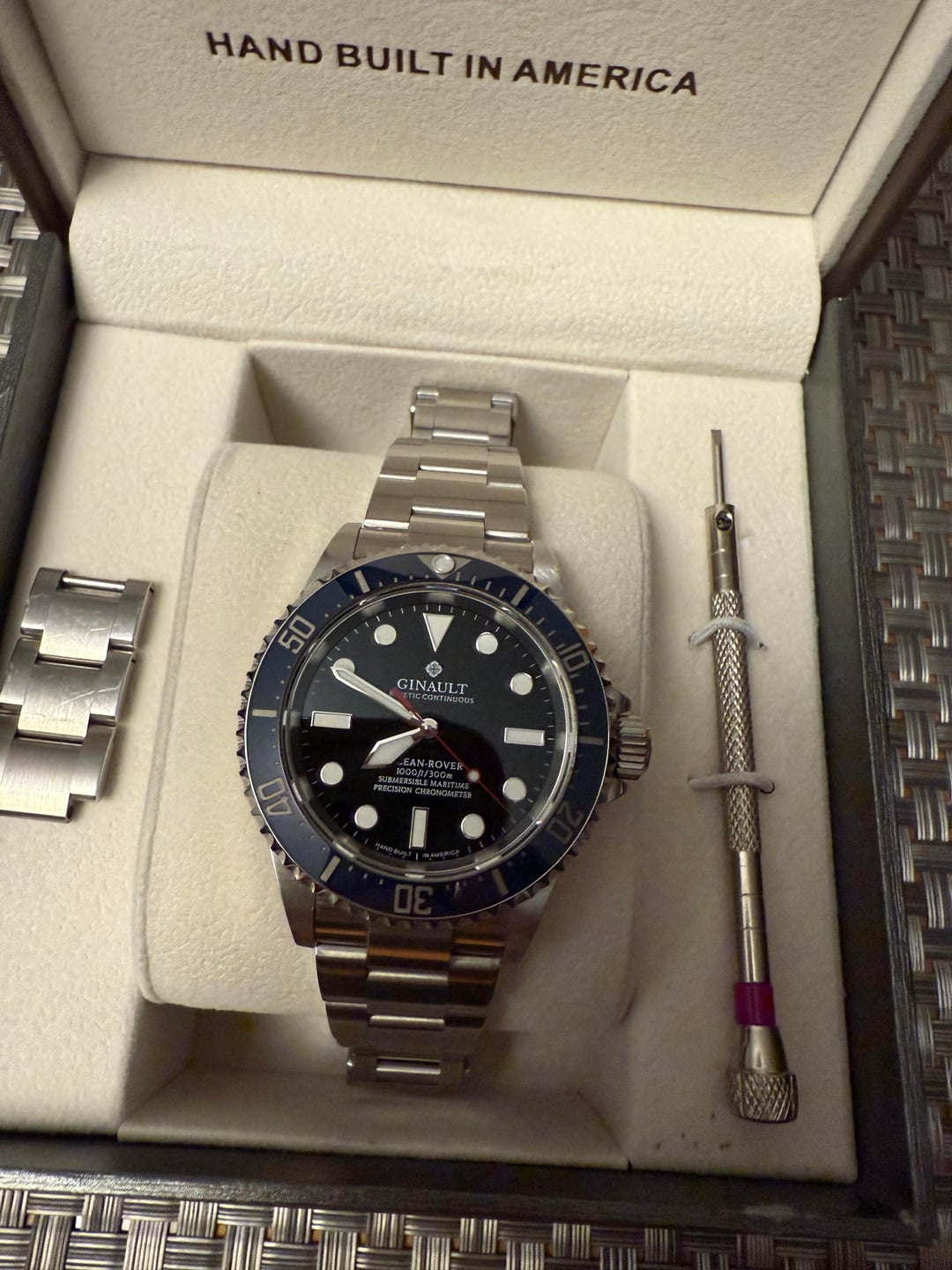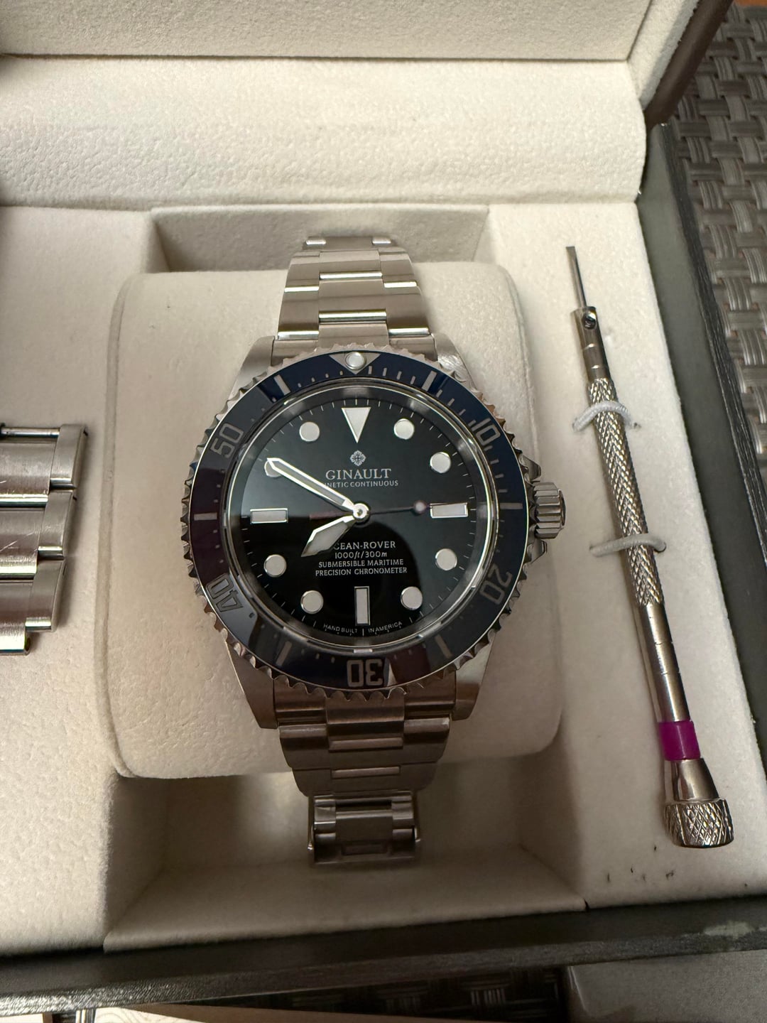 For sale is the Ginault Ocean Rover 2.5 with no date and the blue bezel option dated 2024. These are far and away the highest quality homages I’ve ever seen. Bezel is crisp, case is thin, sapphire has excellent AR coating, the glidelock clasp is snappy, and the movement is regulated to unbelievable timekeeping for an automatic watch. Condition: Crystal and bezel are pristine, but the bracelet and clasp are scratched up and well worn. Price: $1,099 shipped CONUS. Zelle strongly preferred. Full kit: Watch, extra links, microfiber cloth, card dated 2024, movement regulation report, box, and sleeve. Message me with any questions, but please leave a comment first so I can see your flair. Thanks for looking!