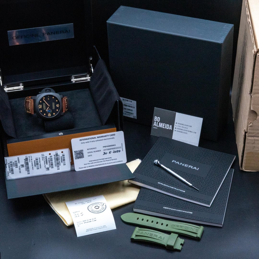 [https://www.dropbox.com/scl/fo/hin1lti7i7c7awwi5atew/ADl6n2sAHf2ITnp3LcQtObc?rlkey=x5a43pg771kmikunbw0cnljba&st=m0jv7unc&dl=0](https://www.dropbox.com/scl/fo/hin1lti7i7c7awwi5atew/ADl6n2sAHf2ITnp3LcQtObc?rlkey=x5a43pg771kmikunbw0cnljba&st=m0jv7unc&dl=0) **PAM 00661 LUMINOR MARINA 1950 CARBOTECH 3 DAYS AUTOMATIC - 44MM - BOX AND PAPERS** **.** The PAM 661 was the second Luminor watch to feature the Carbotech composite case material, and it remains one of the most distinctive pieces in the entire collection, especially at its price point. Here is one of the most recently dated examples I have seen on the open market, under full factory warranty! **.** * **Reference: PAM 00661 | PAM 661** * **44mm Carbotech case (carbon fiber composite)** * **Calibre P.9010 automatic movement, 72-hour power reserve** * **MSRP: 12,800 plus tax** **.** ***Contents*****:** Watch, triple box set, 2024 warranty card, manuals, serialized tags, tool, and 2x OEM straps (1x green rubber and 1x brown leather). ***Please note: Manufacturer warranty on this watch is valid until 03/2031!*** . **Condition:** Excellent, near mint condition with light wear on the leather strap and tang. The photos in this album were taken using a macro setup to ensure an accurate representation of the watch's condition. This timepiece has been professionally pressure-tested and thoroughly validated to confirm all functions operate within factory specifications. . ***Price: $6,725.*** *Fully insured overnight shipping included in the US. Payment accepted via:* * *Bank Wire* * *Zelle* * *All major credit cards* . Please message me directly to confirm availability before marking sold! USAF veteran owned company with hundreds of successful deals done, and plenty of references available to any interested buyers. Thanks for looking! 🙏