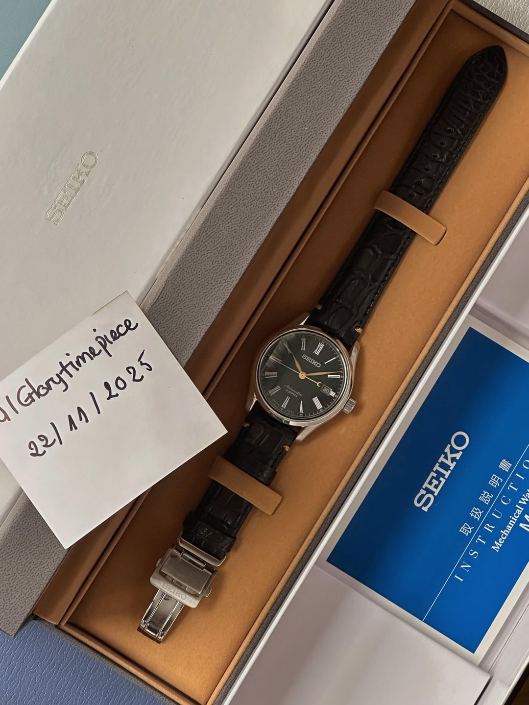 Hi, Its rare to have this example in full set and in this condition wide, totally unworn with stickers to cover the caseback and clasp. Everything about this watch is about the mesmerizing handmade urushi lacquer enamel black dial and genuine crocodile strap, pictures say it all ! It comes with double Seiko boxes, strap, clasp, papers. SARX029 has a case diameter of 40.5mm, a lug-to-lug distance of approximately 47mm, and a thickness of 12mm. Timestamp & Album : https://www.flickr.com/photos/61327256@N05/albums/72177720330495906 Price : **$1111** + shipping ( UPS/FeDex from Asia, tariff covered by me) PayPal Friends & Family. Goods & Services available (+4.6%, buyer covers fee) Feel free to reach out via DM with any questions or for more photos. Thank you.